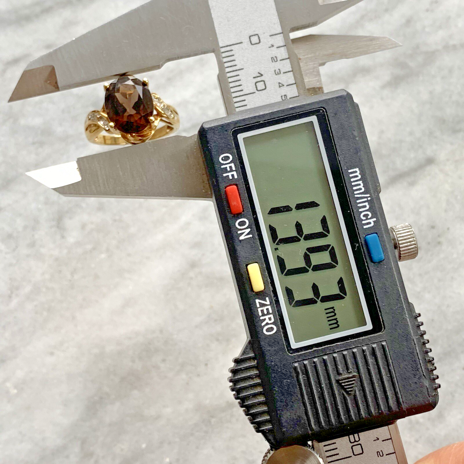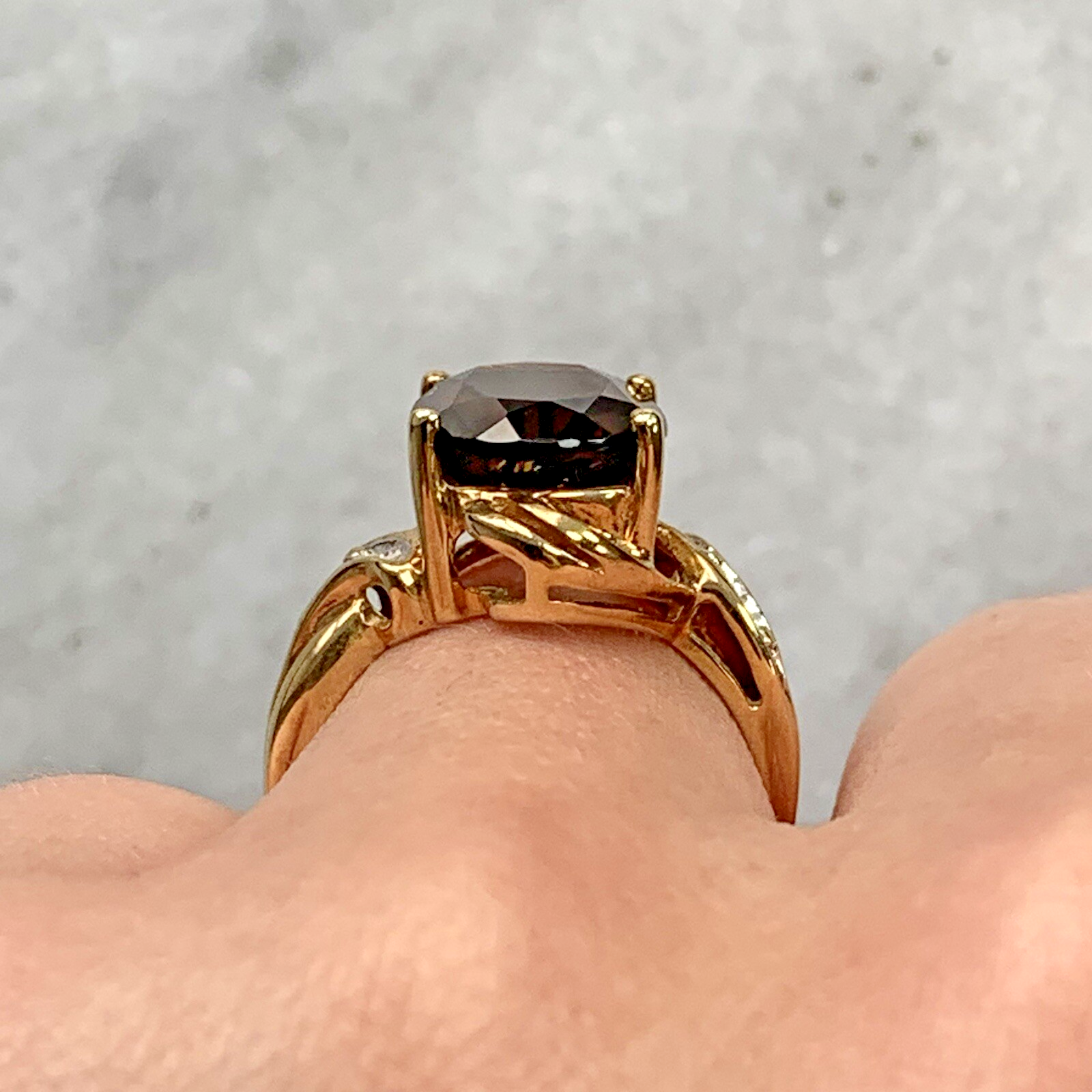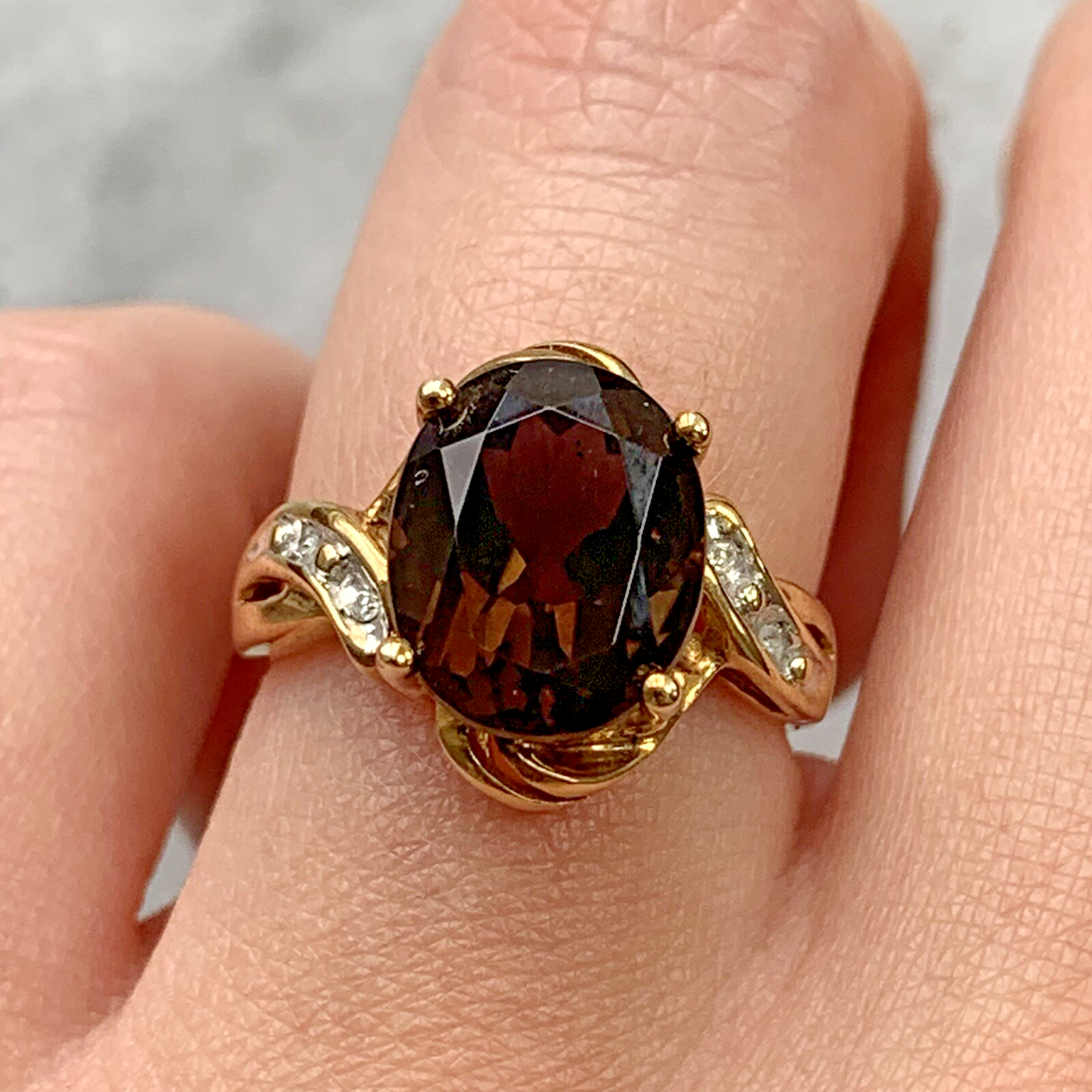 A beautiful ring featuring an oval cut rich coloured smoky quartz gemstone with twist shoulders that have diamond accents.