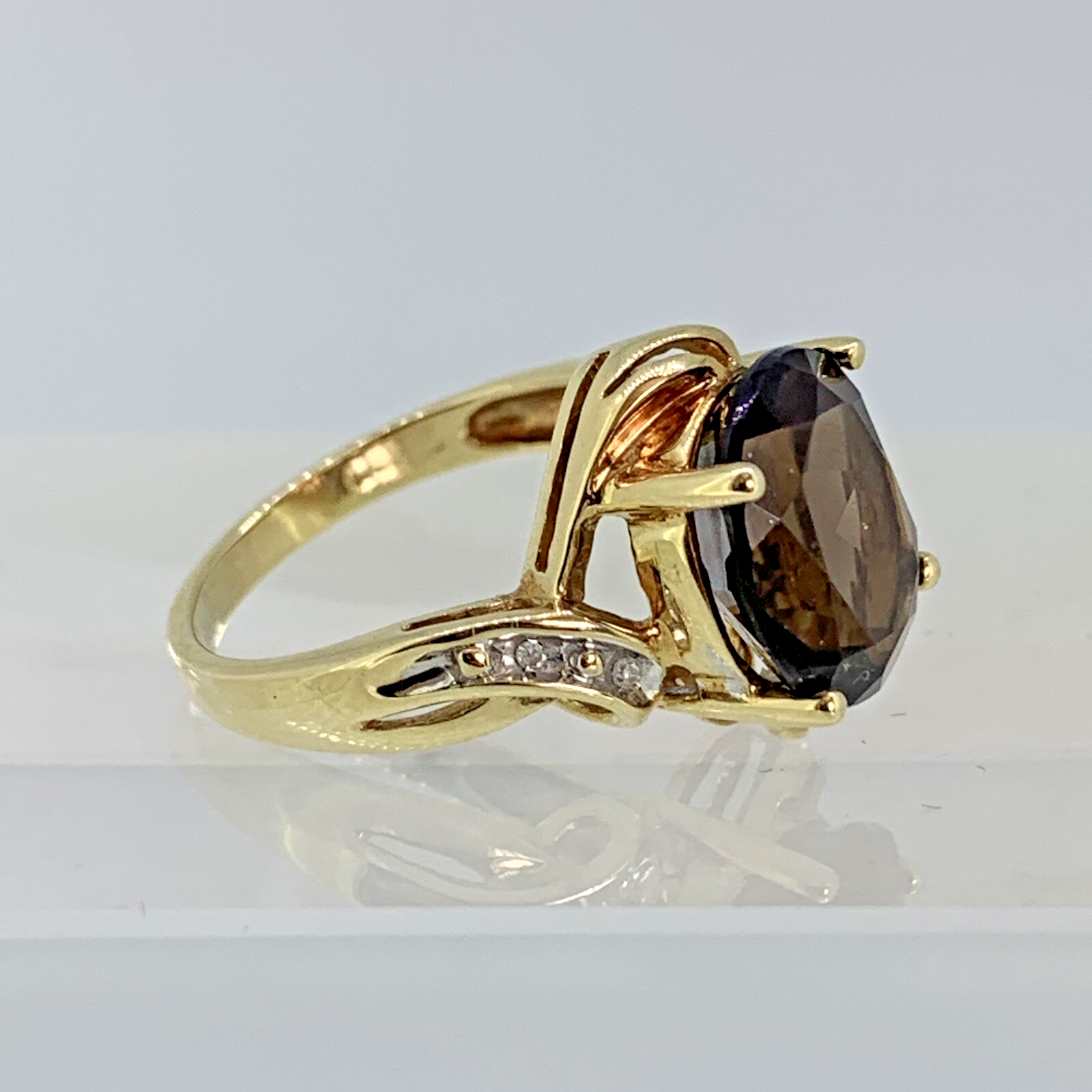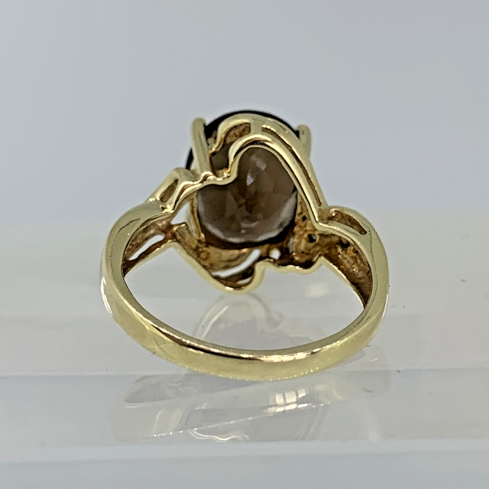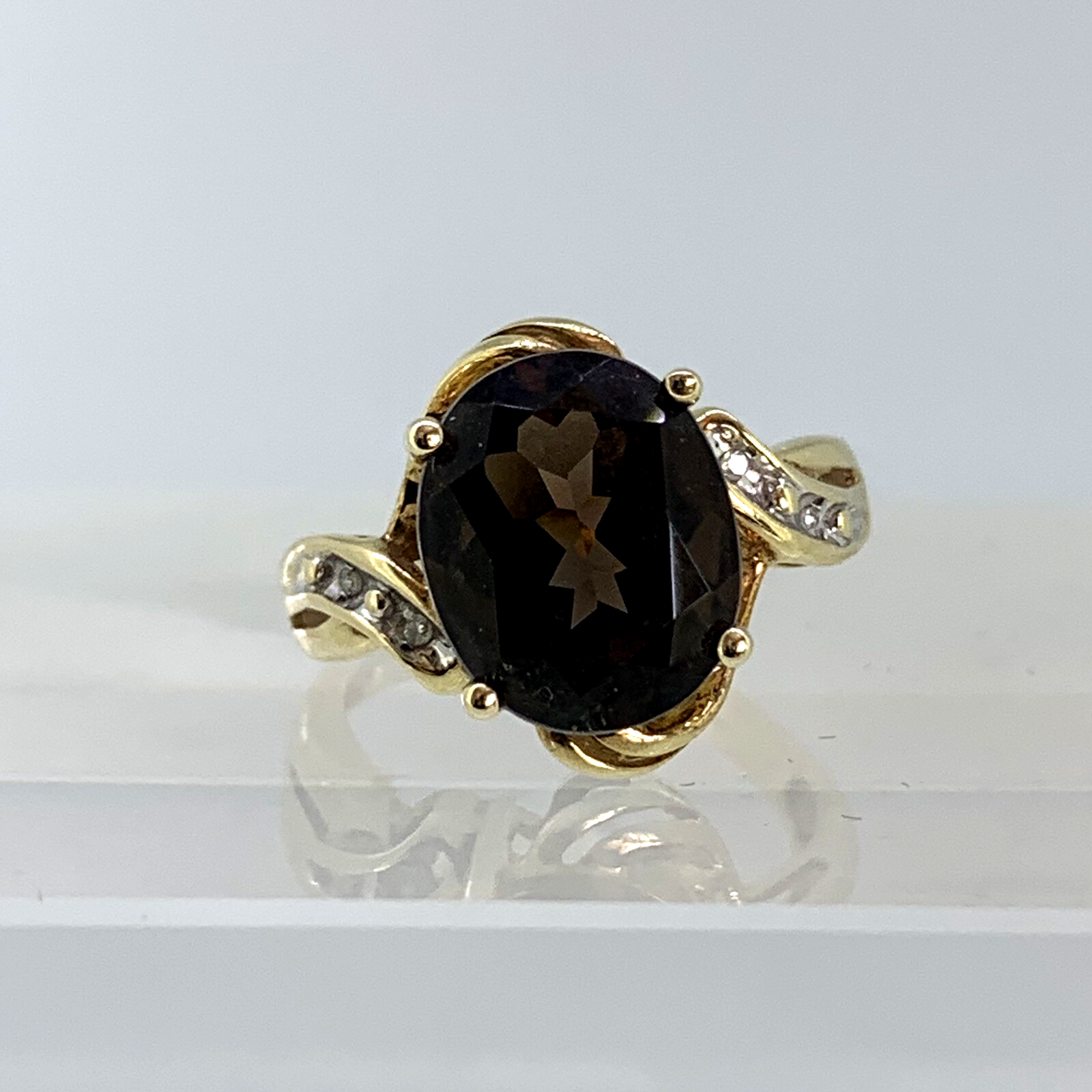 9 ct Gold Smoky Quartz & Diamond Twist Shoulder Ring 9ct 9K Yellow Gold - Size J