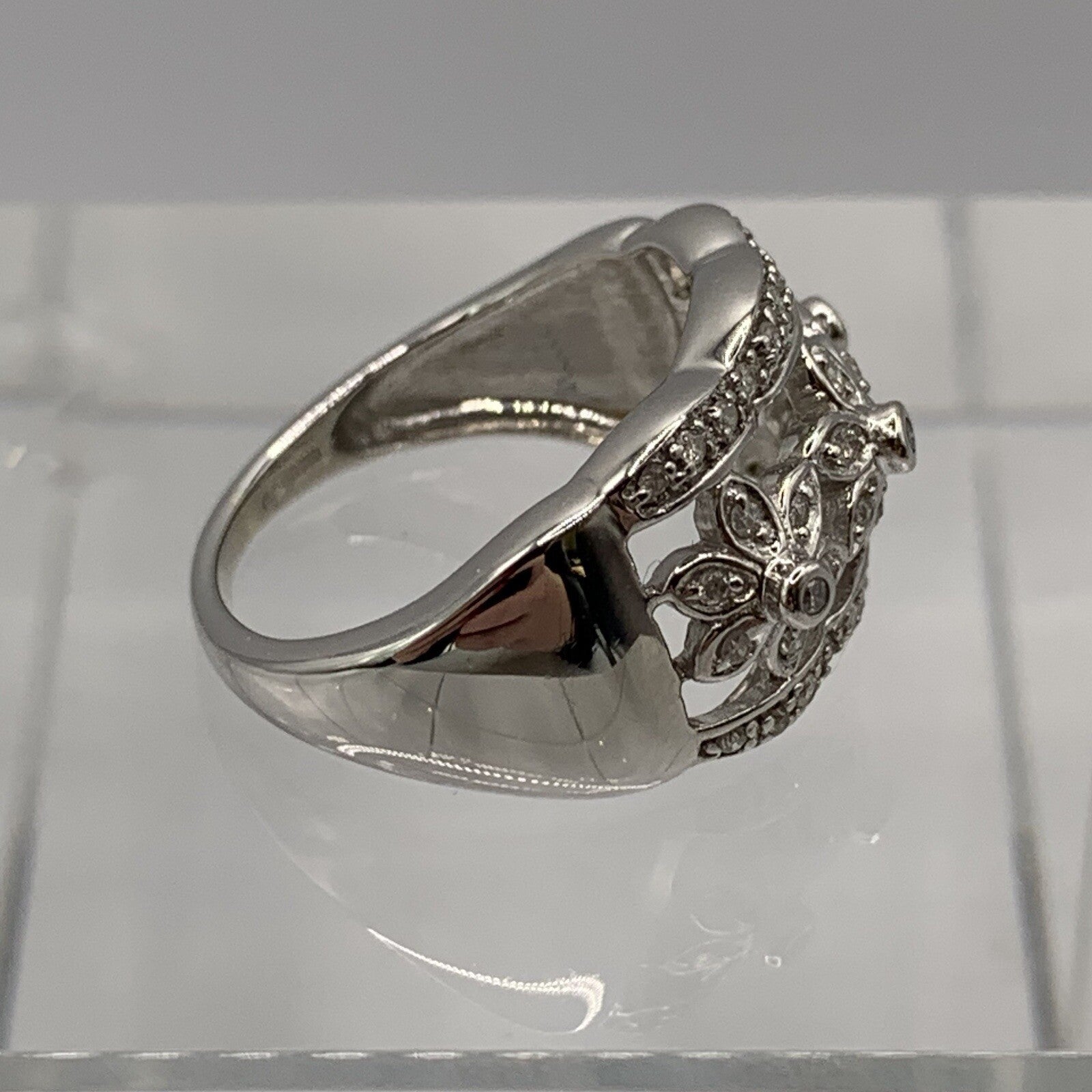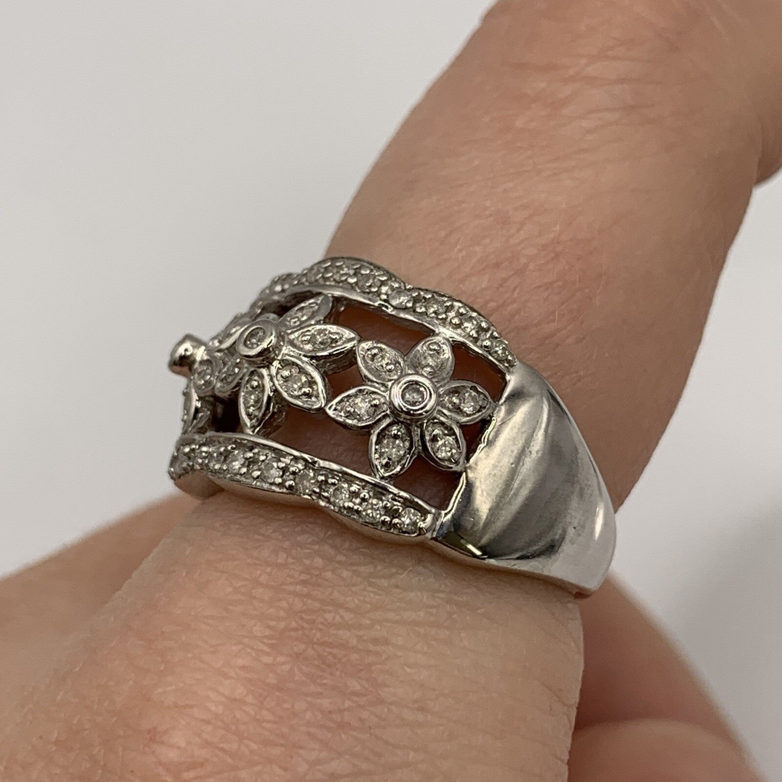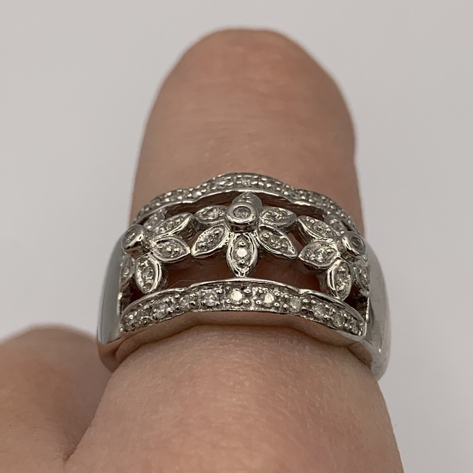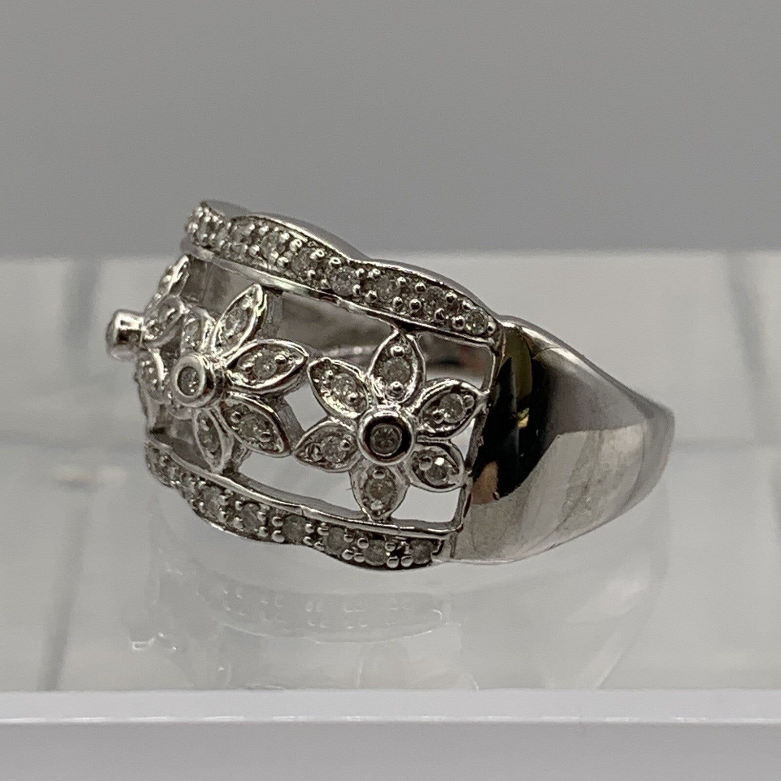 9 ct White Gold Diamond Ring Floral Cut Out Chunky Band 375 - Size N