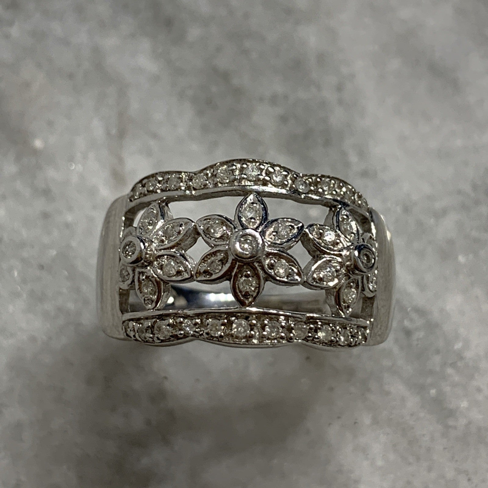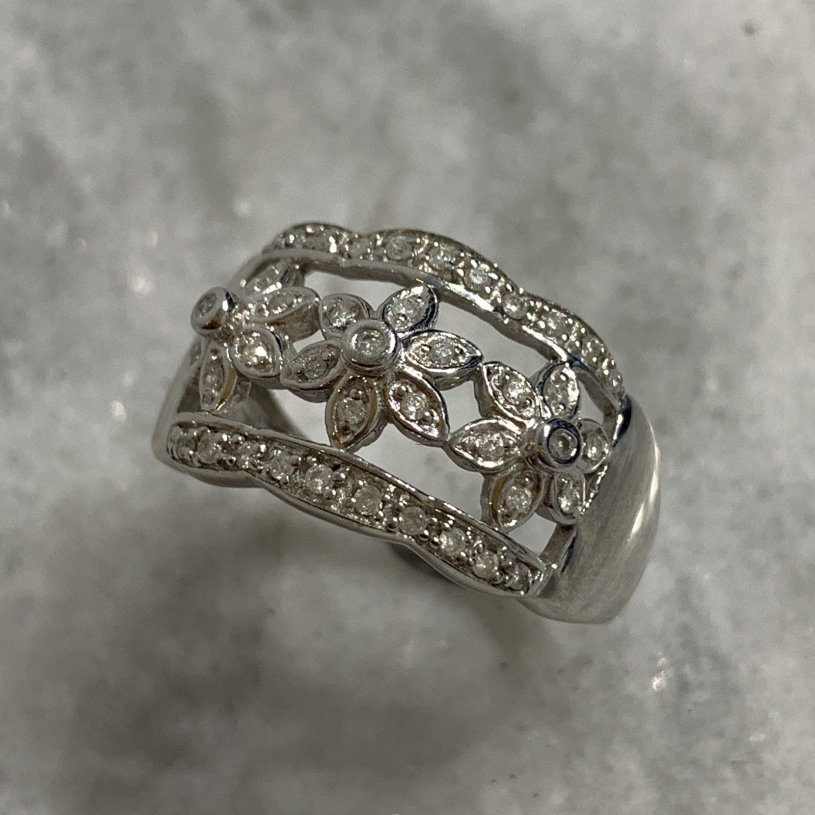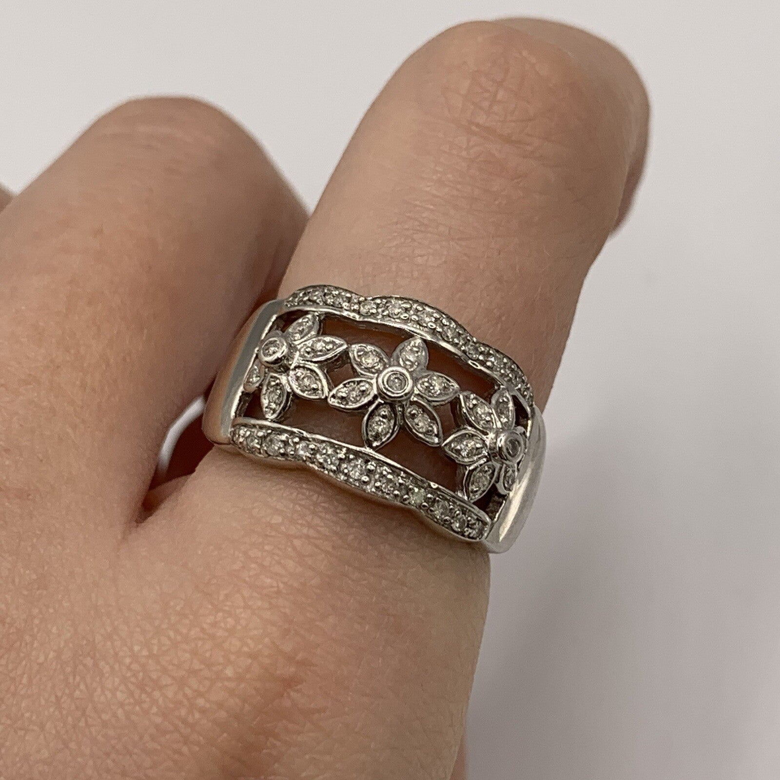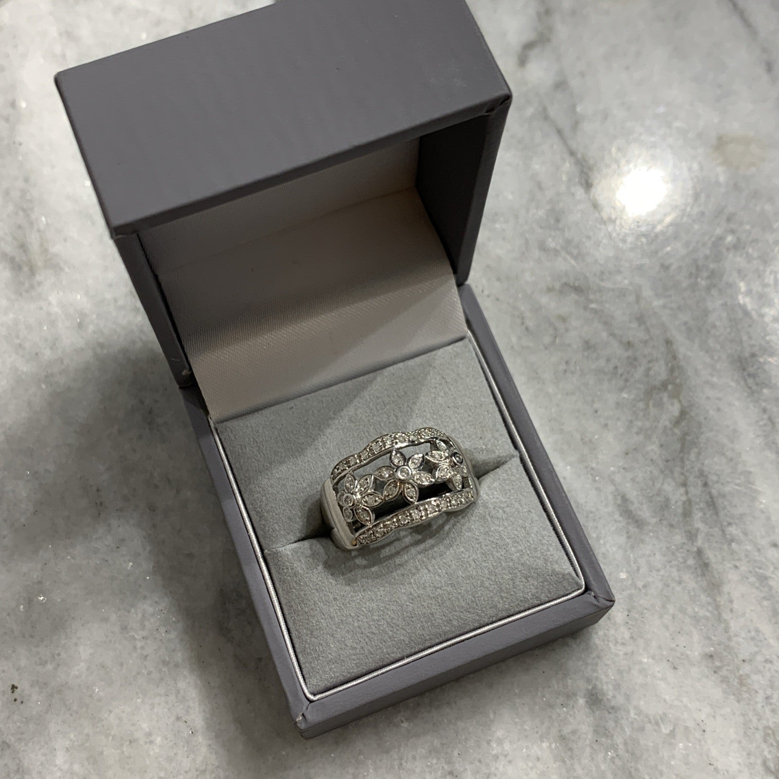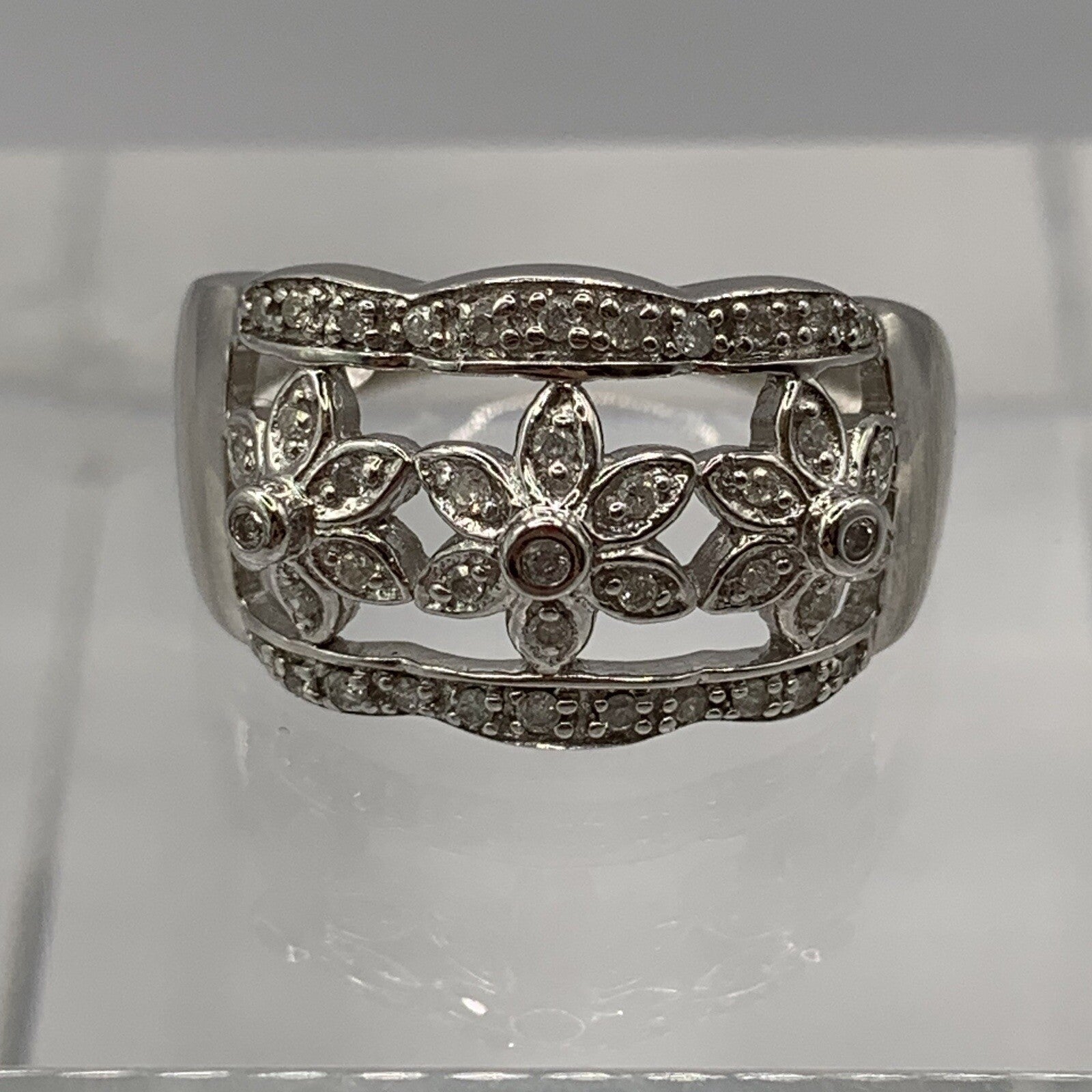 9 ct White Gold Diamond Ring Floral Cut Out Chunky Band 375 - Size N