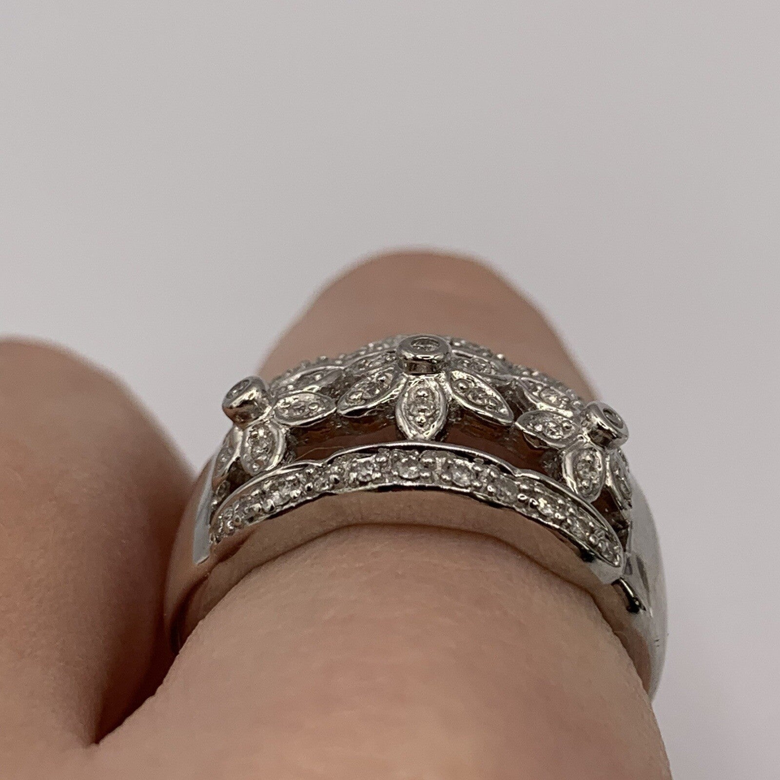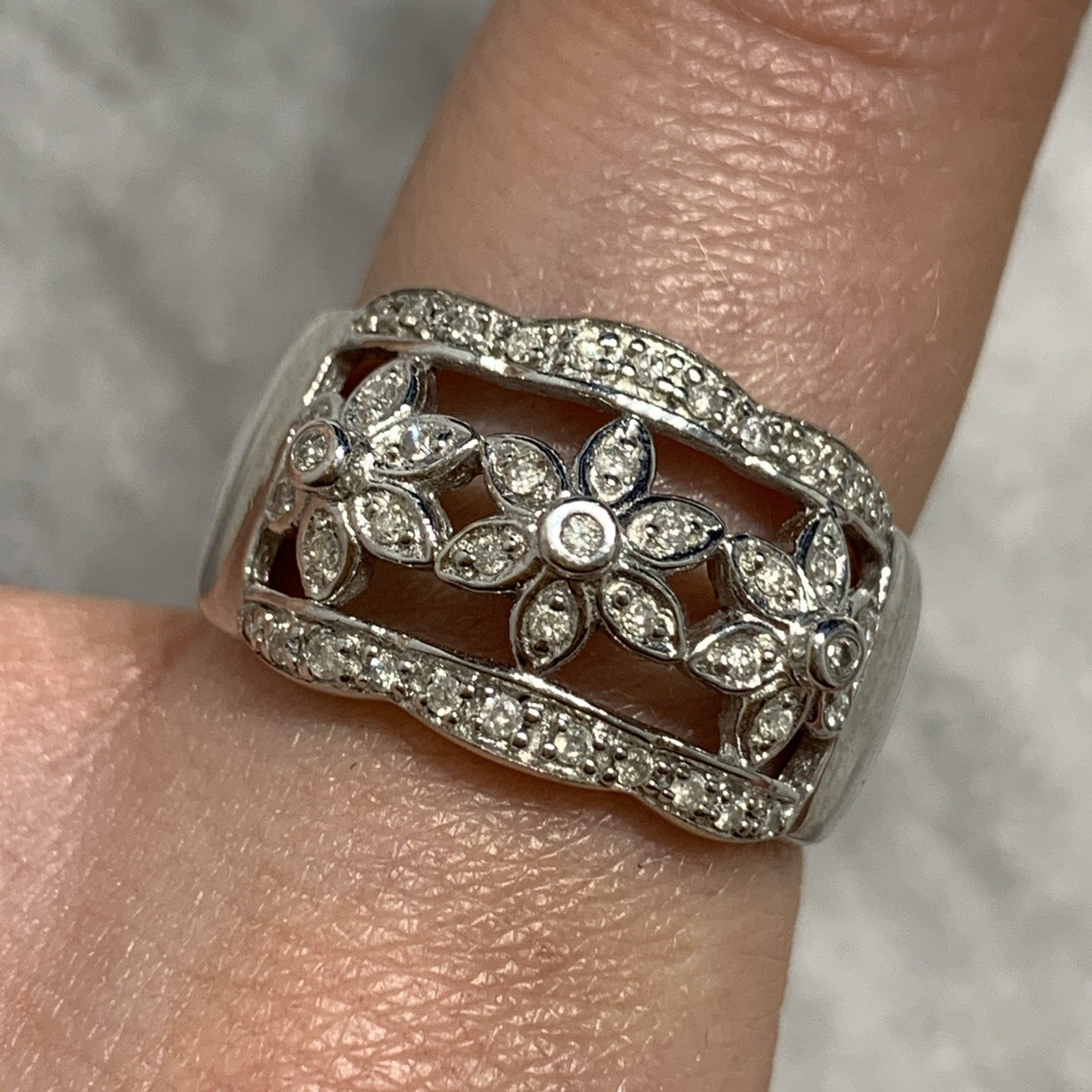 - A stunning chunky white gold band ring showcasing a trilogy of floral shaped clusters on petite pave set diamonds within a cut out section, accented by additional diamonds on the subtly scalloped edge.