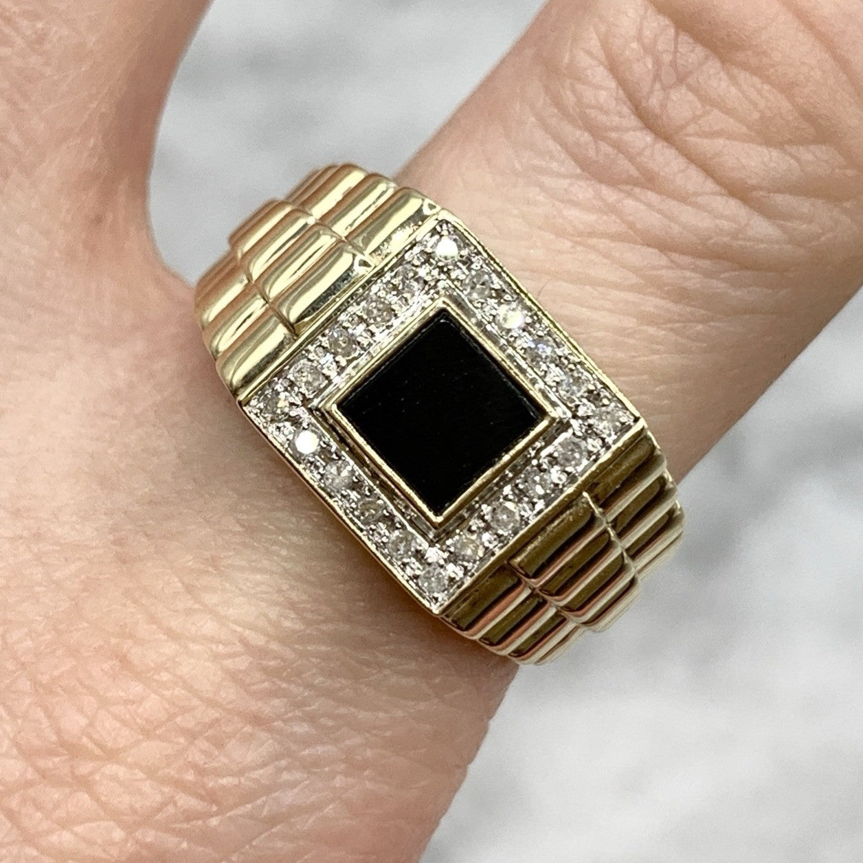 - A statement gent's gold ring showcasing a square cut black onyx slice, surrounded by petite natural diamonds.