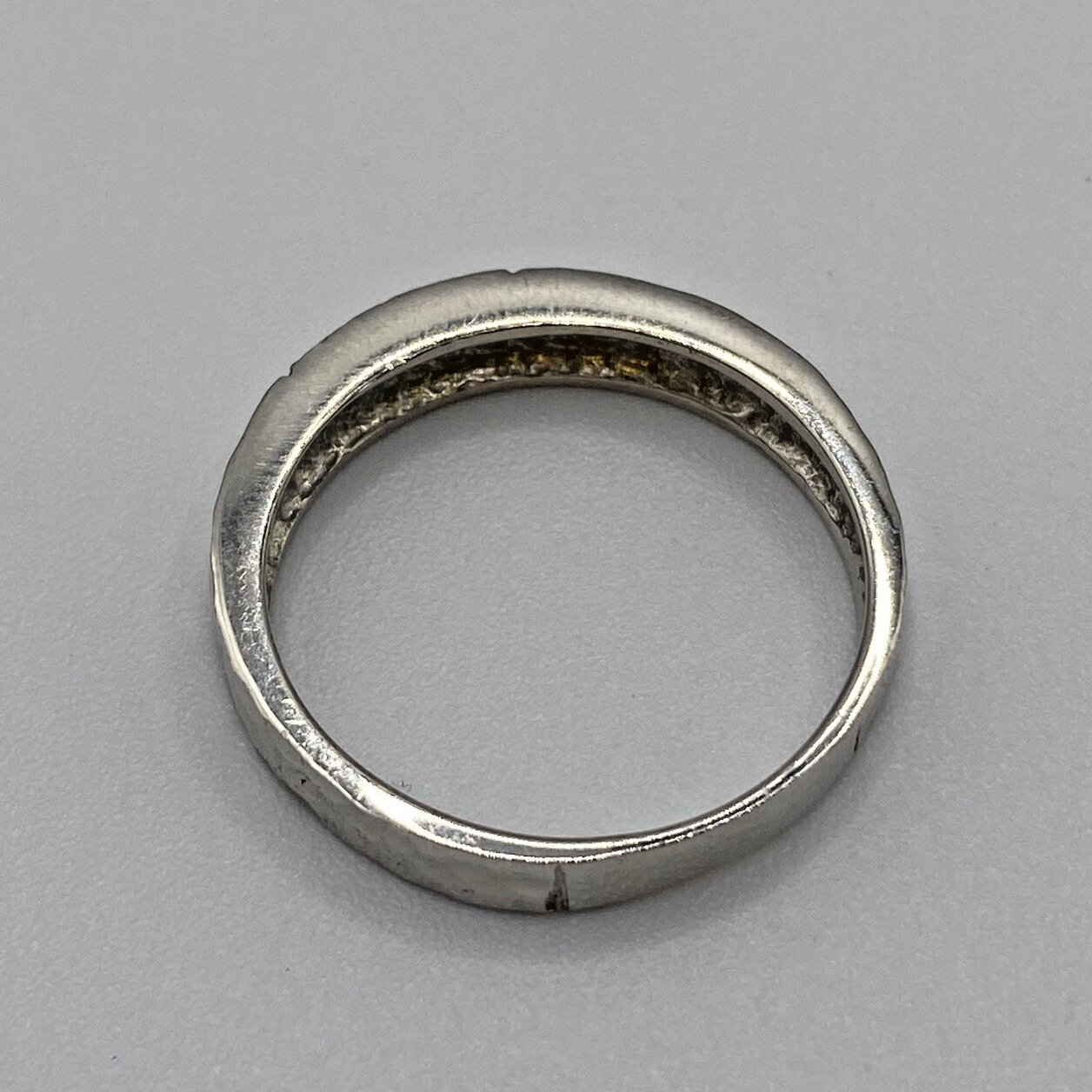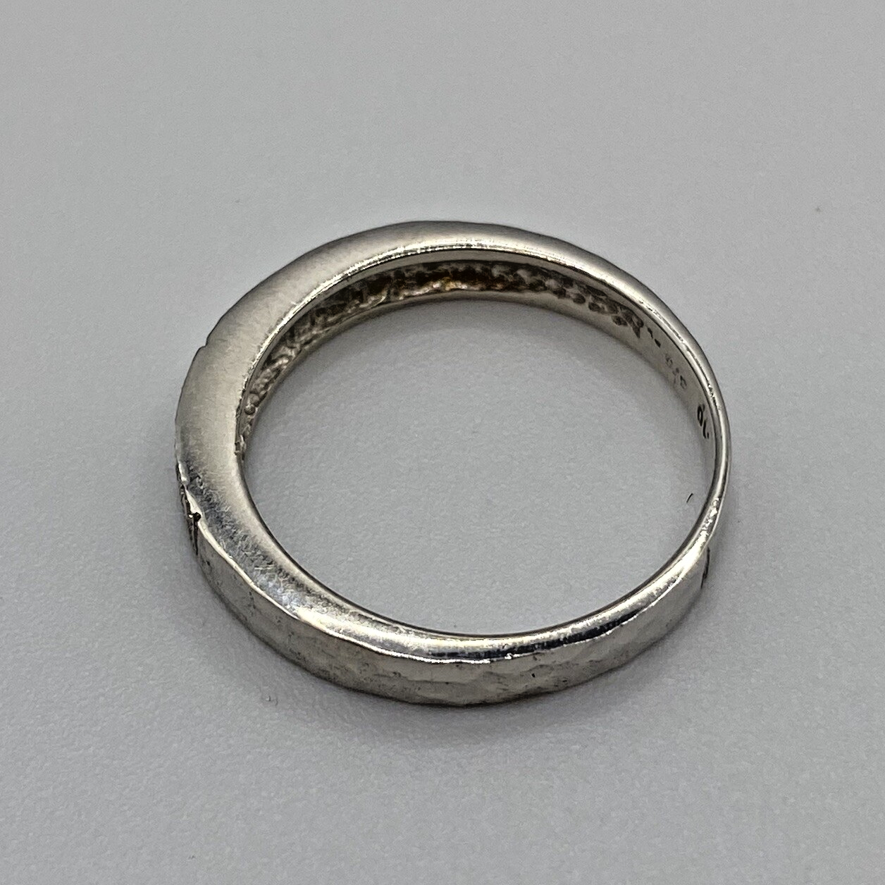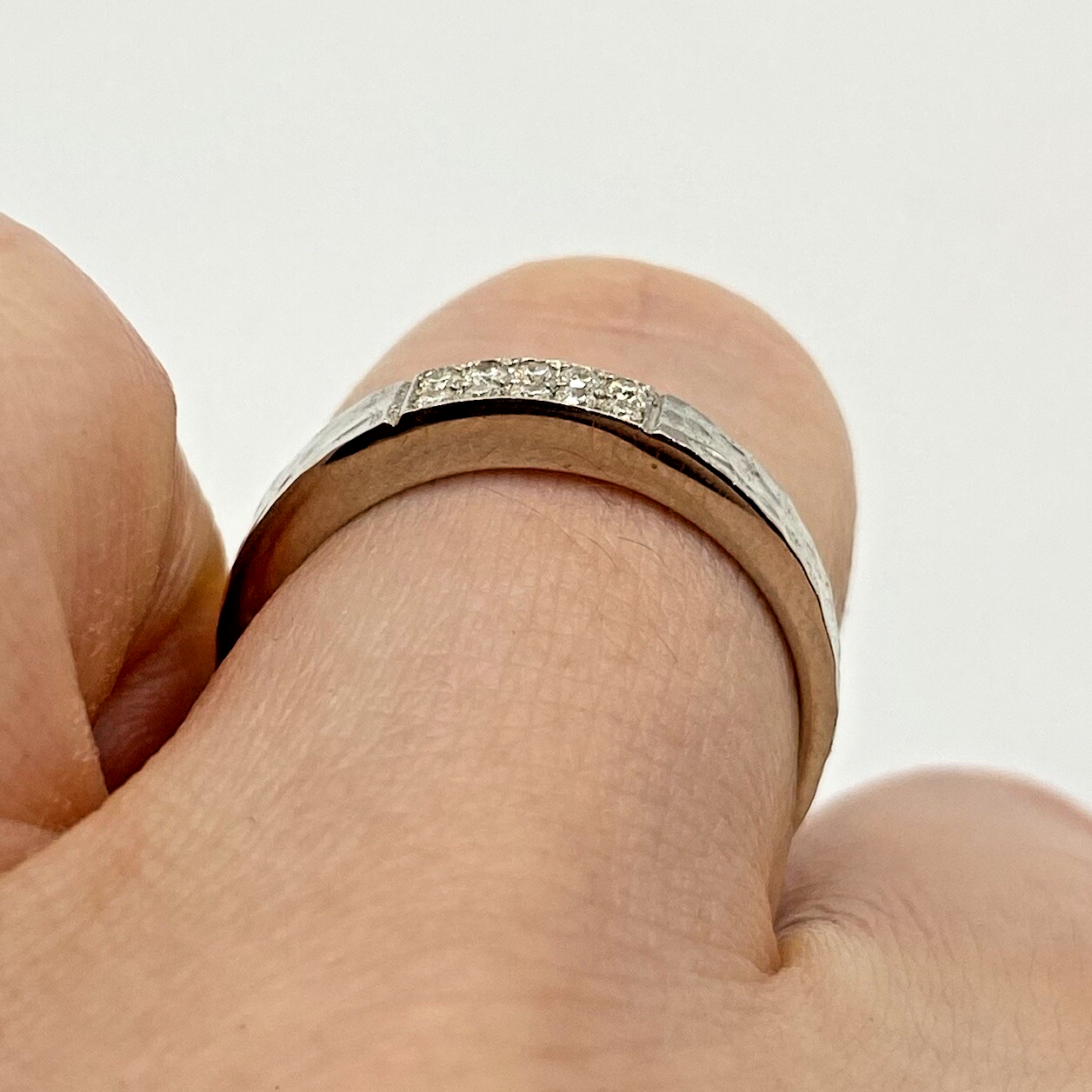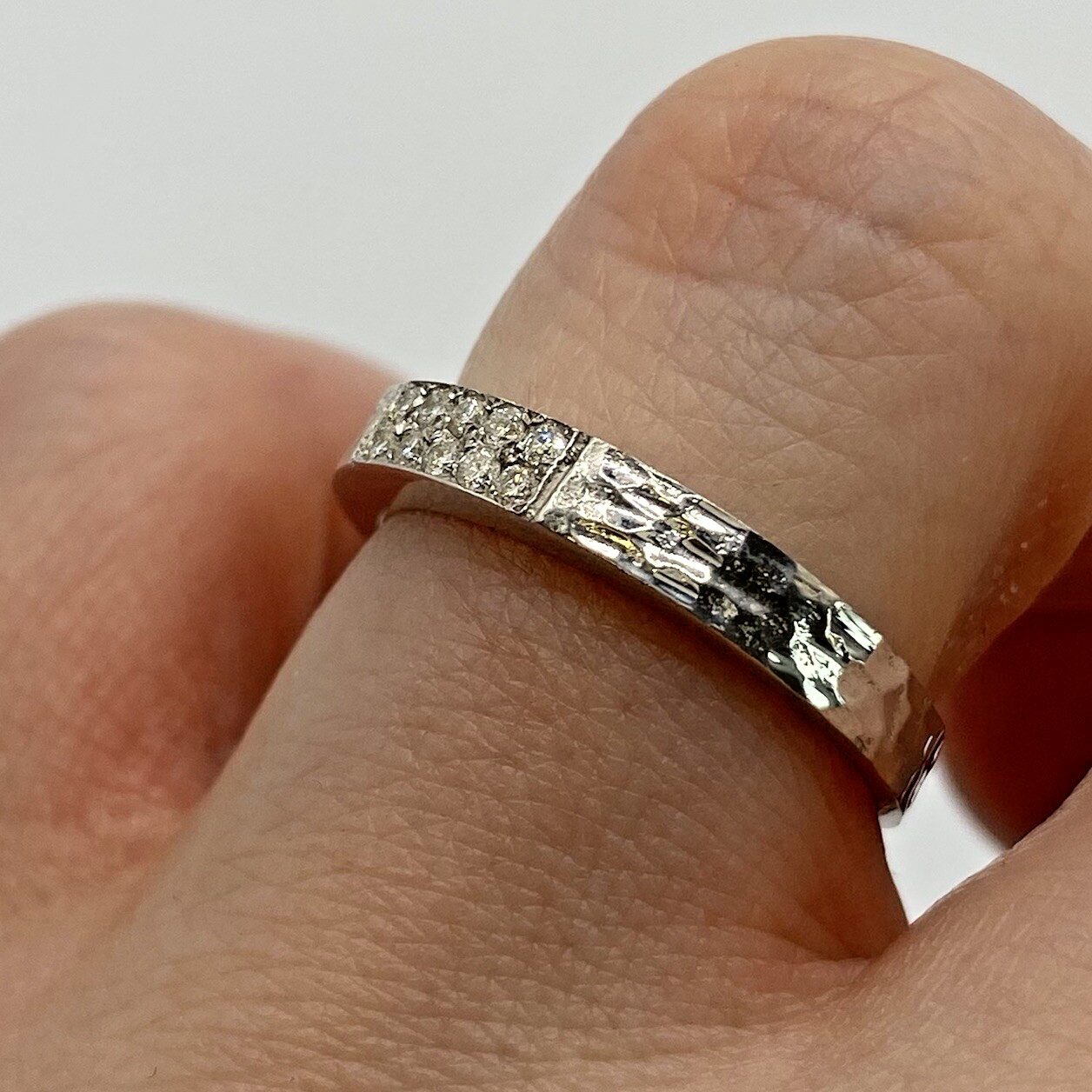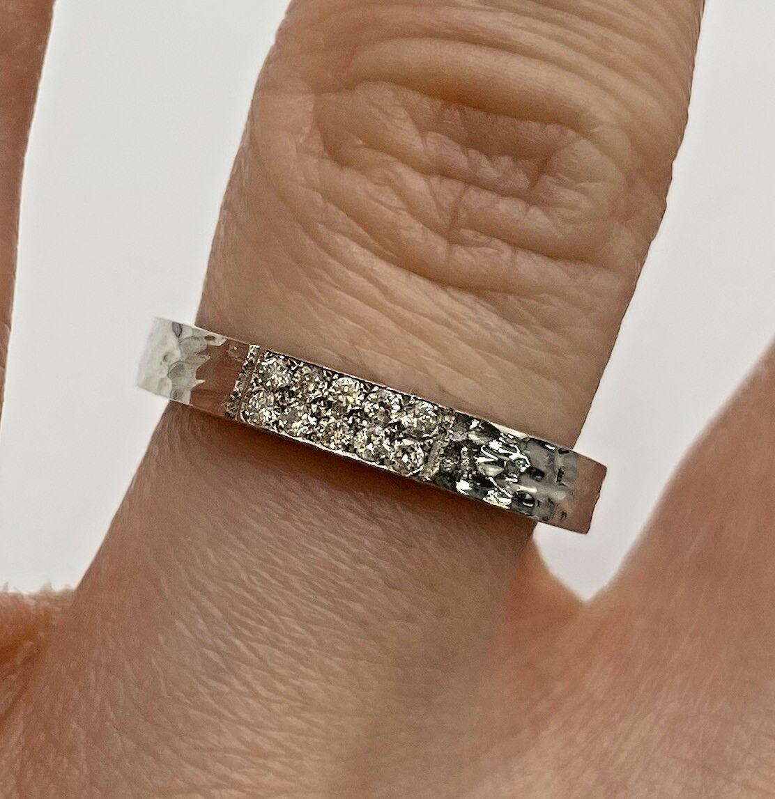 A lovely white gold band ring featuring ten round cut pave set diamonds, complete with hammered finishing on the shank.