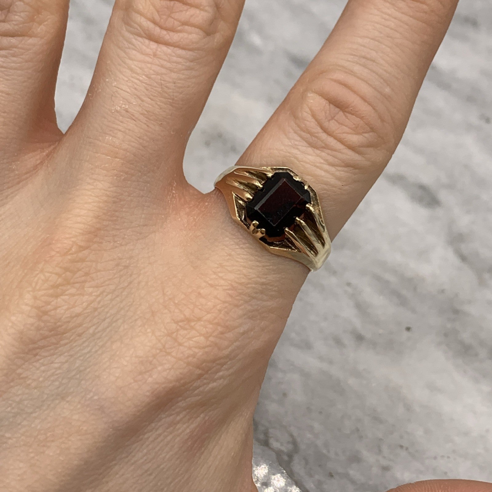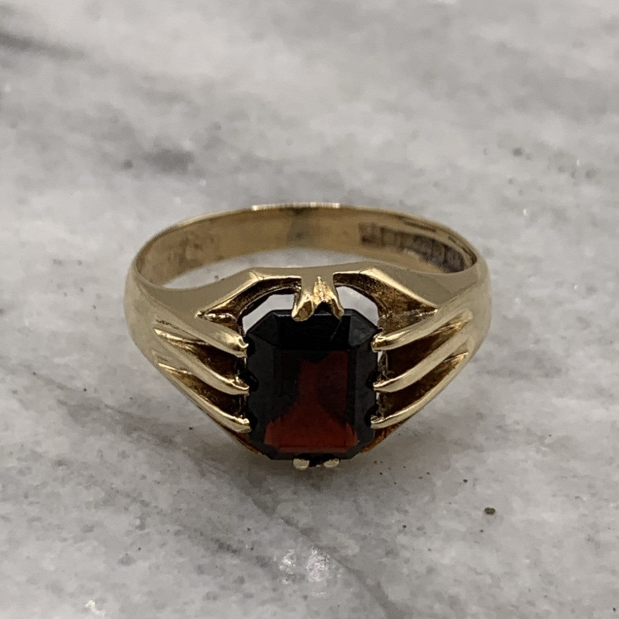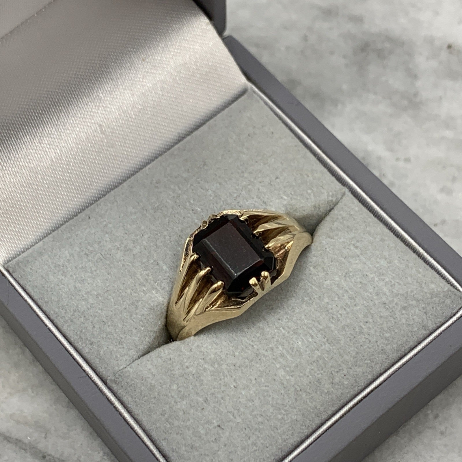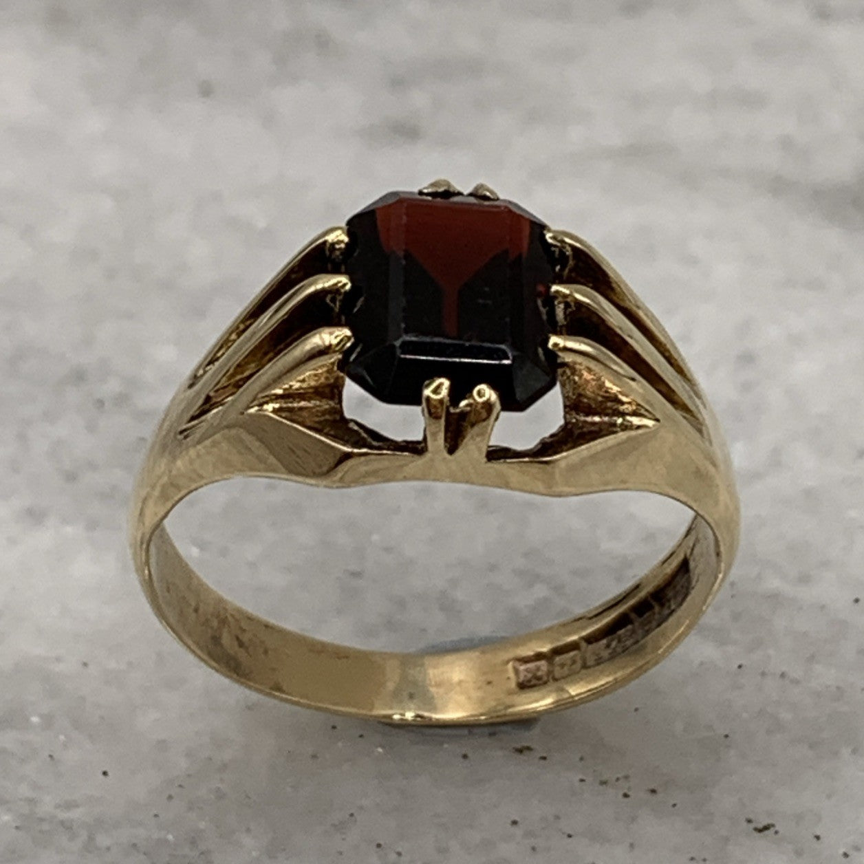9 ct Gold Garnet Solitaire Emerald Cut Claw Ring 375 9k Yellow Gold - Size O