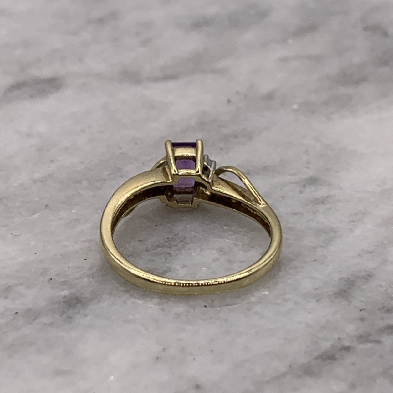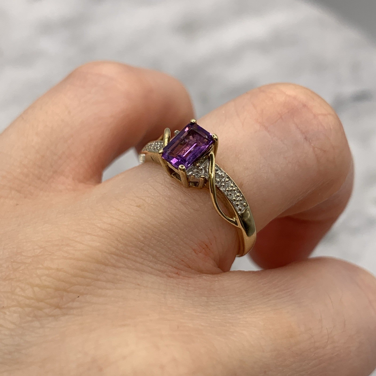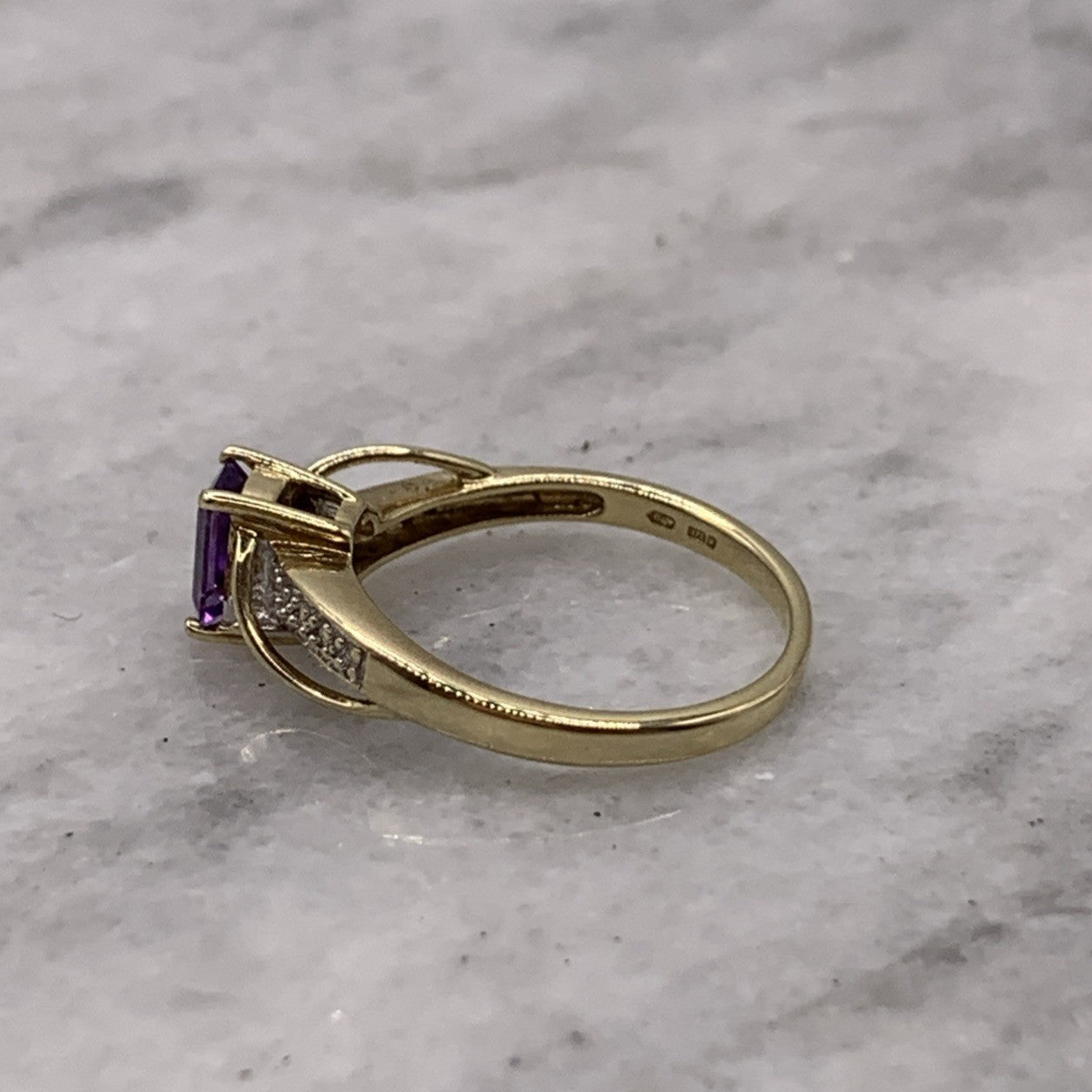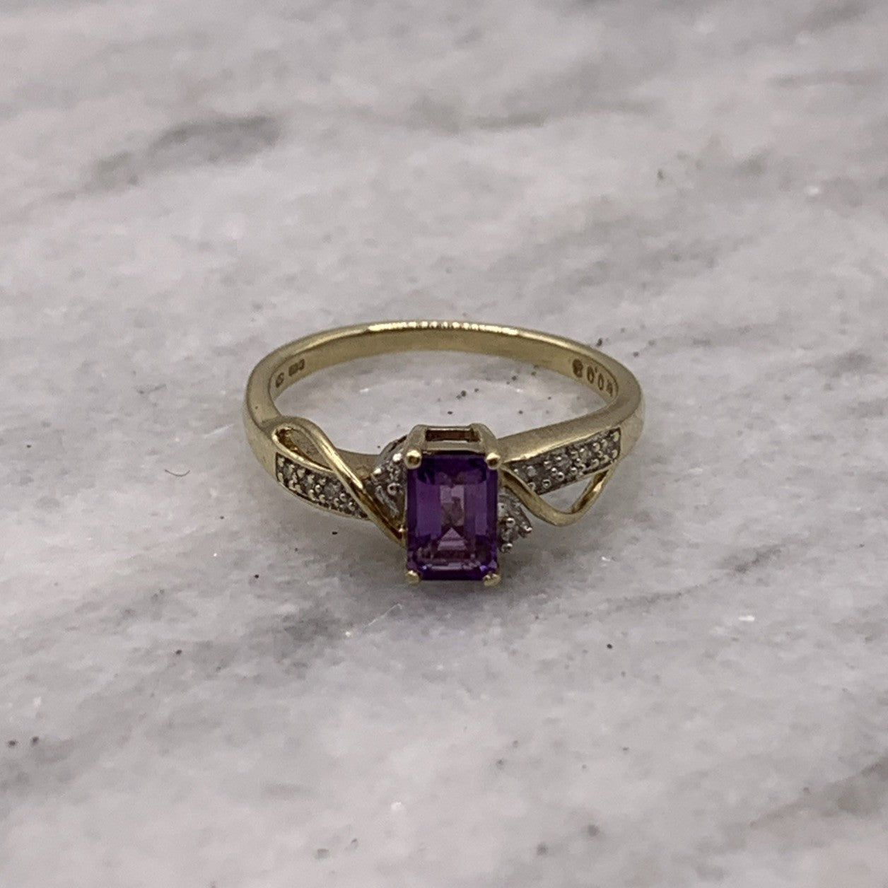 9ct Gold Ring Amethyst & Diamond Emerald Cut Twist Shoulder Yellow Gold - Size M