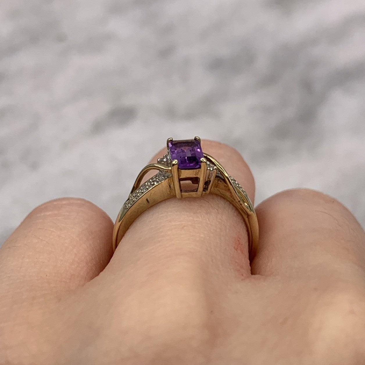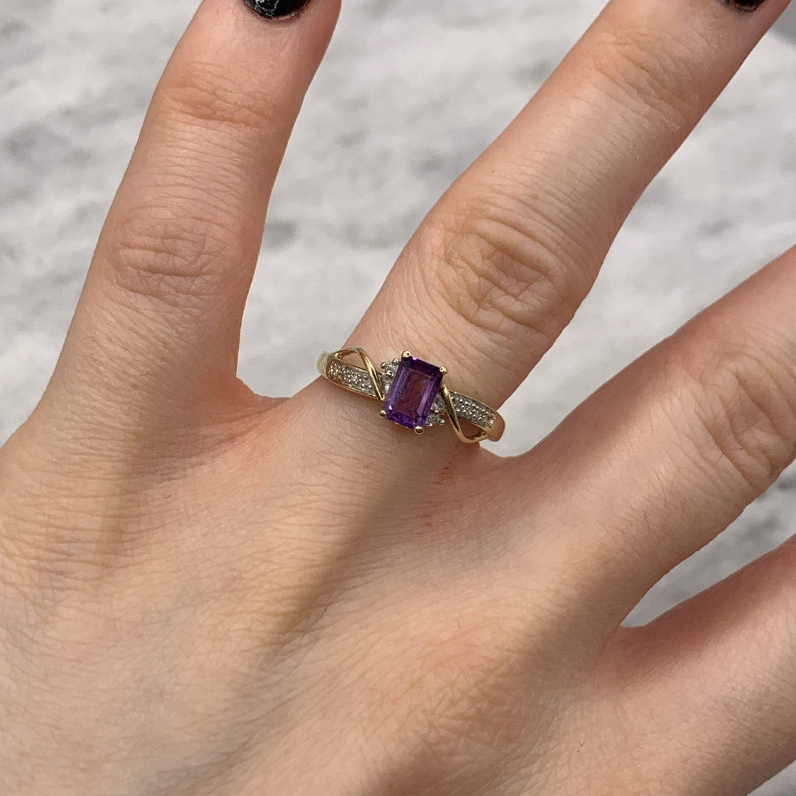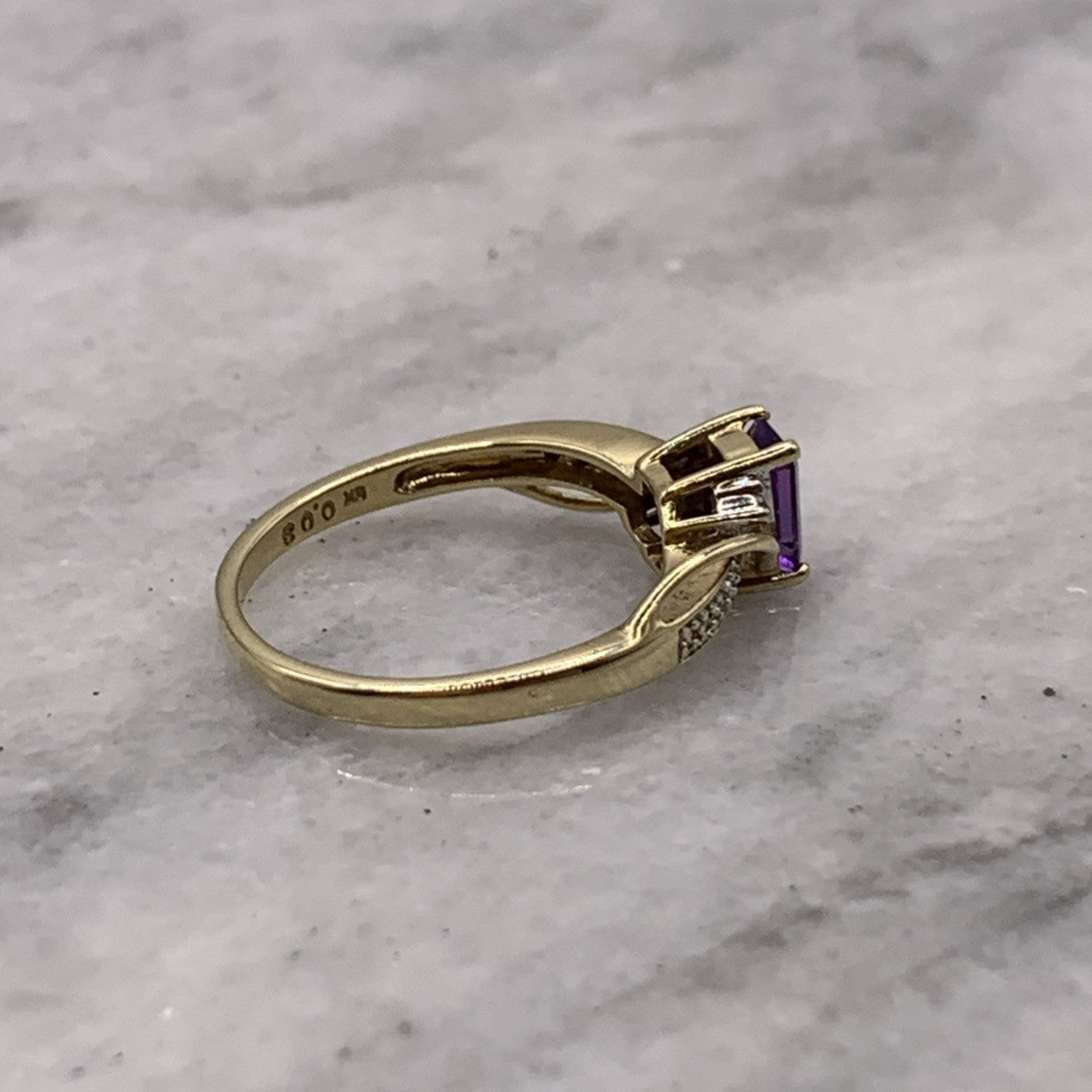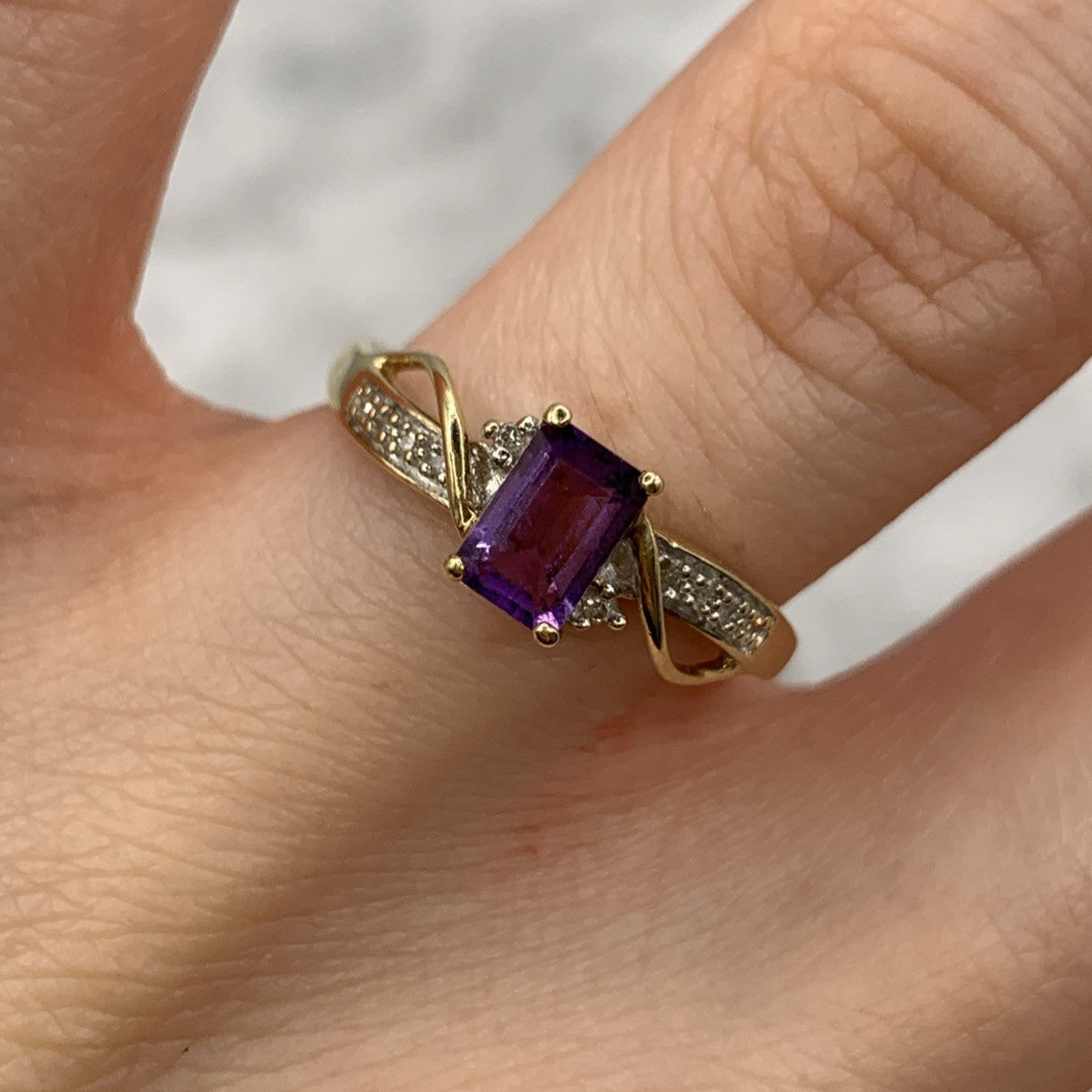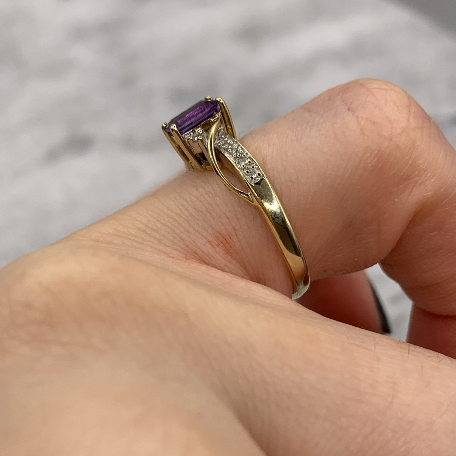 9ct Gold Ring Amethyst & Diamond Emerald Cut Twist Shoulder Yellow Gold - Size M
