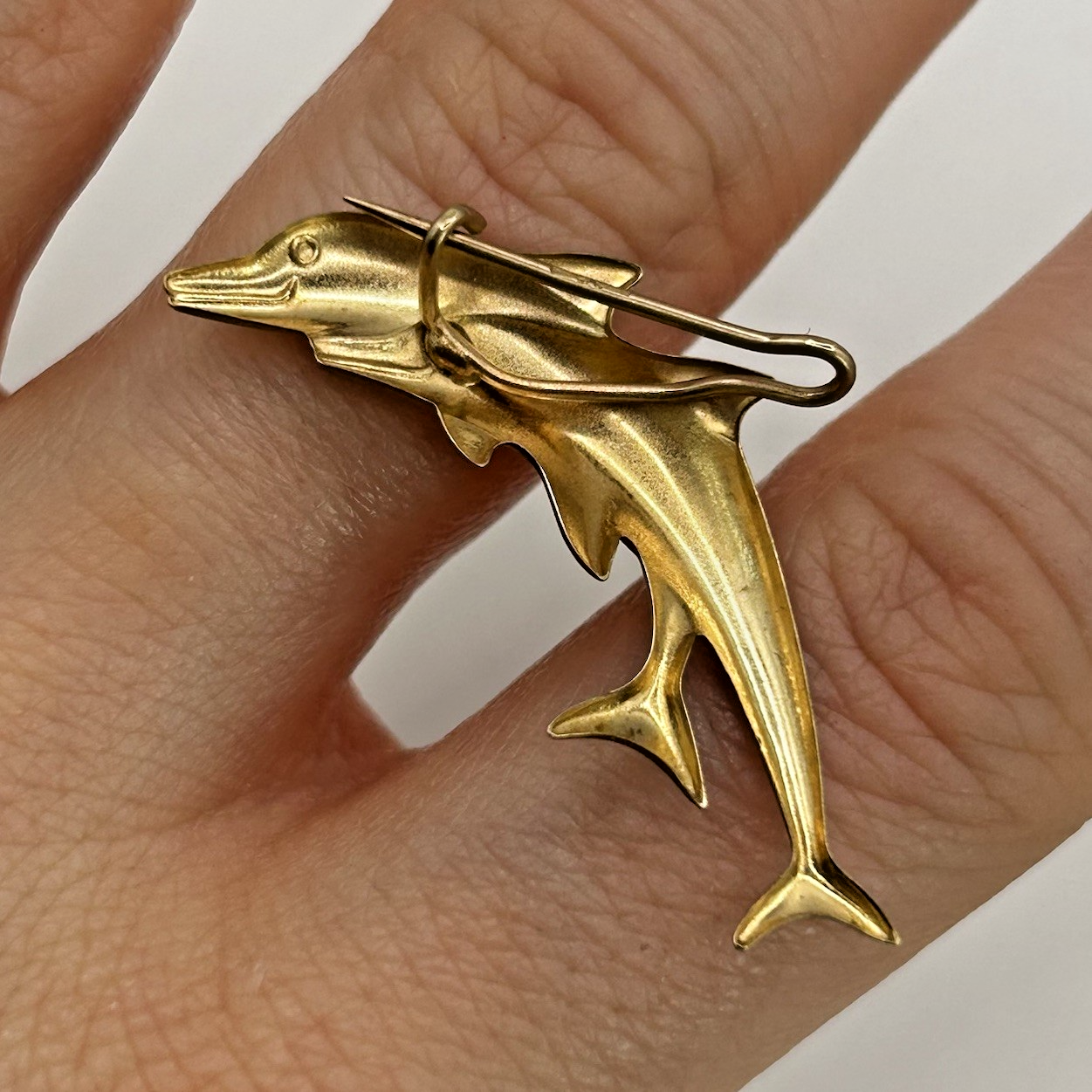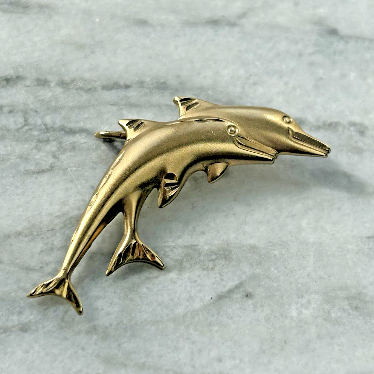 A lovely gold brooch crafted in the shape of two dolphins. Pin back.
