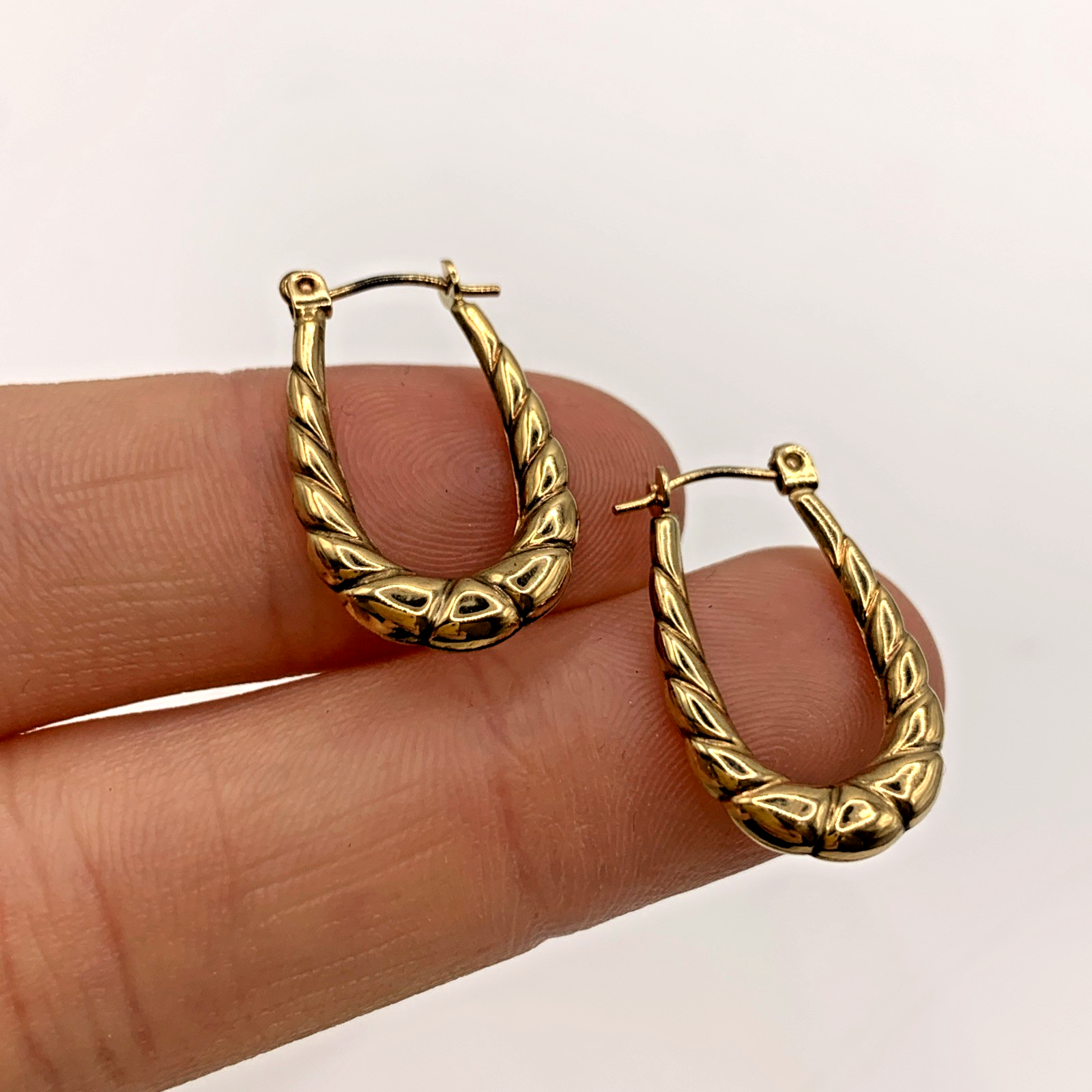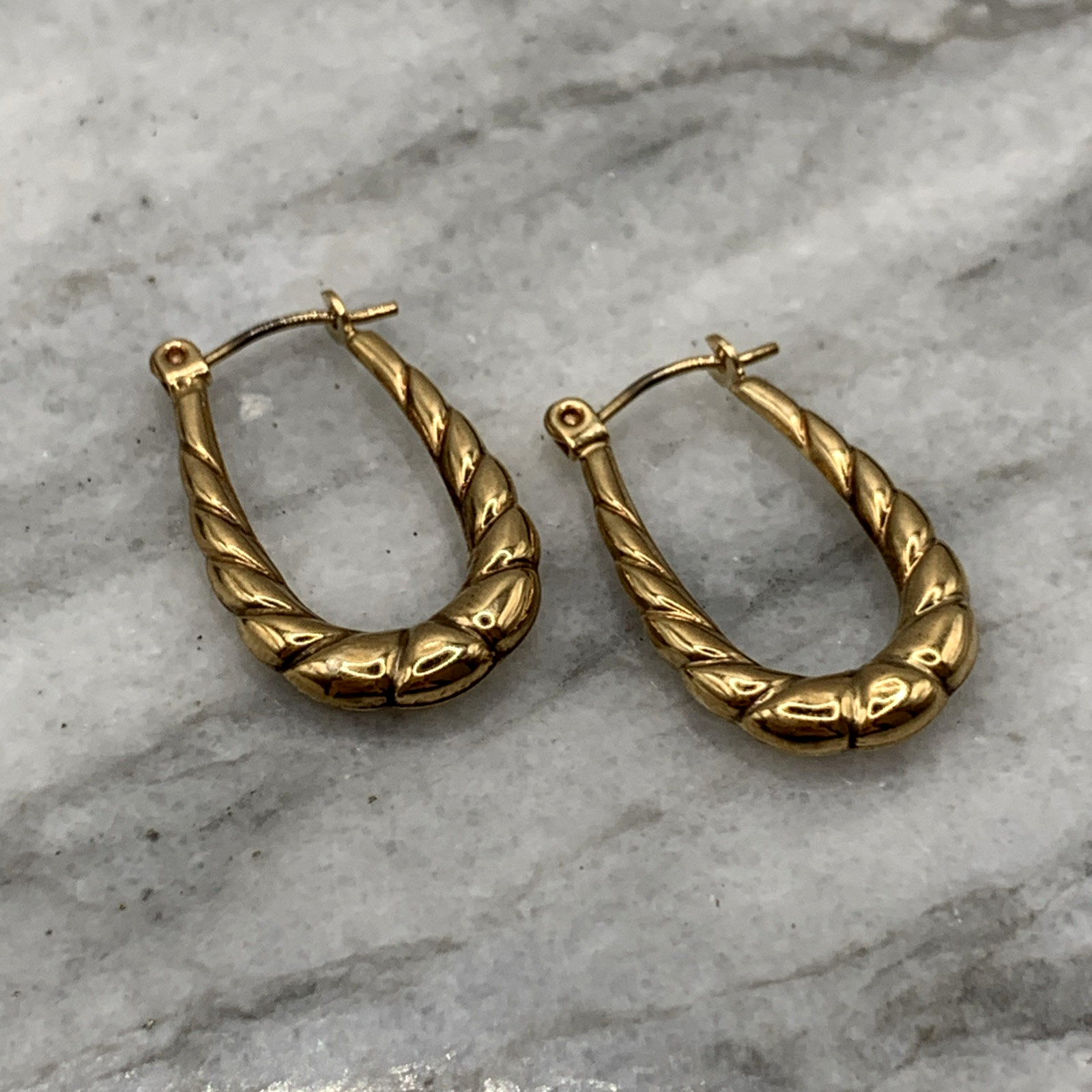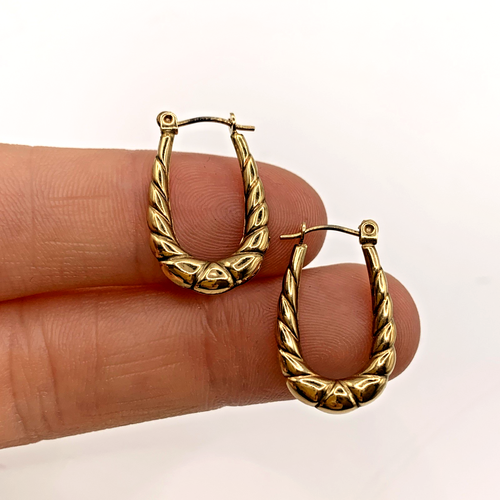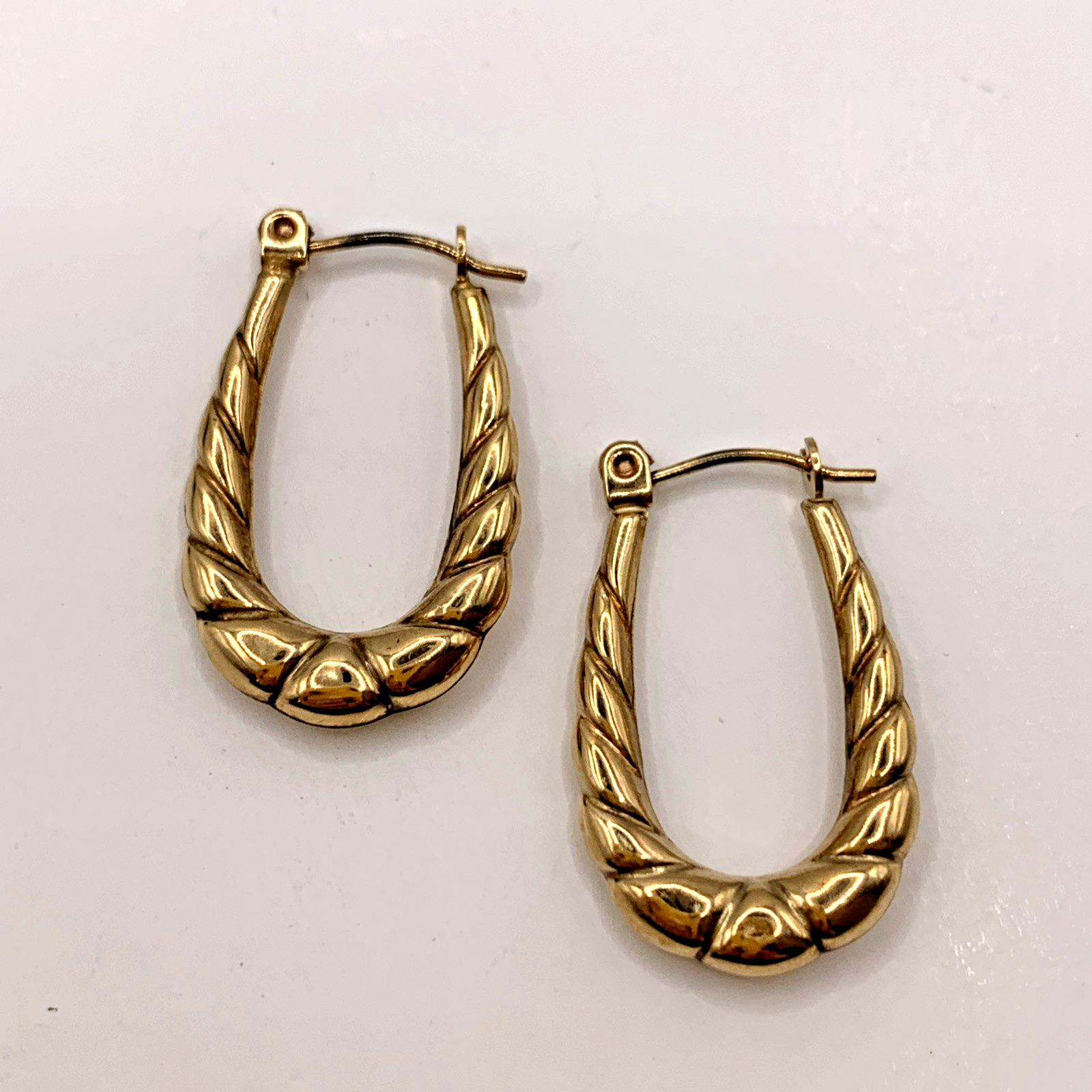 A lovely pair of horseshoe shaped textured hoop earrings. Lever back closure.