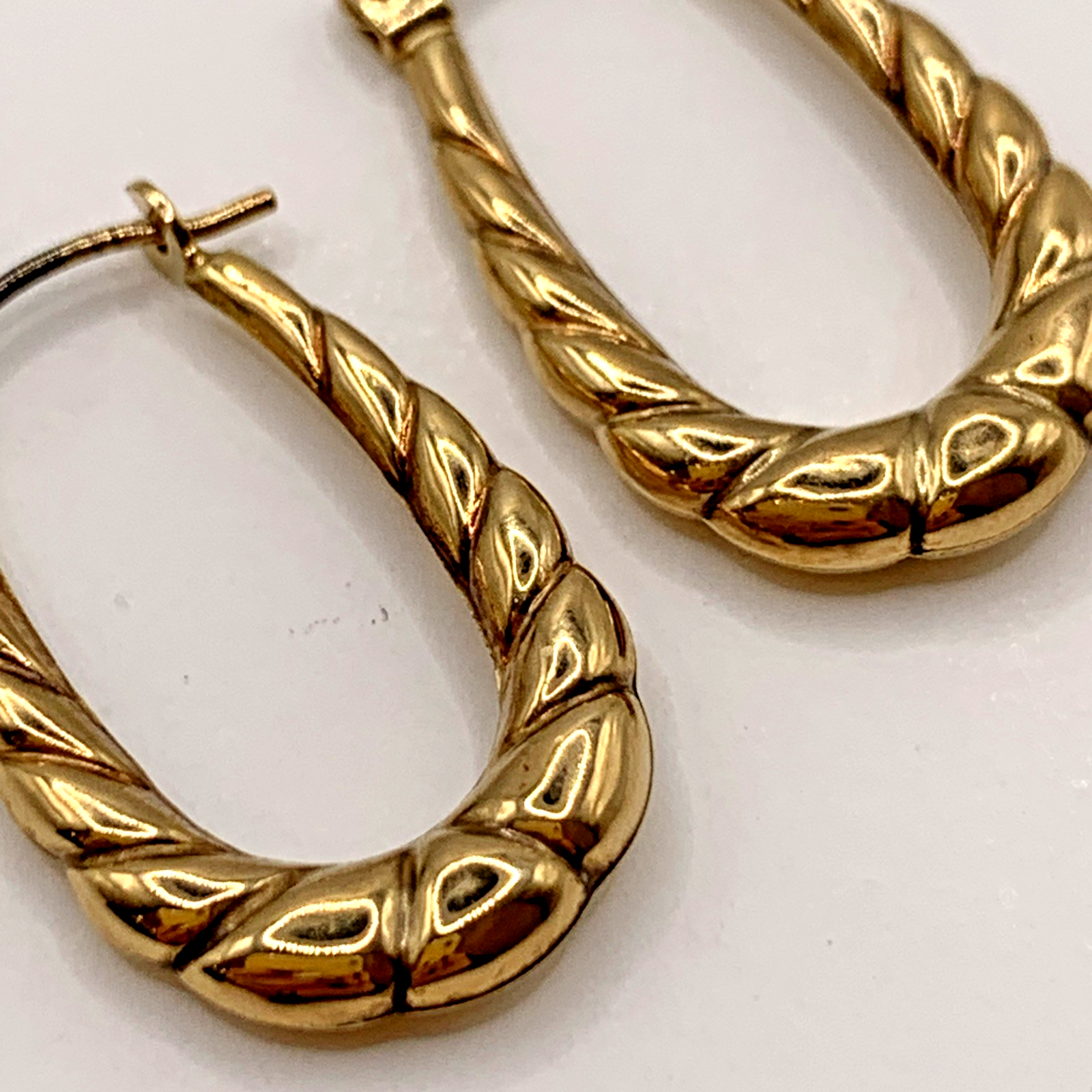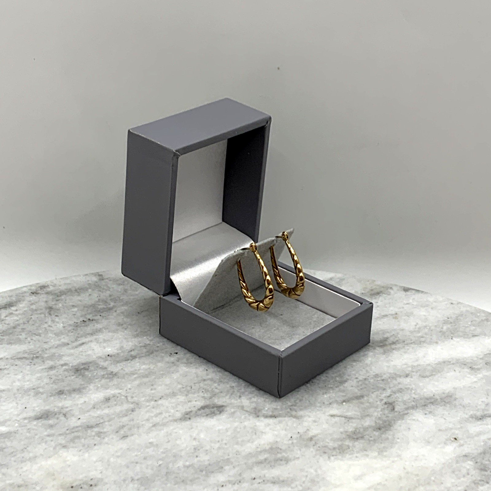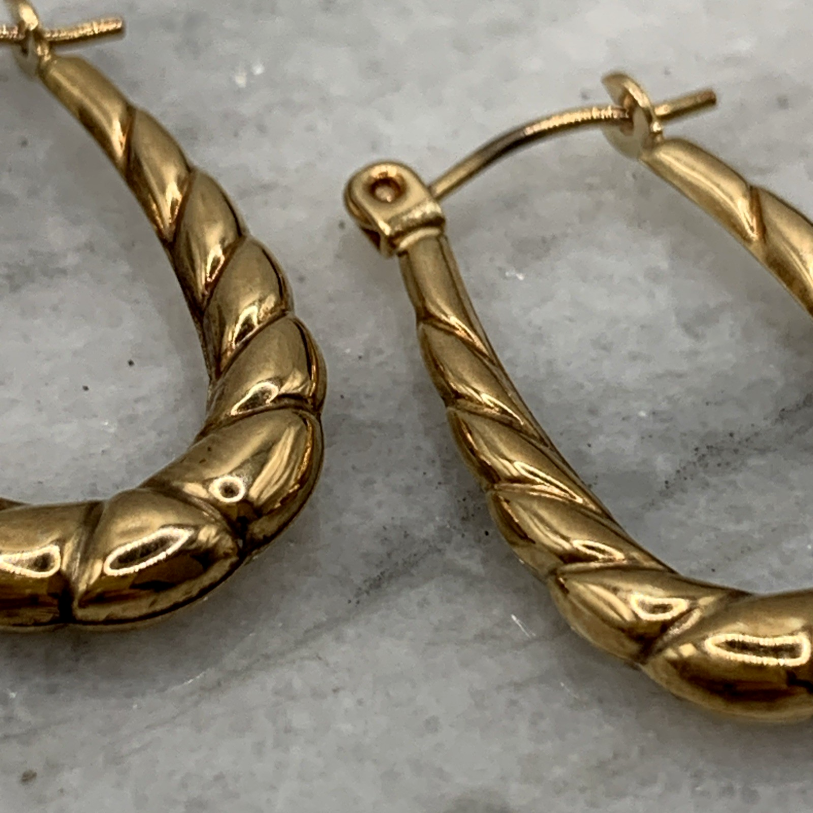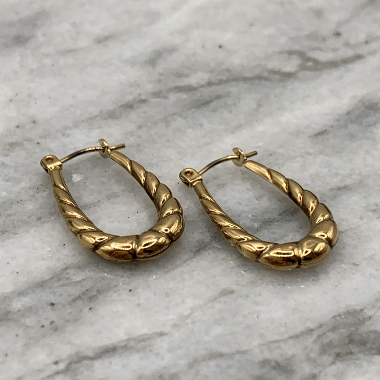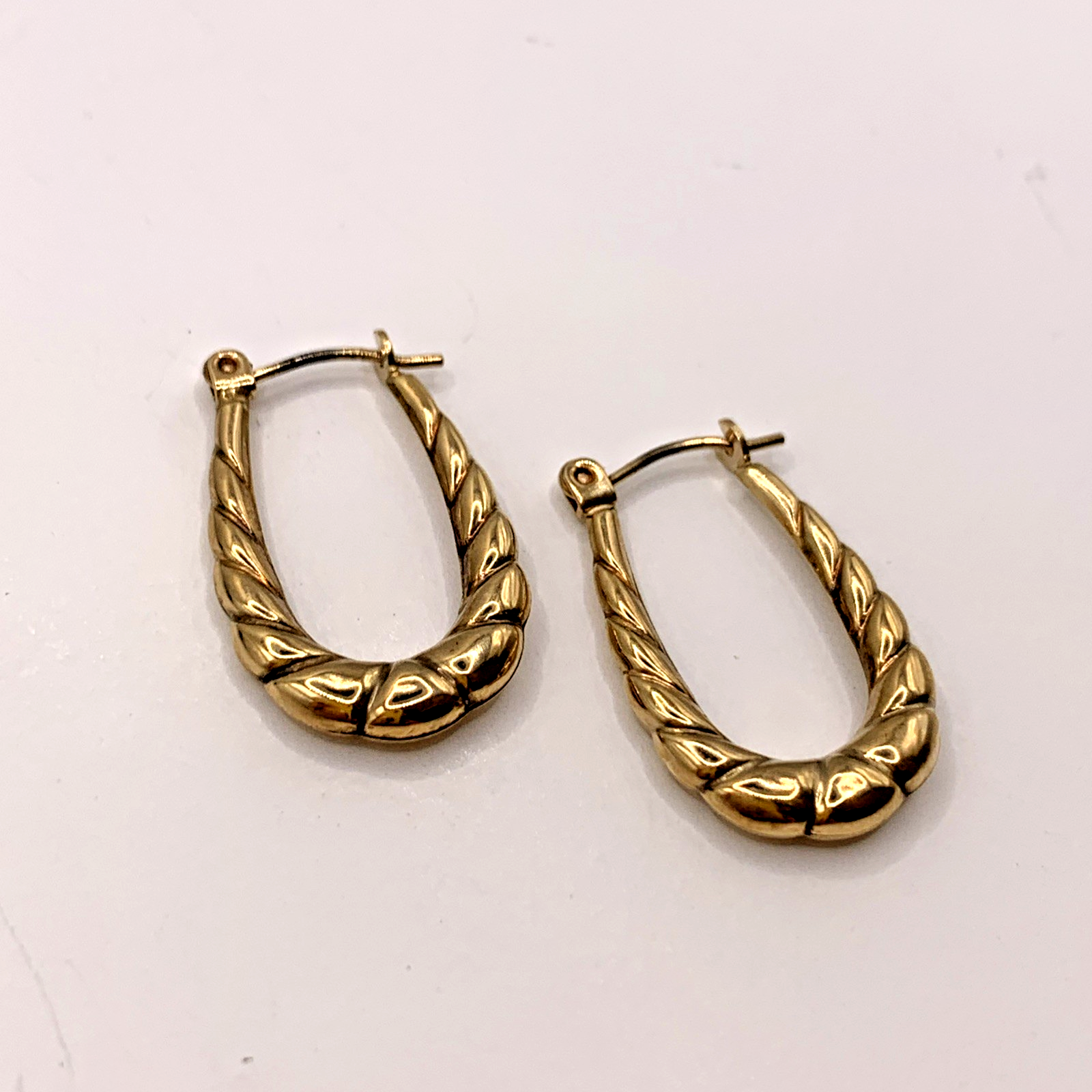 A lovely pair of horseshoe shaped textured hoop earrings. Lever back closure.