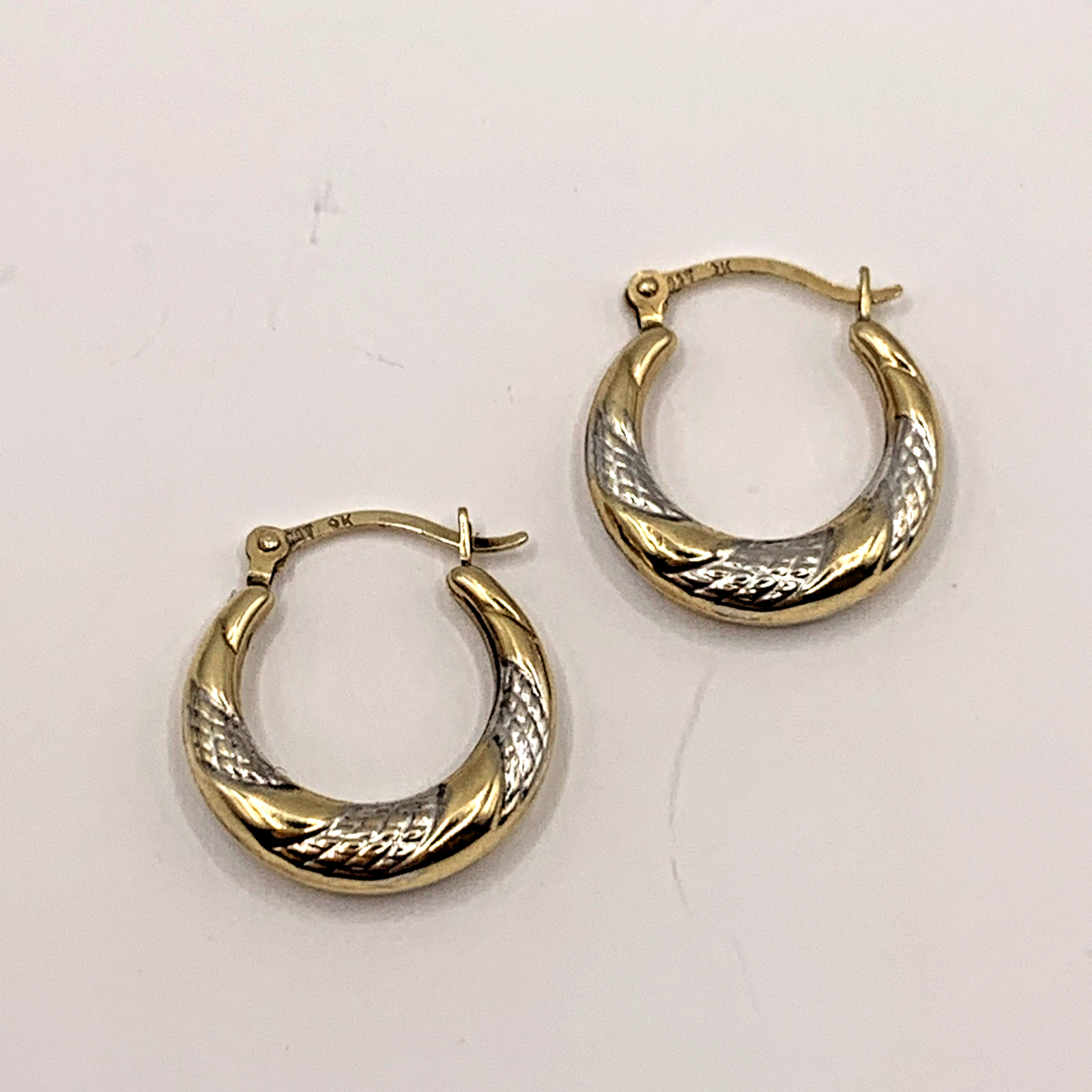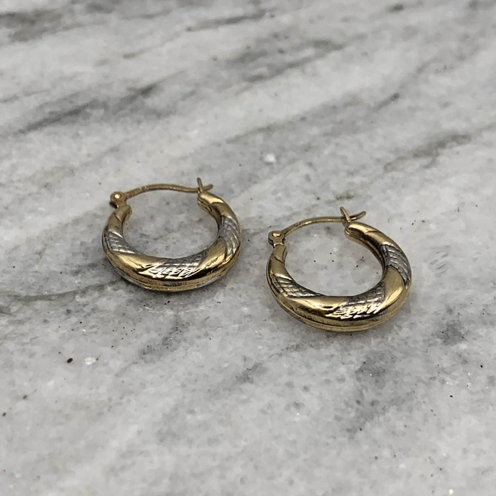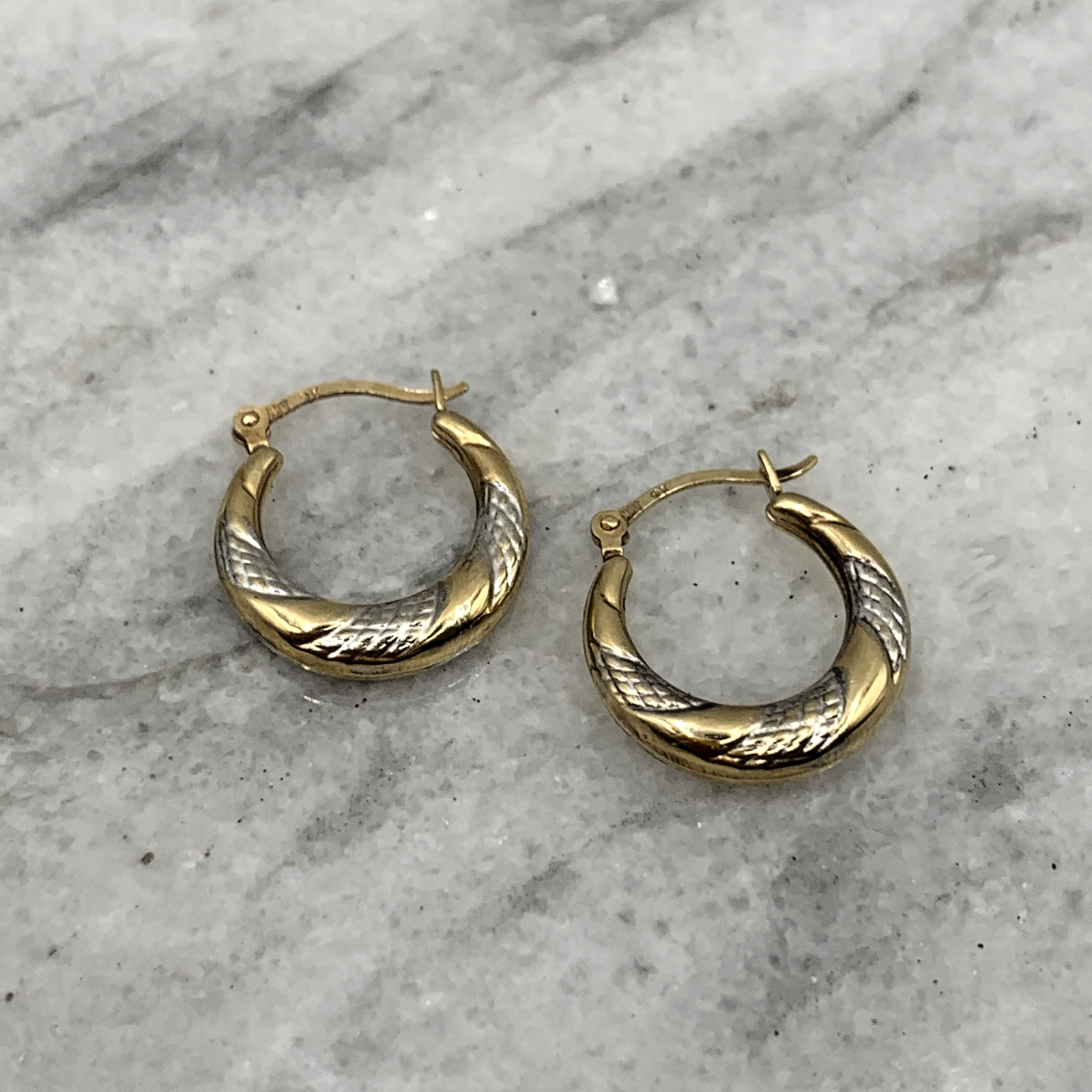 A charming pair of two tone gold twist style huggie hoop earrings. Latch closure.