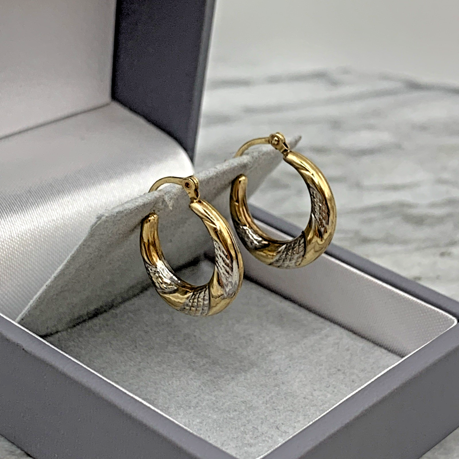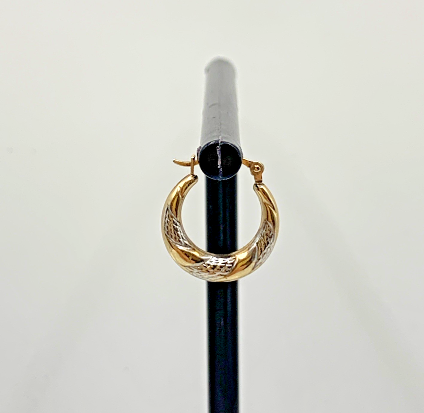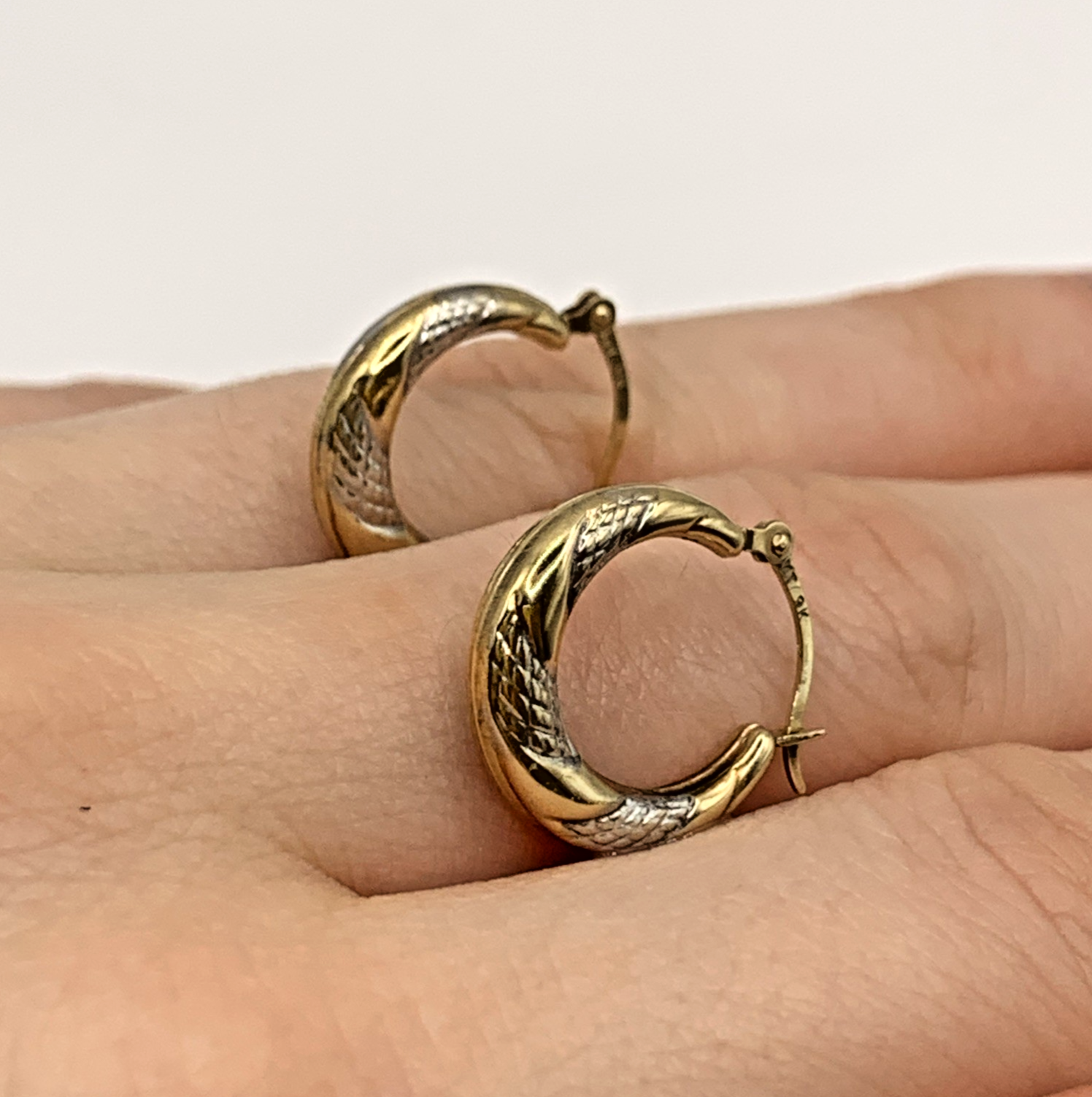A charming pair of two tone gold twist style huggie hoop earrings. Latch closure.