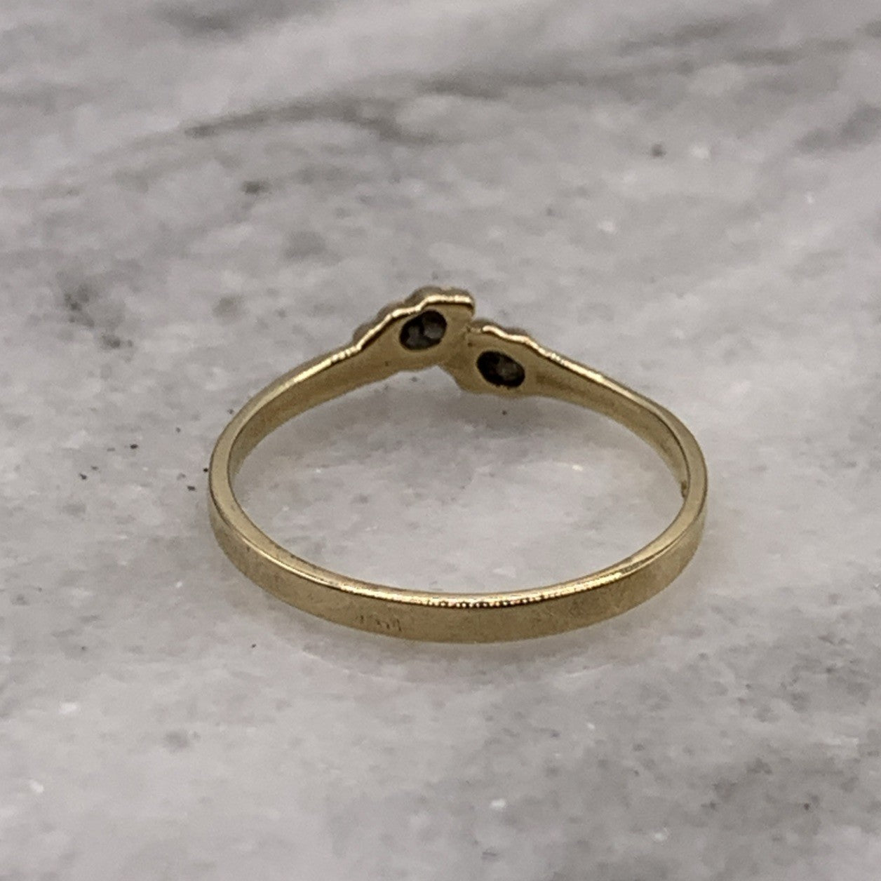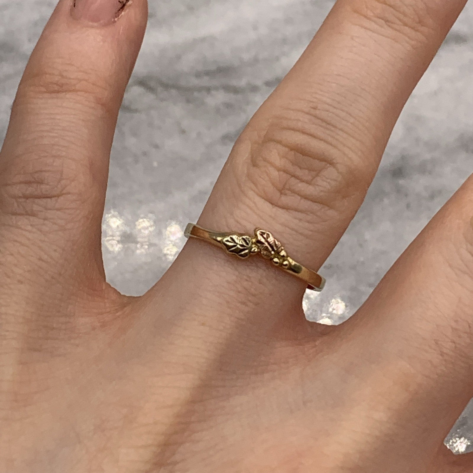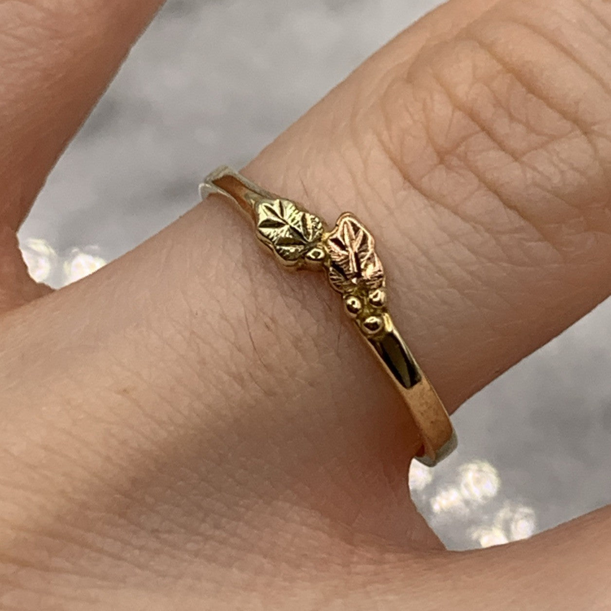 A dainty two tone gold ring featuring two petite leaf motifs in yellow and rose gold.