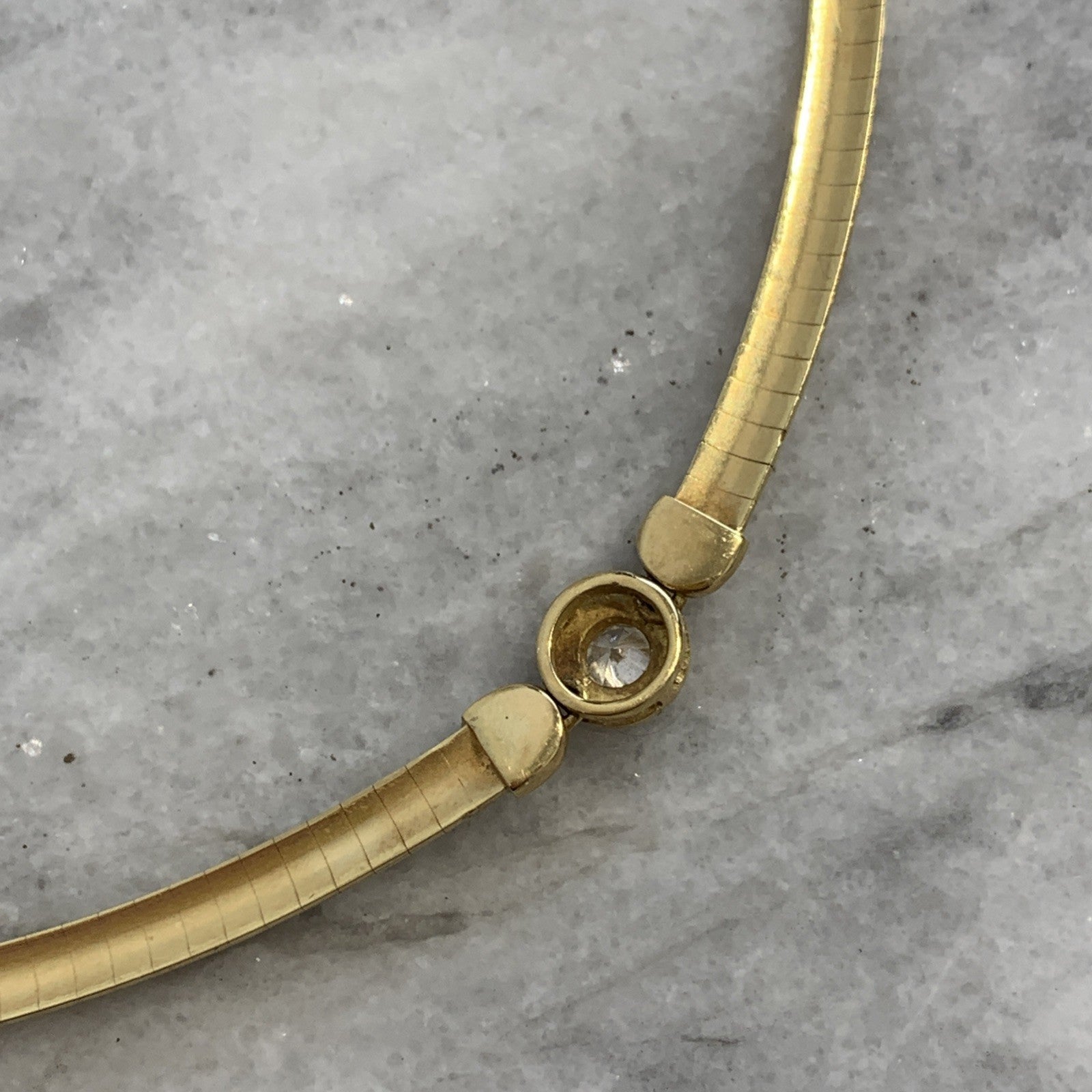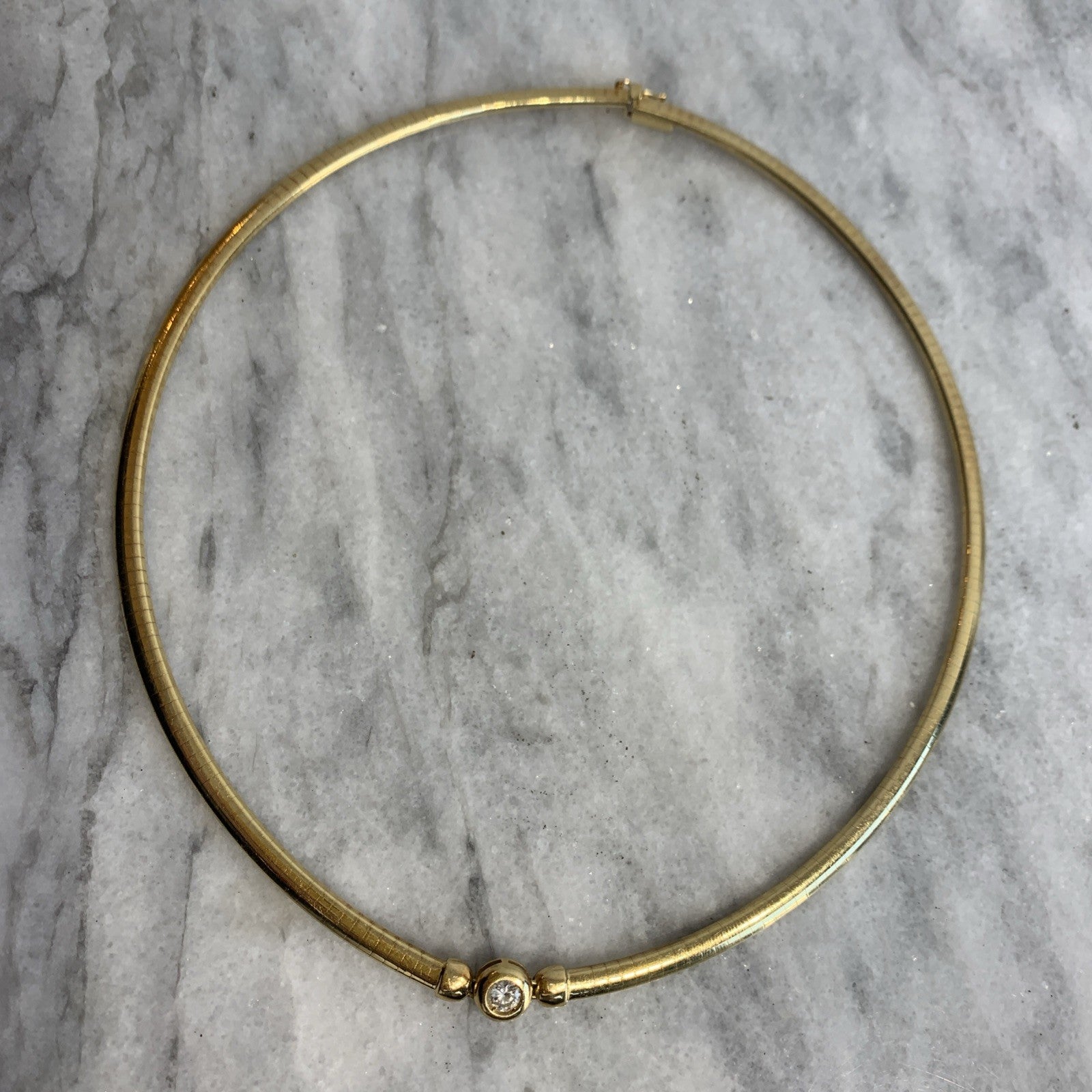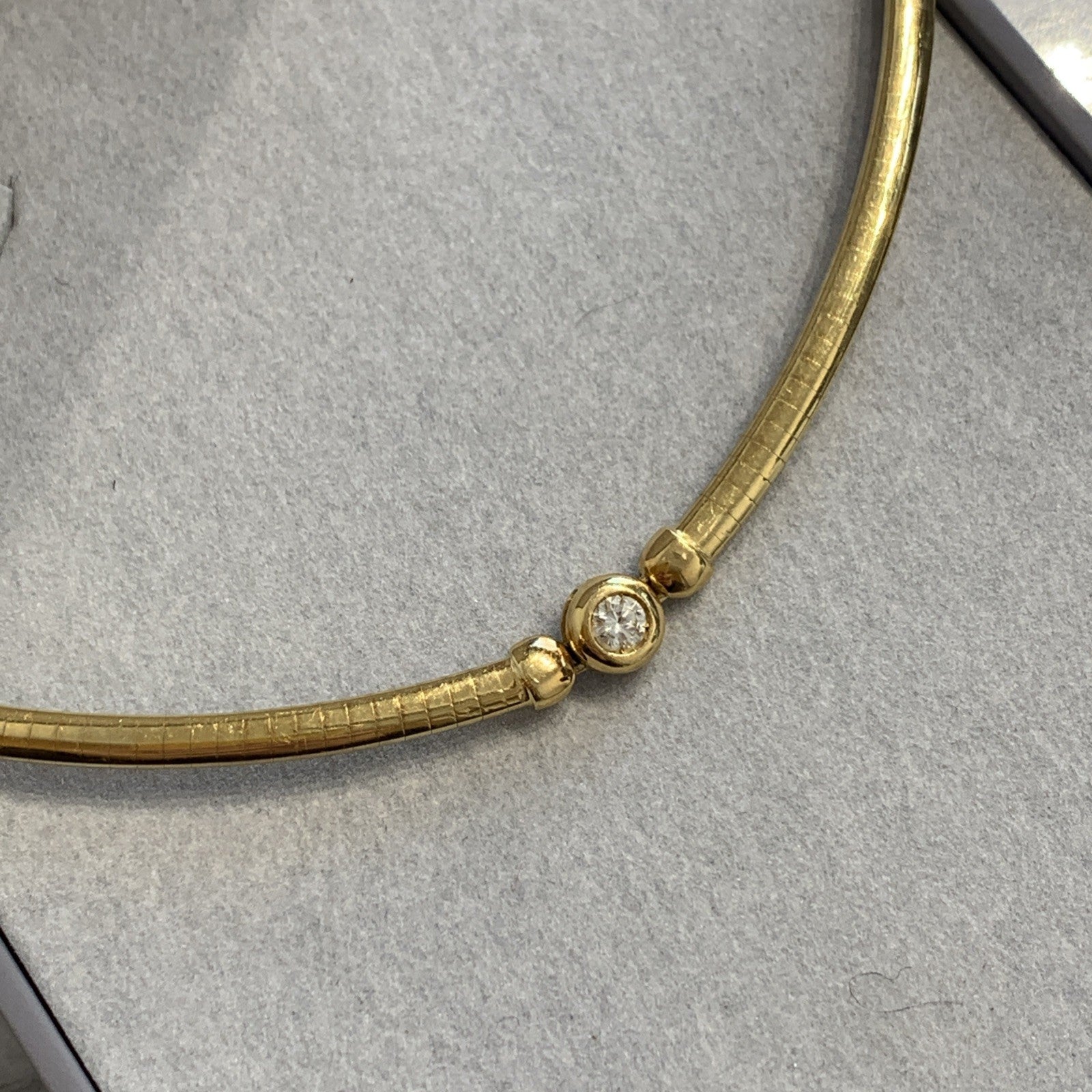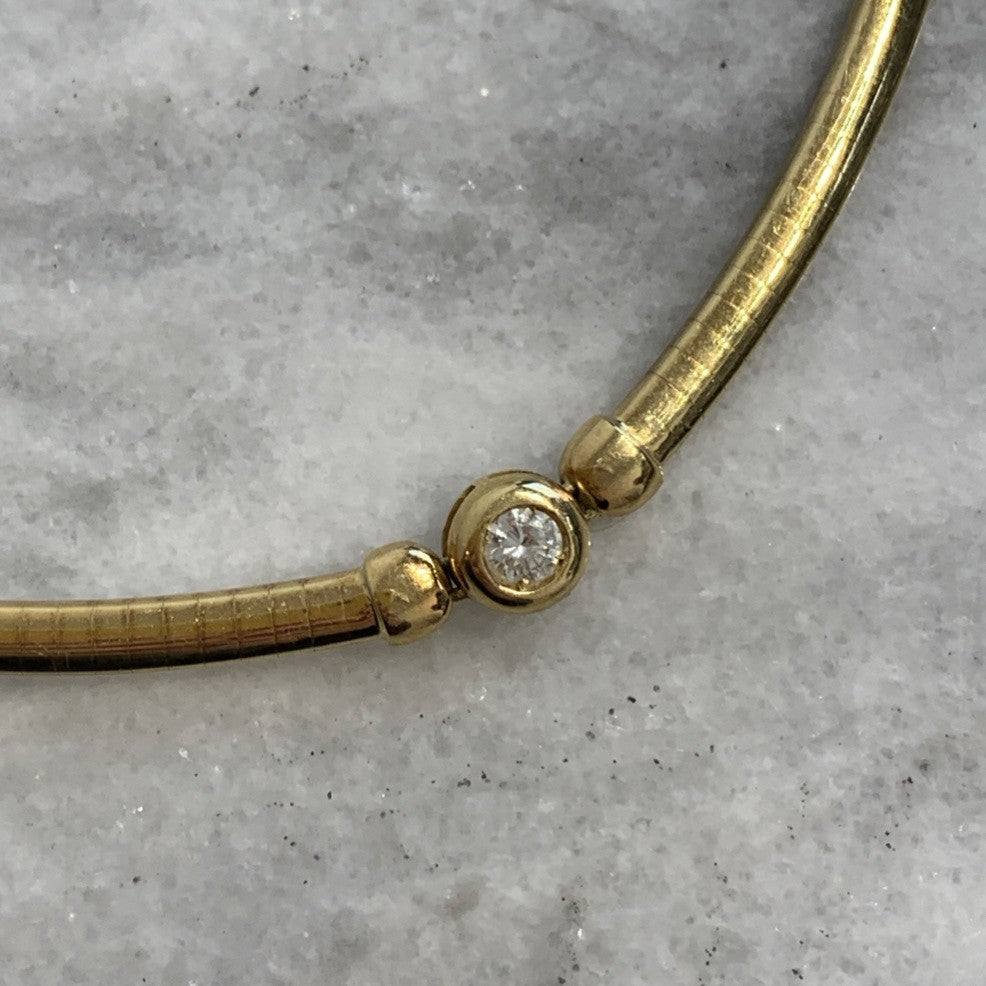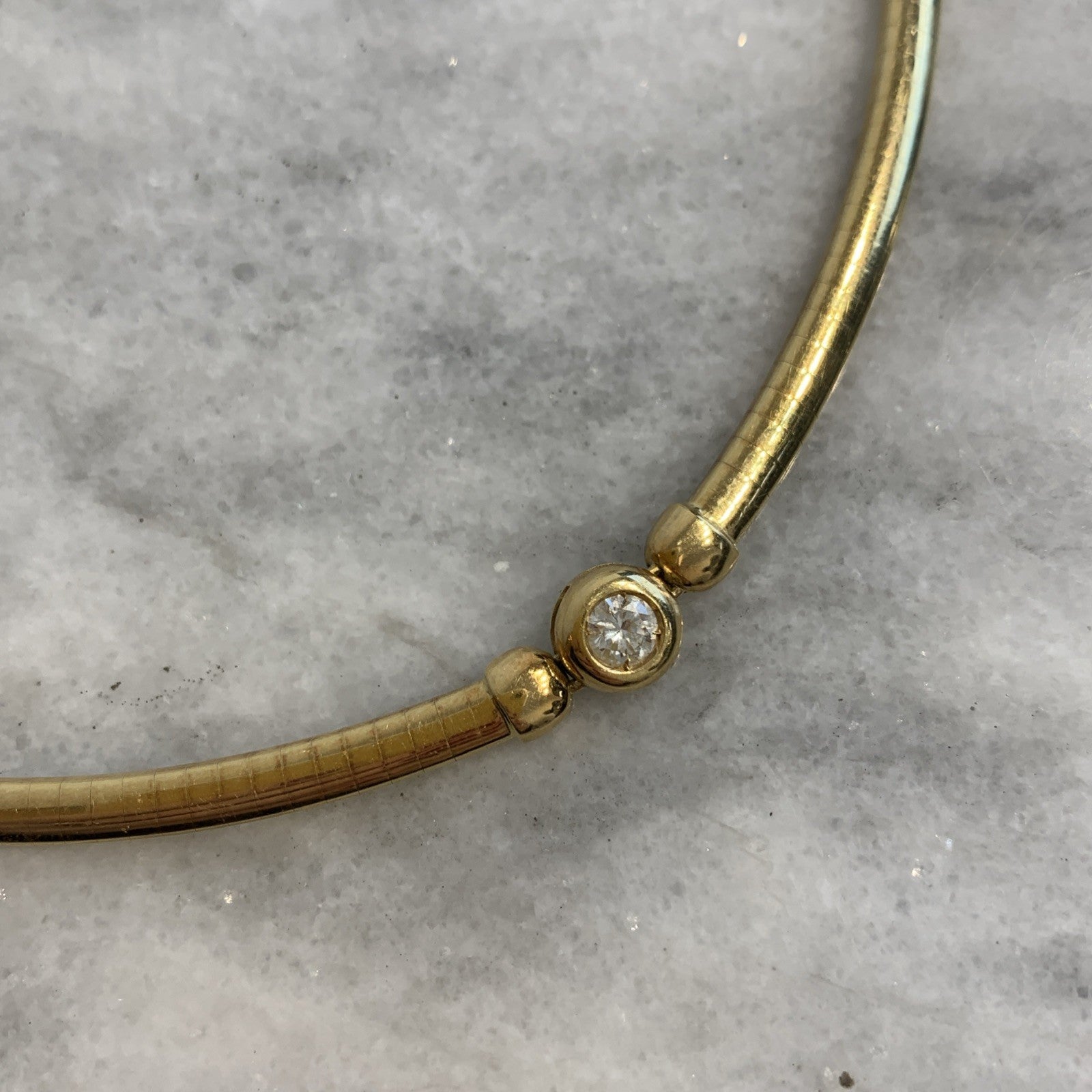 - A stunning 18ct gold omega chain necklace featuring a bezel set diamond. Box latch closure.