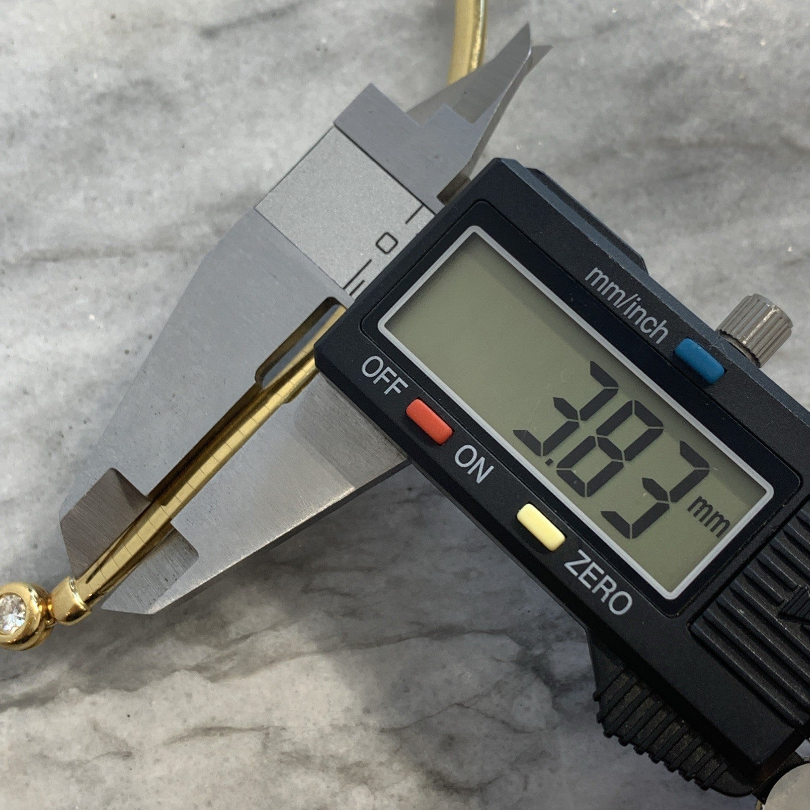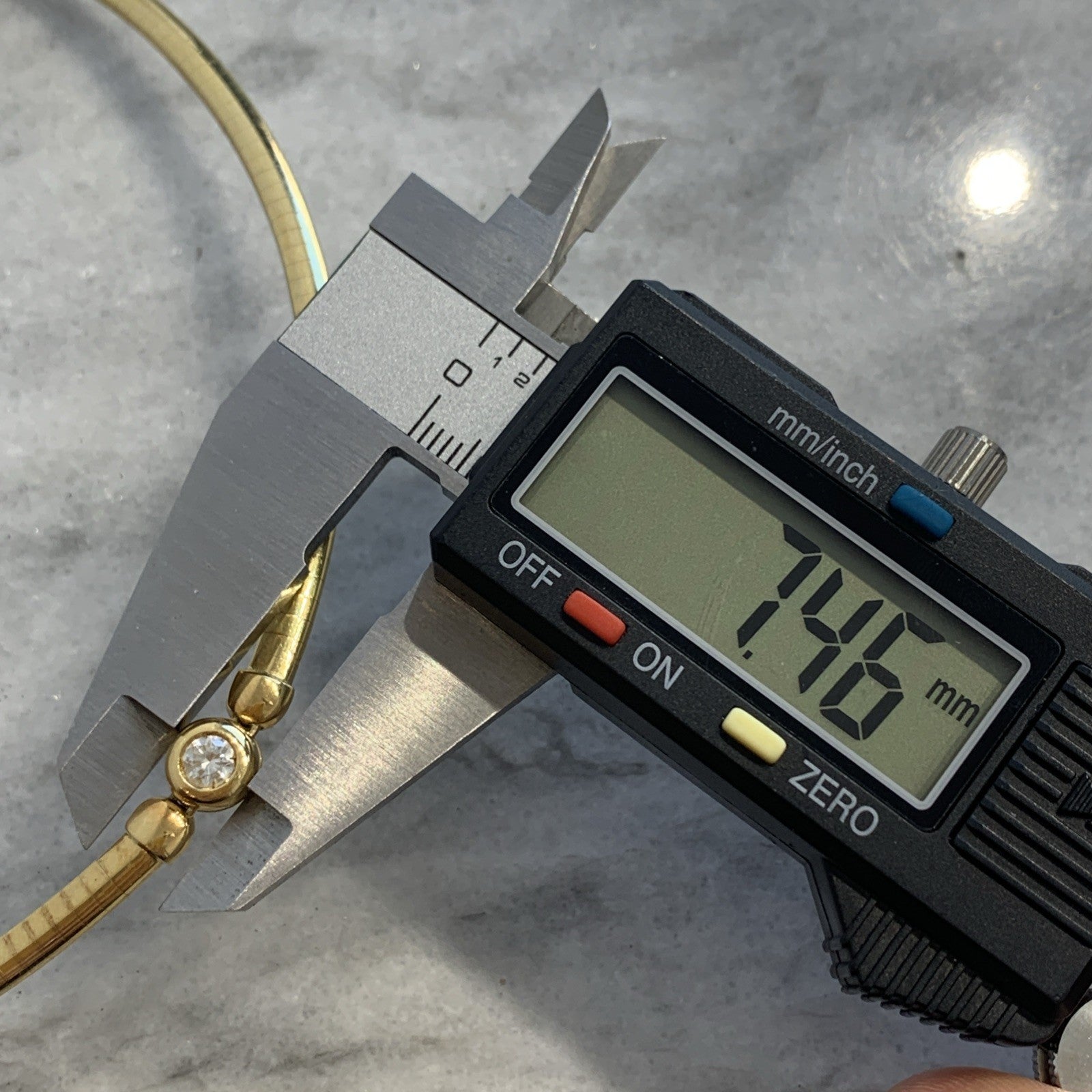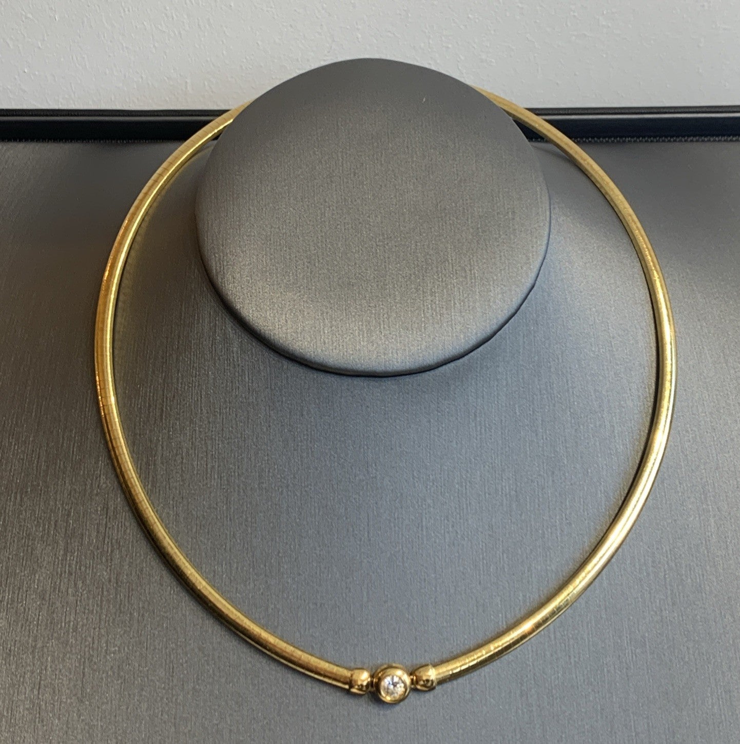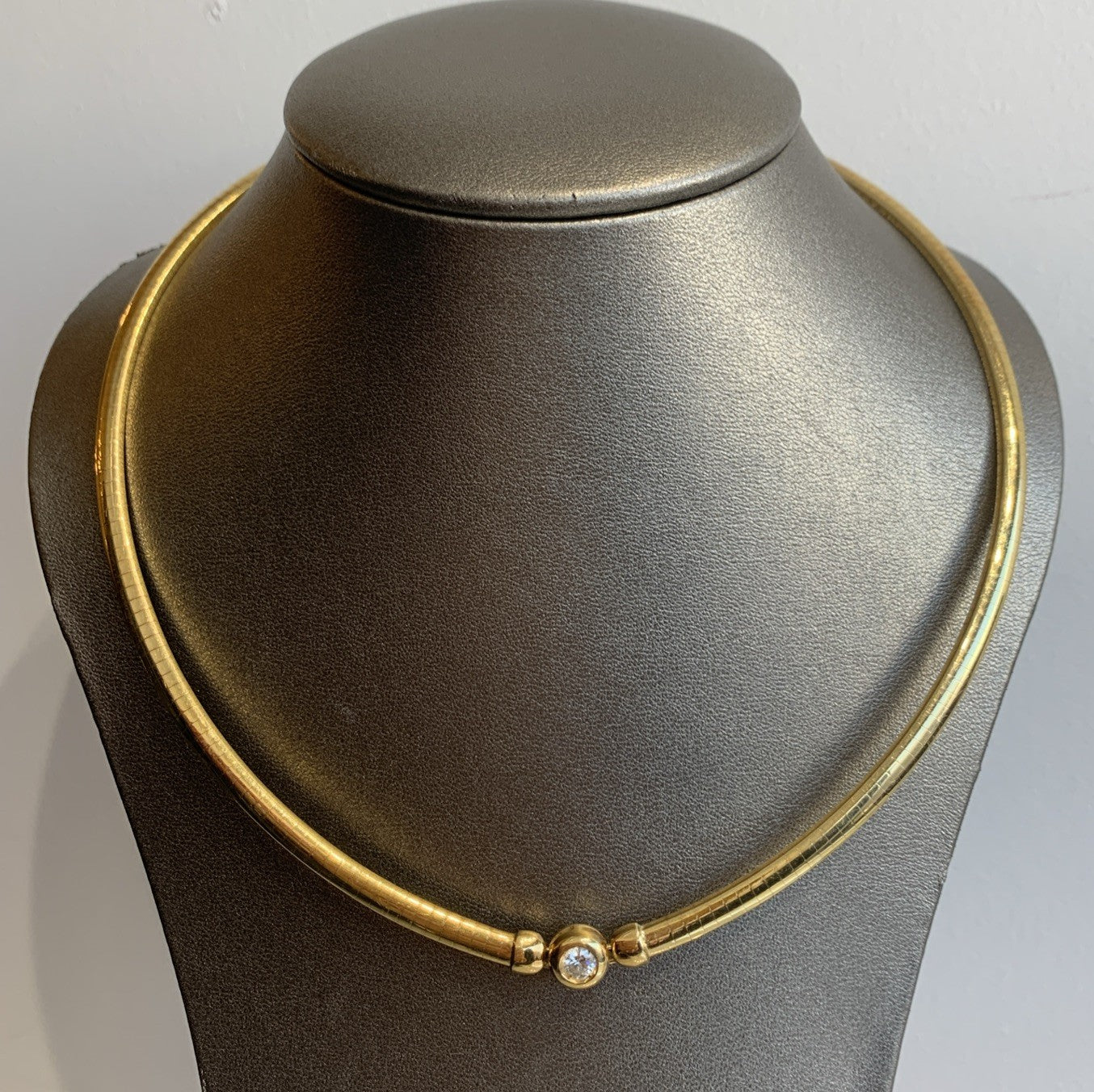 - A stunning 18ct gold omega chain necklace featuring a bezel set diamond. Box latch closure.