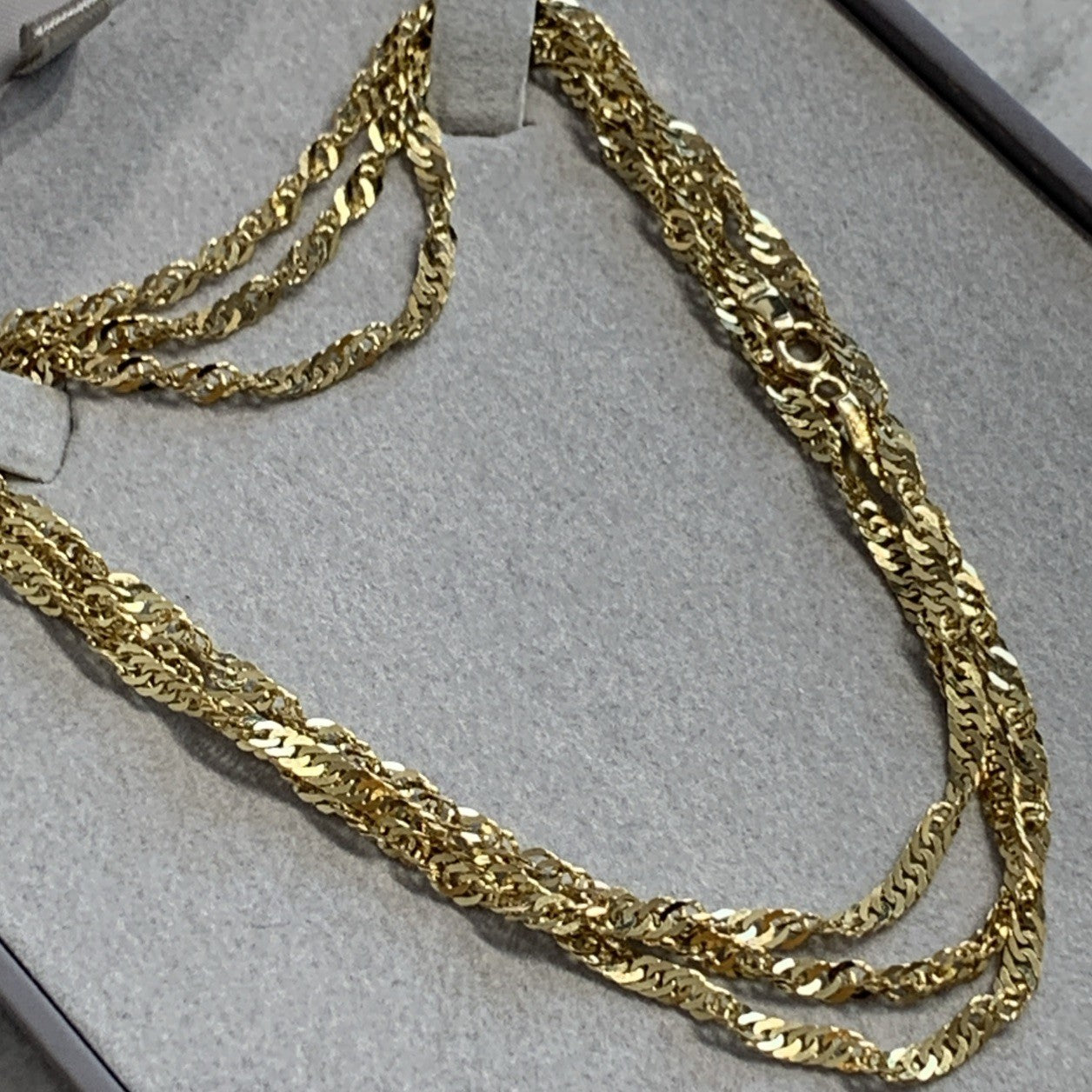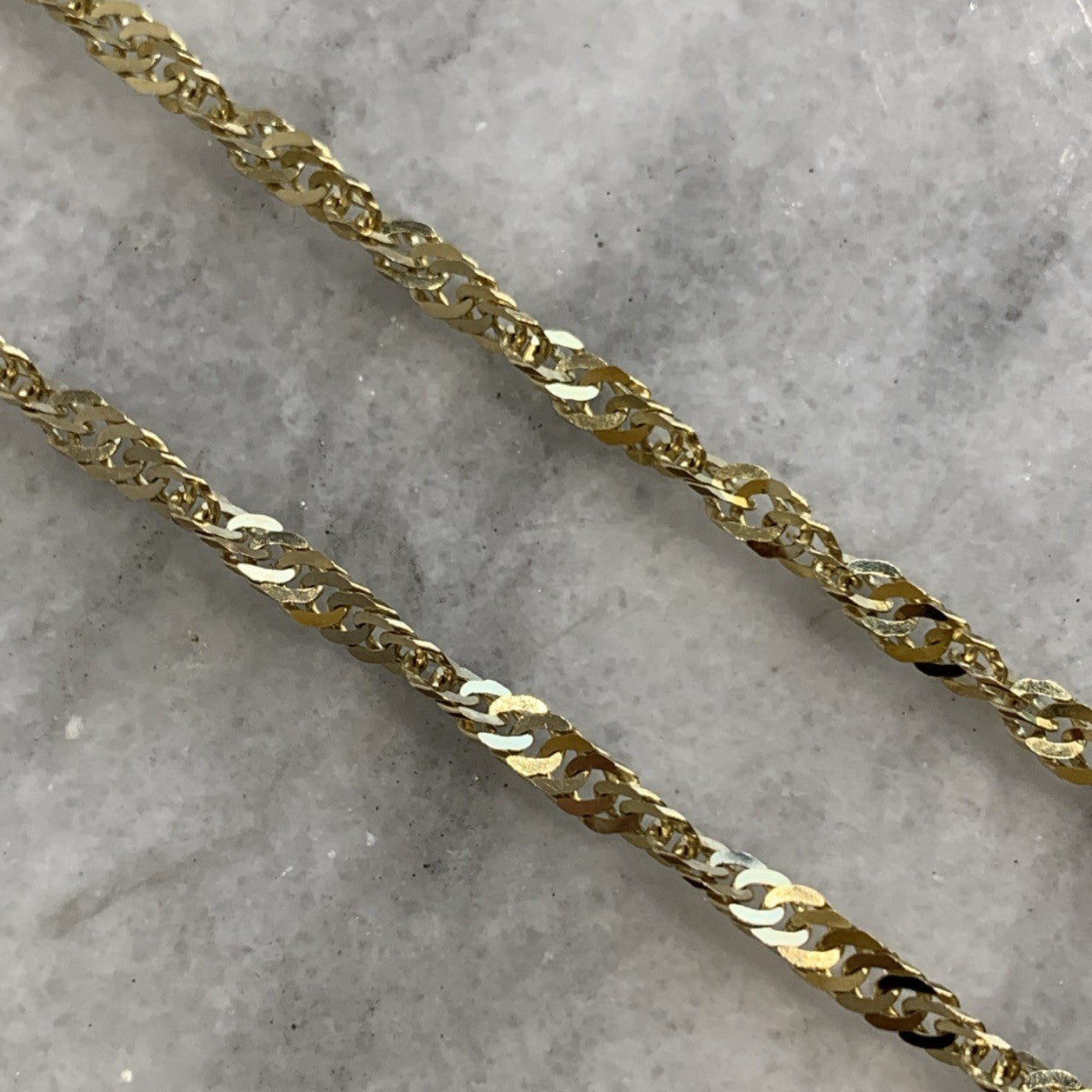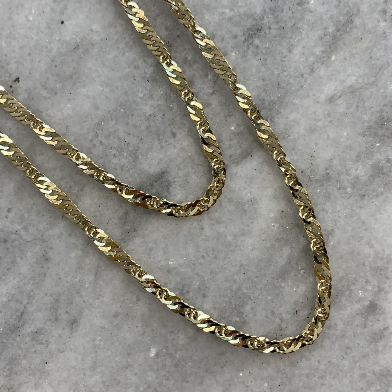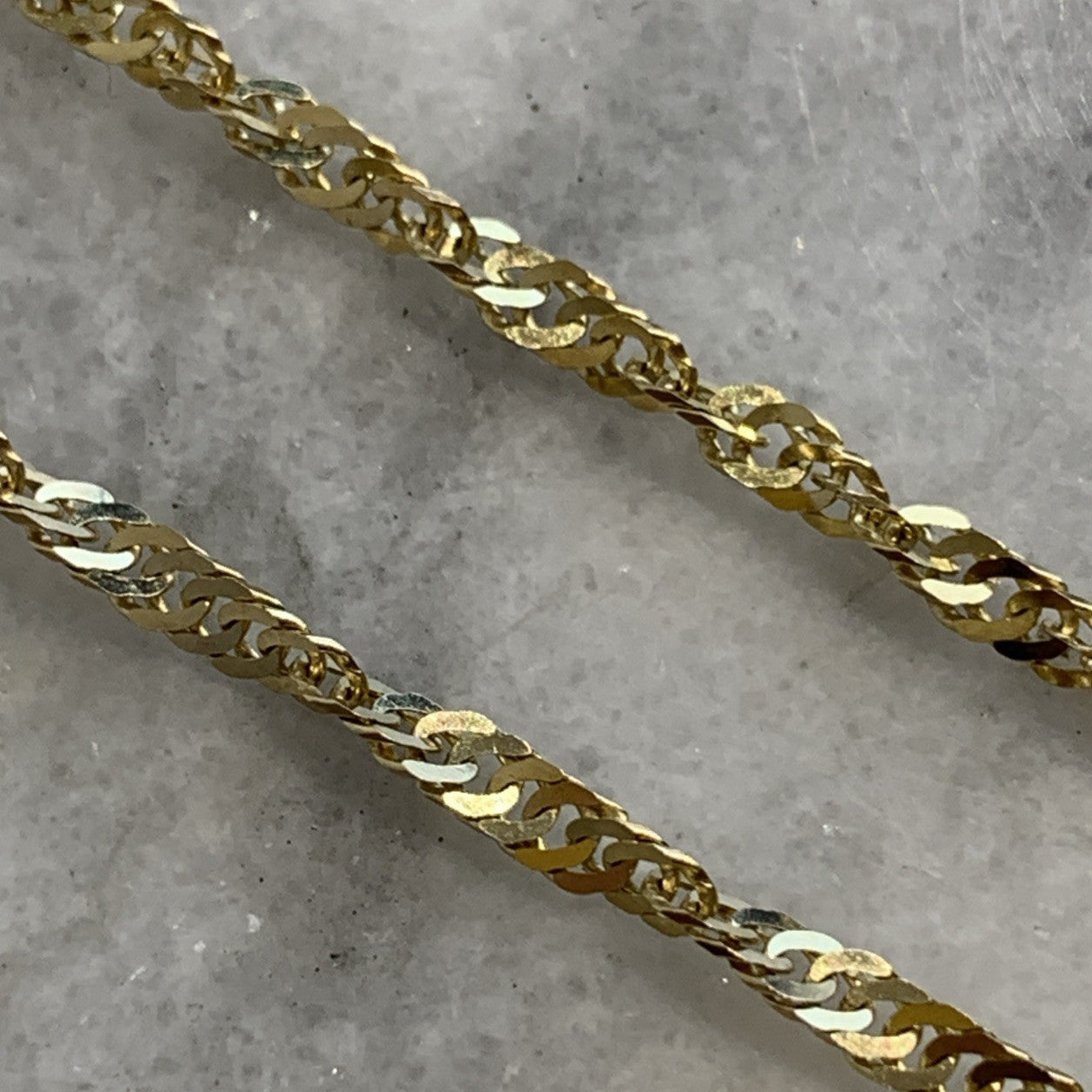 - A stunning gold Singapore twist style chain. Spring ring closure.