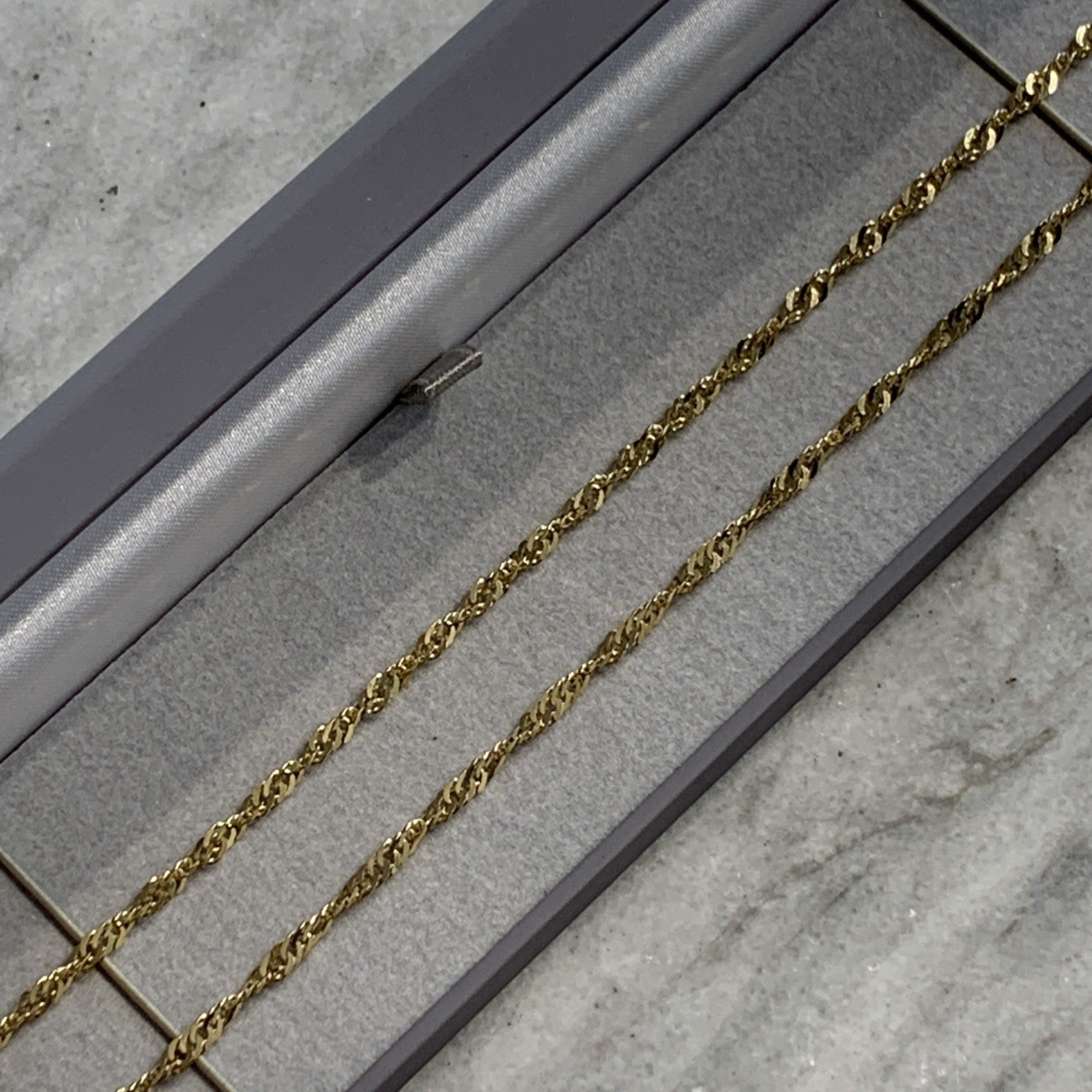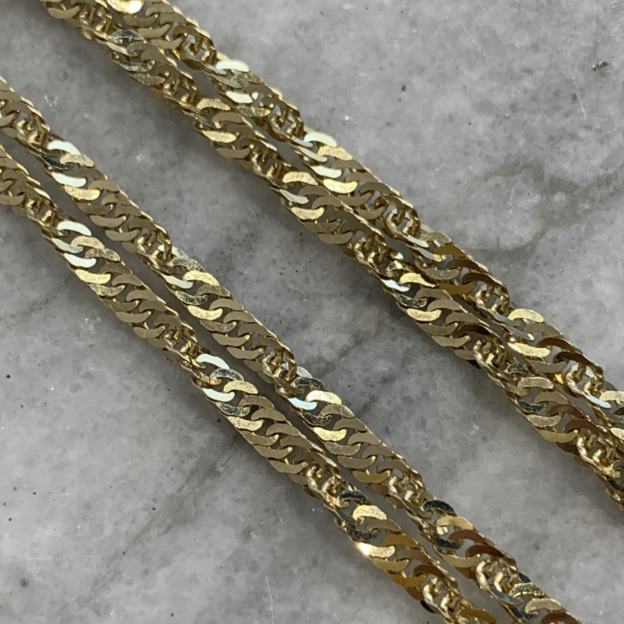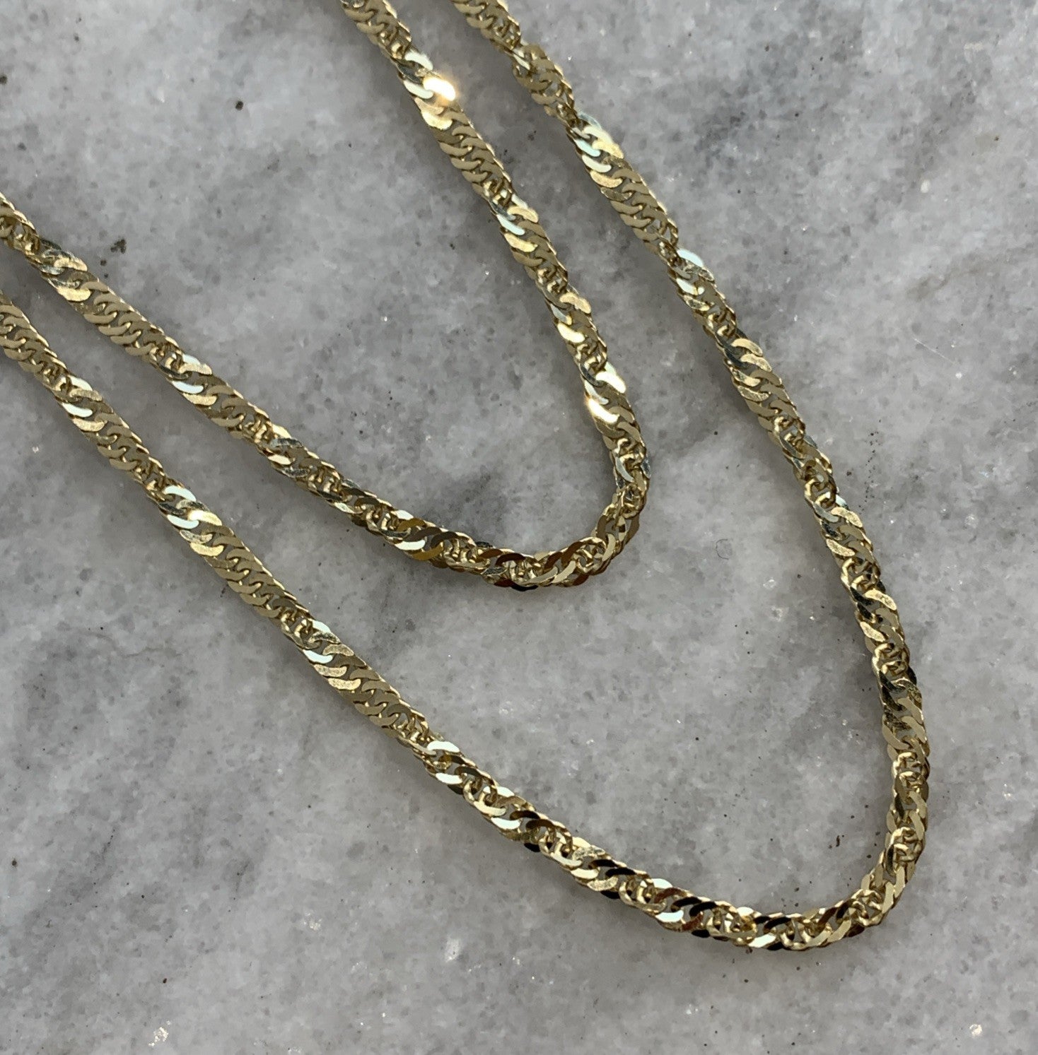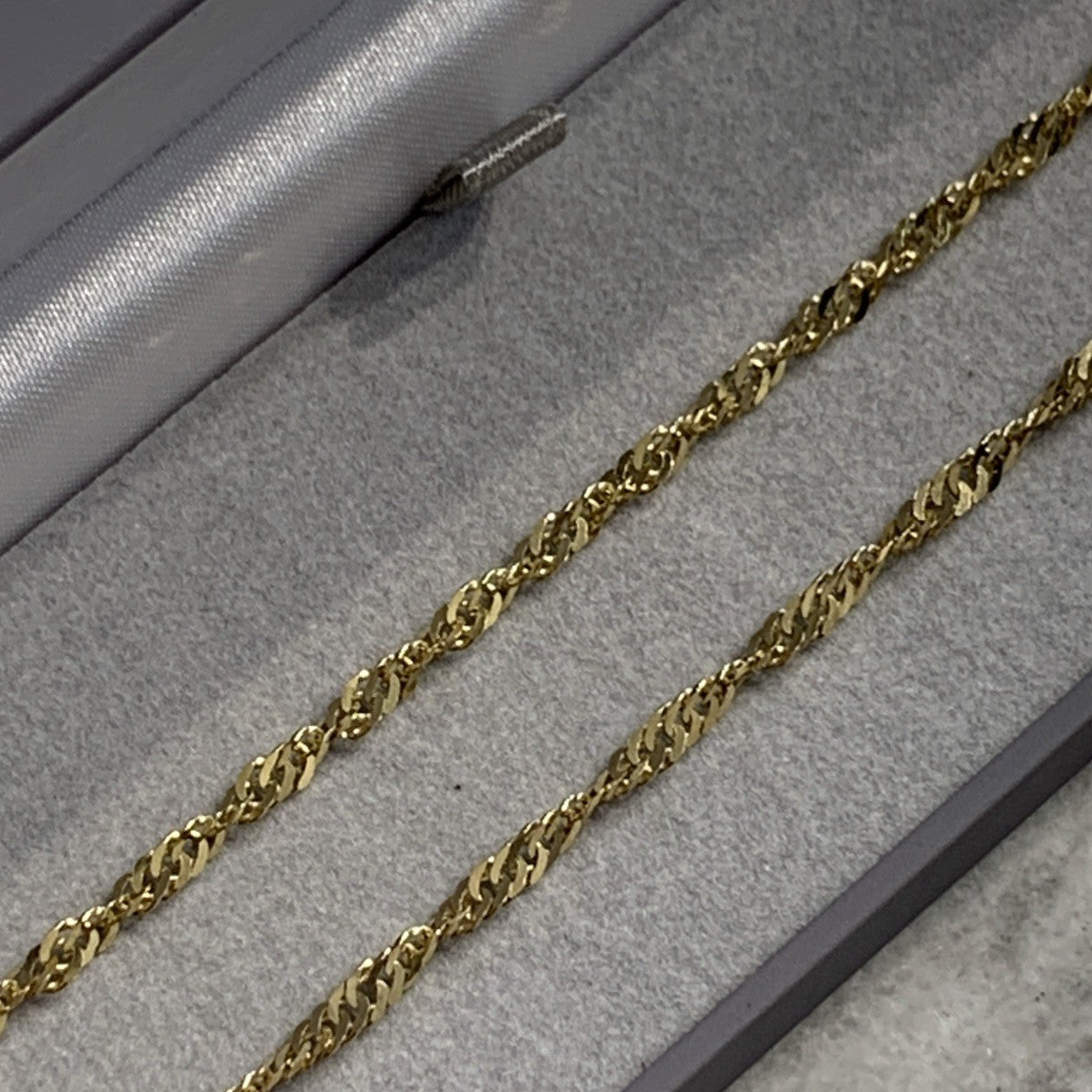 - A stunning gold Singapore twist style chain. Spring ring closure.