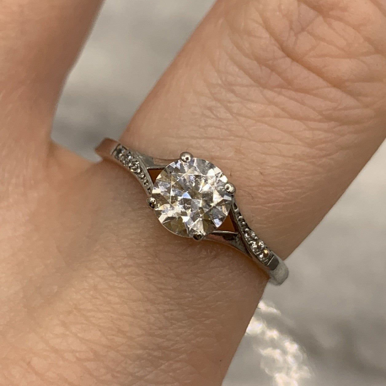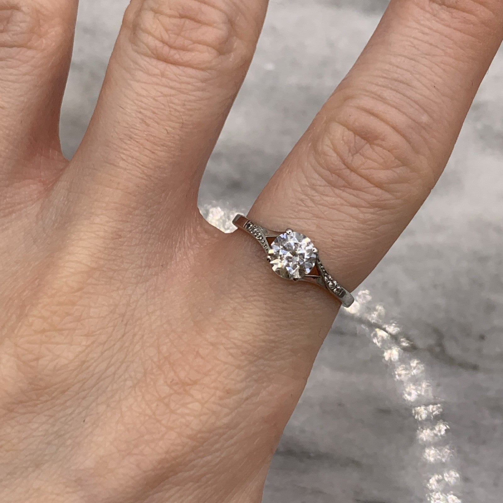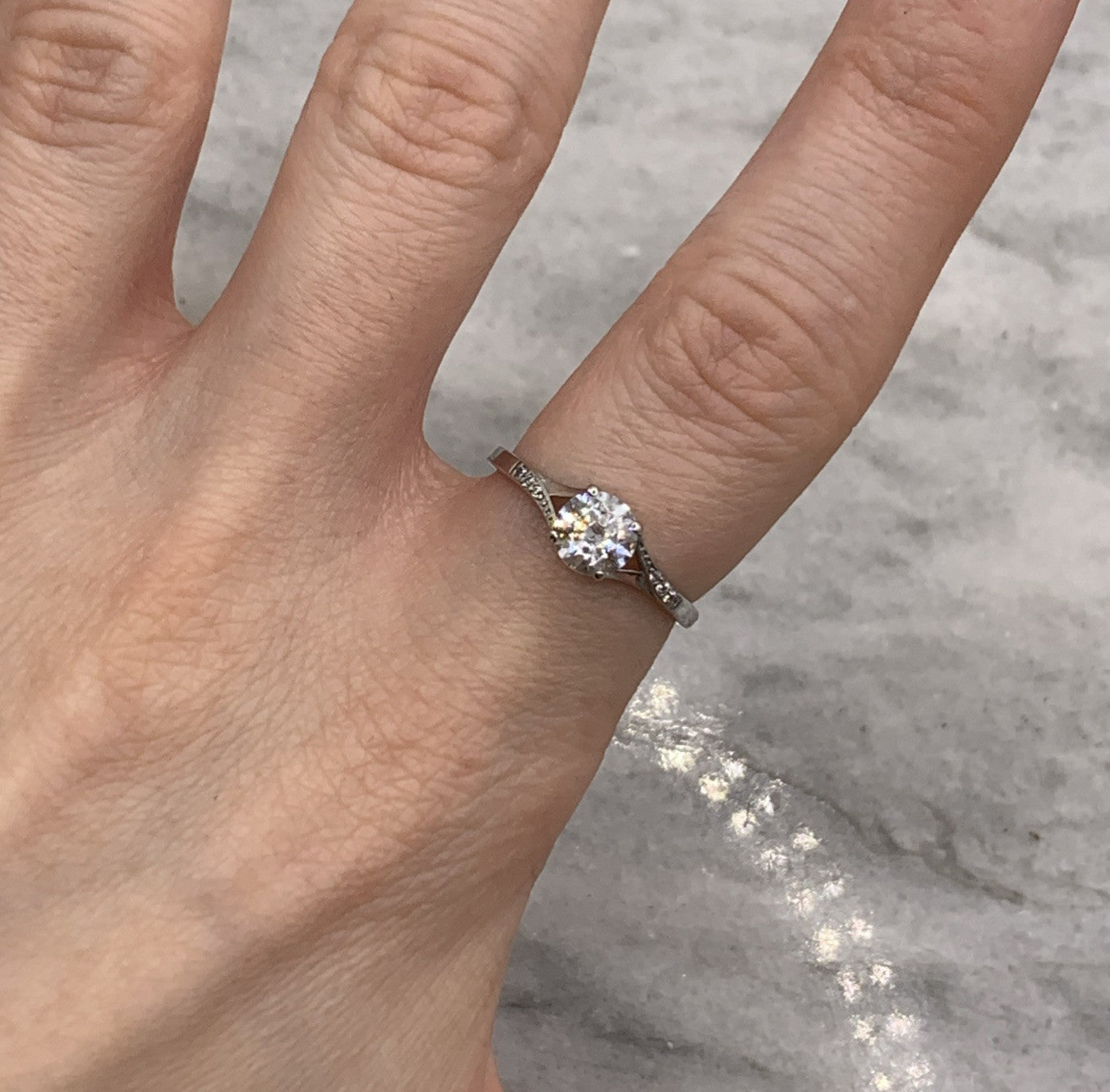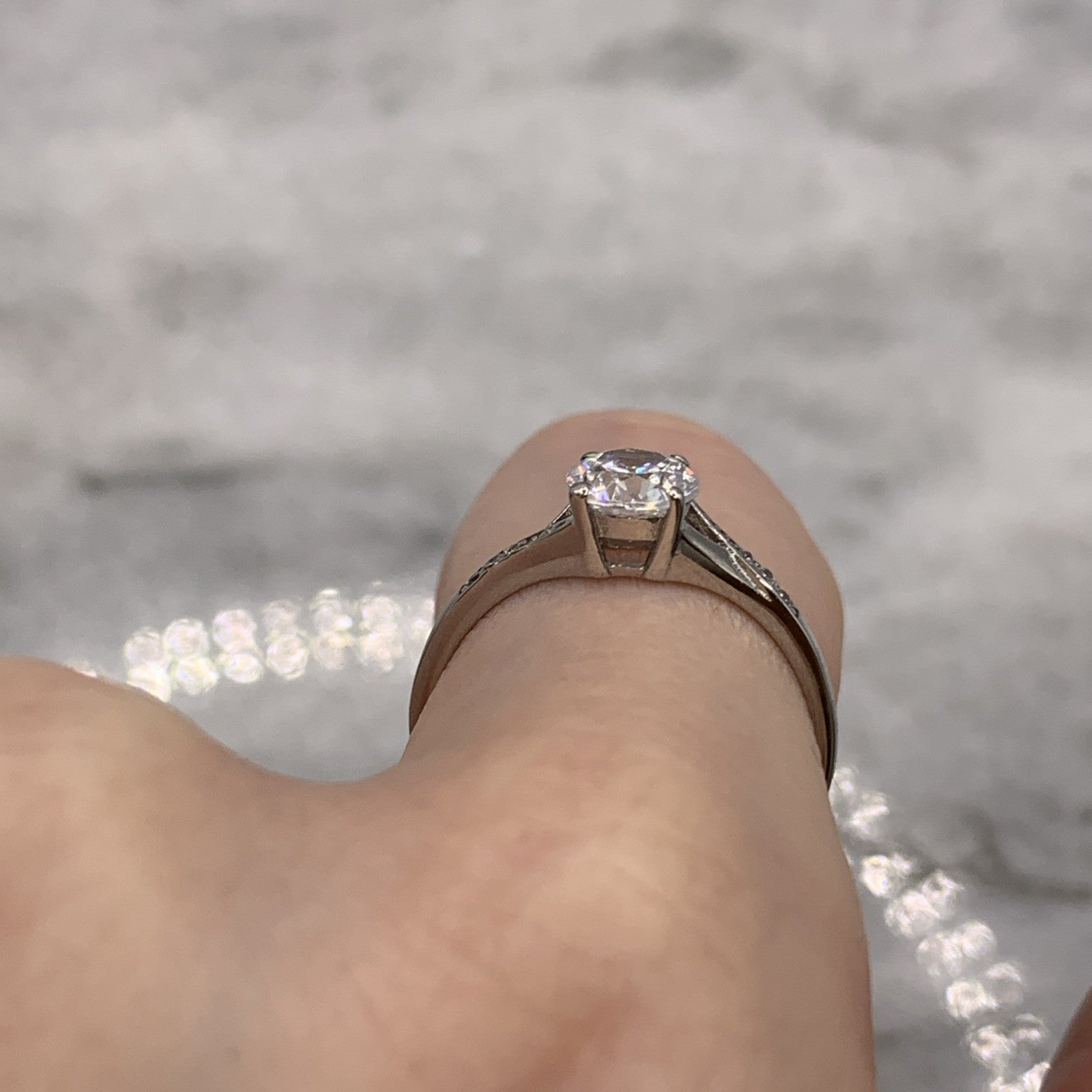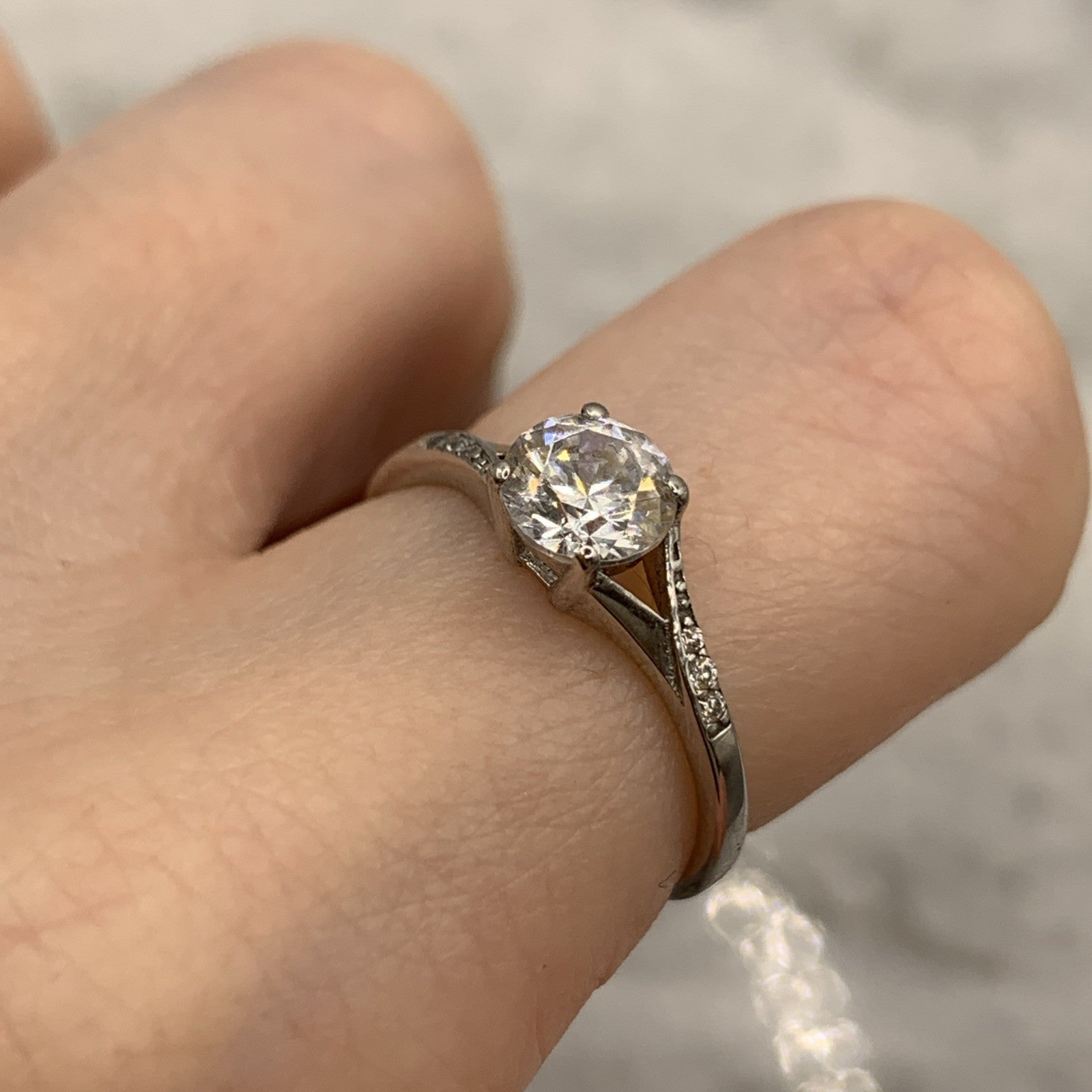 A beautiful white gold ring showcasing a round cut cubic zirconia gemstone upon twist style shoulders with additional petite CZ accents.