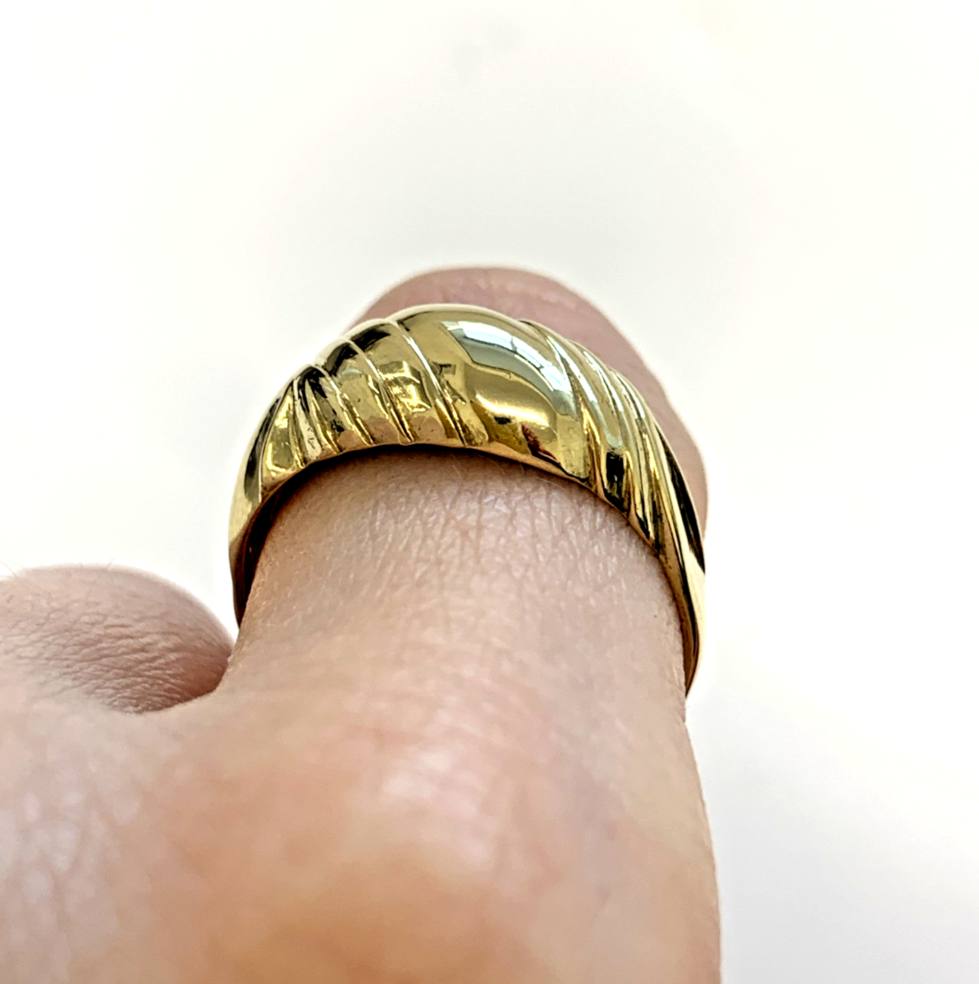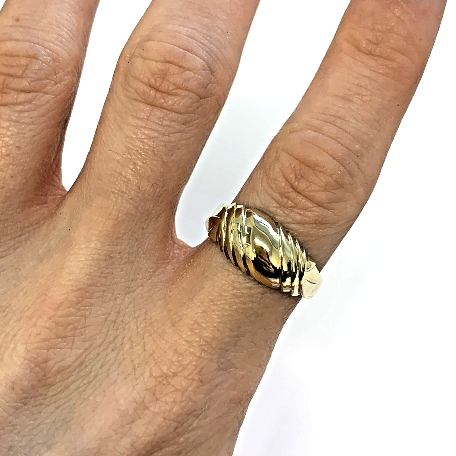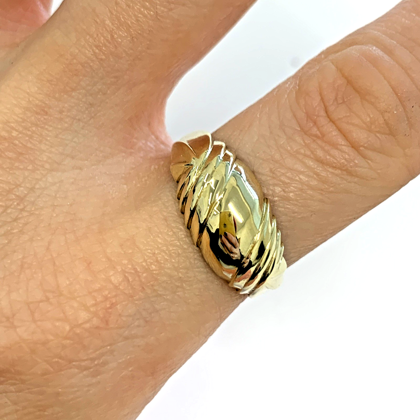 A simple charming gold band ring crafted in a twisted dome shape.