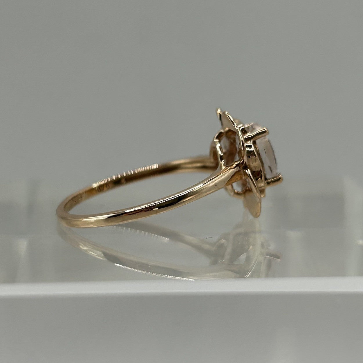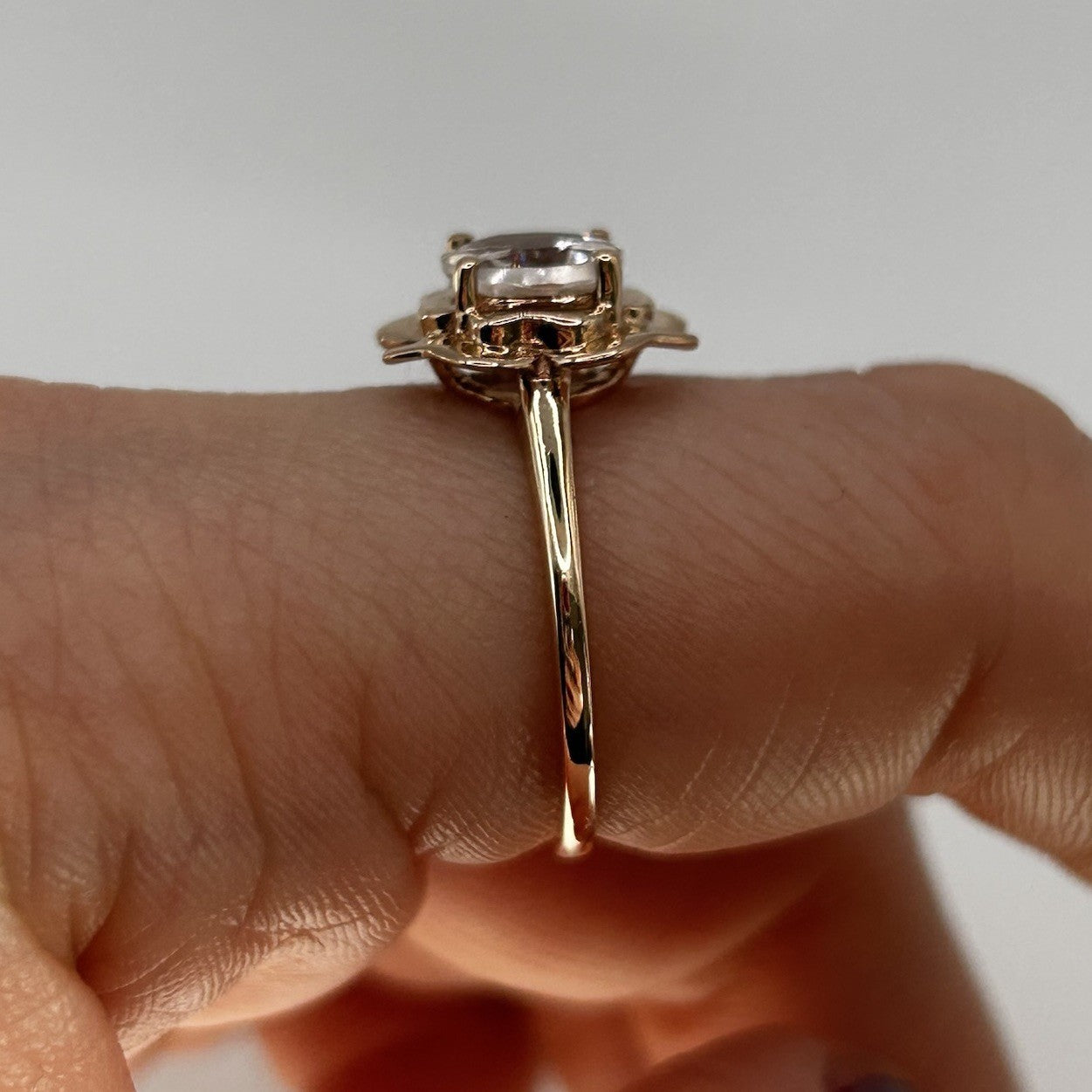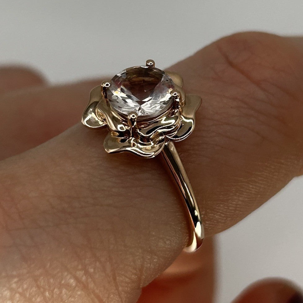 A stunning rose gold ring showcasing an ornate Alto Ligontha morganite gemstone at 1.13ct, accented by clover petal edge detailing.