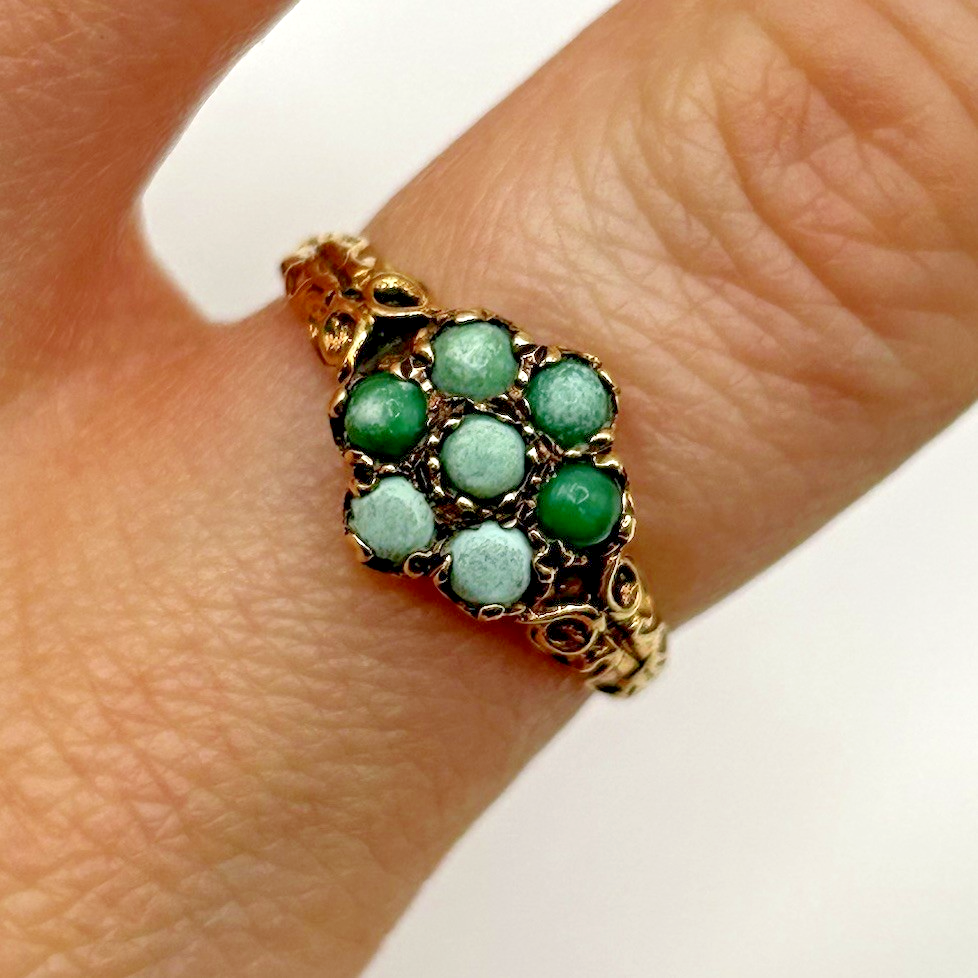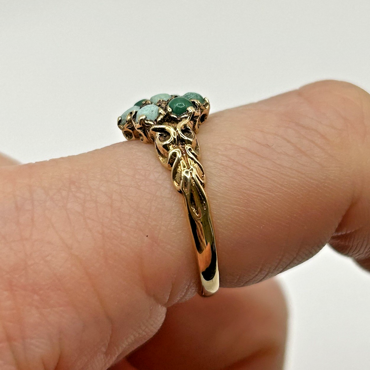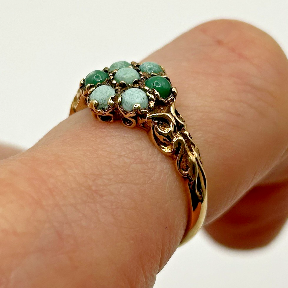 A unique gold ring showcasing a daisy flower style cluster of cabochon turquoise, accented by shoulders with intricate carved detail.