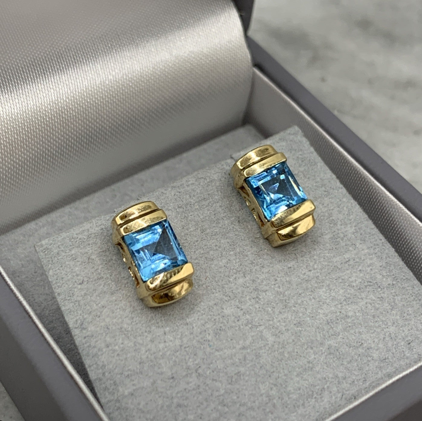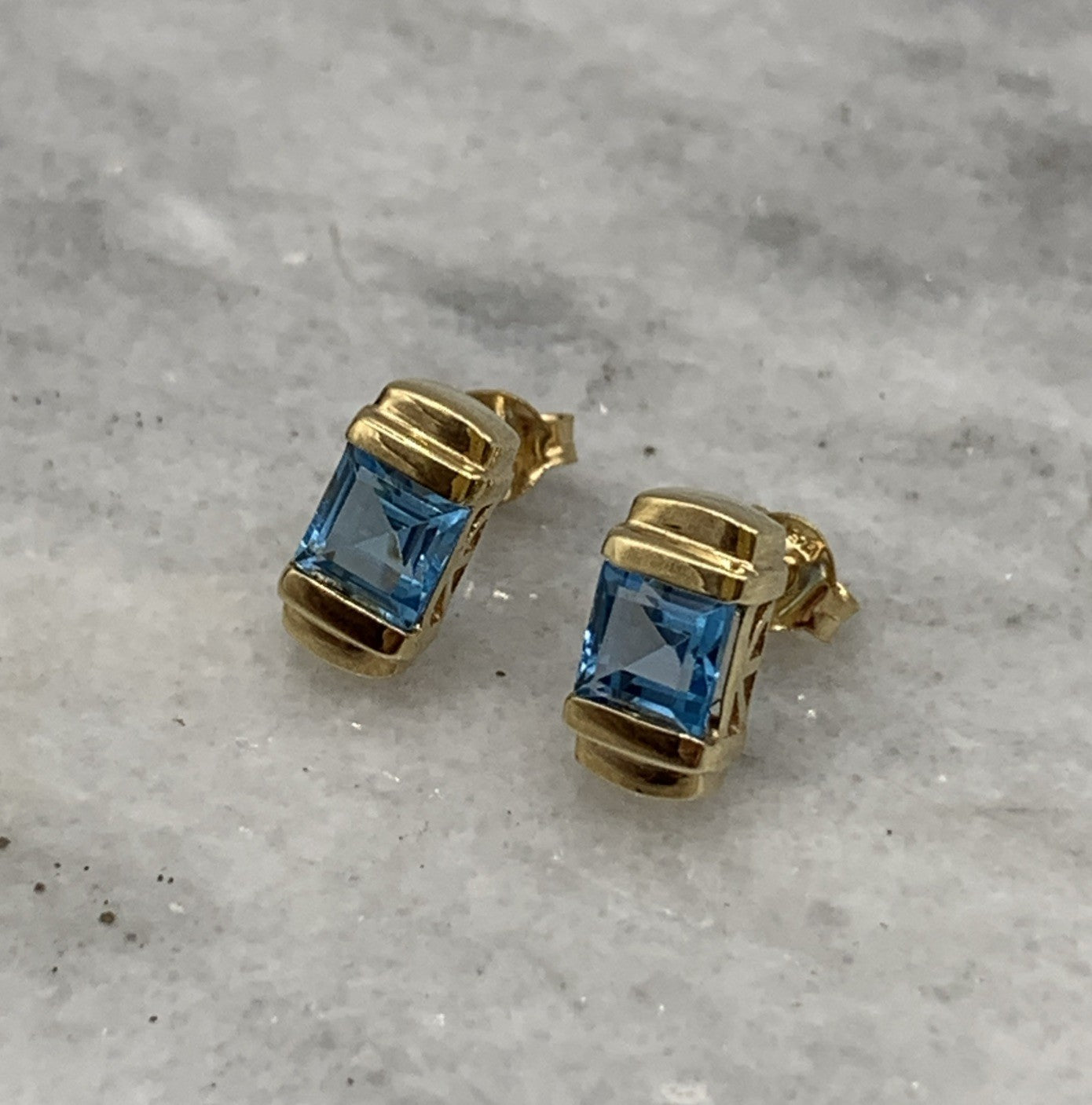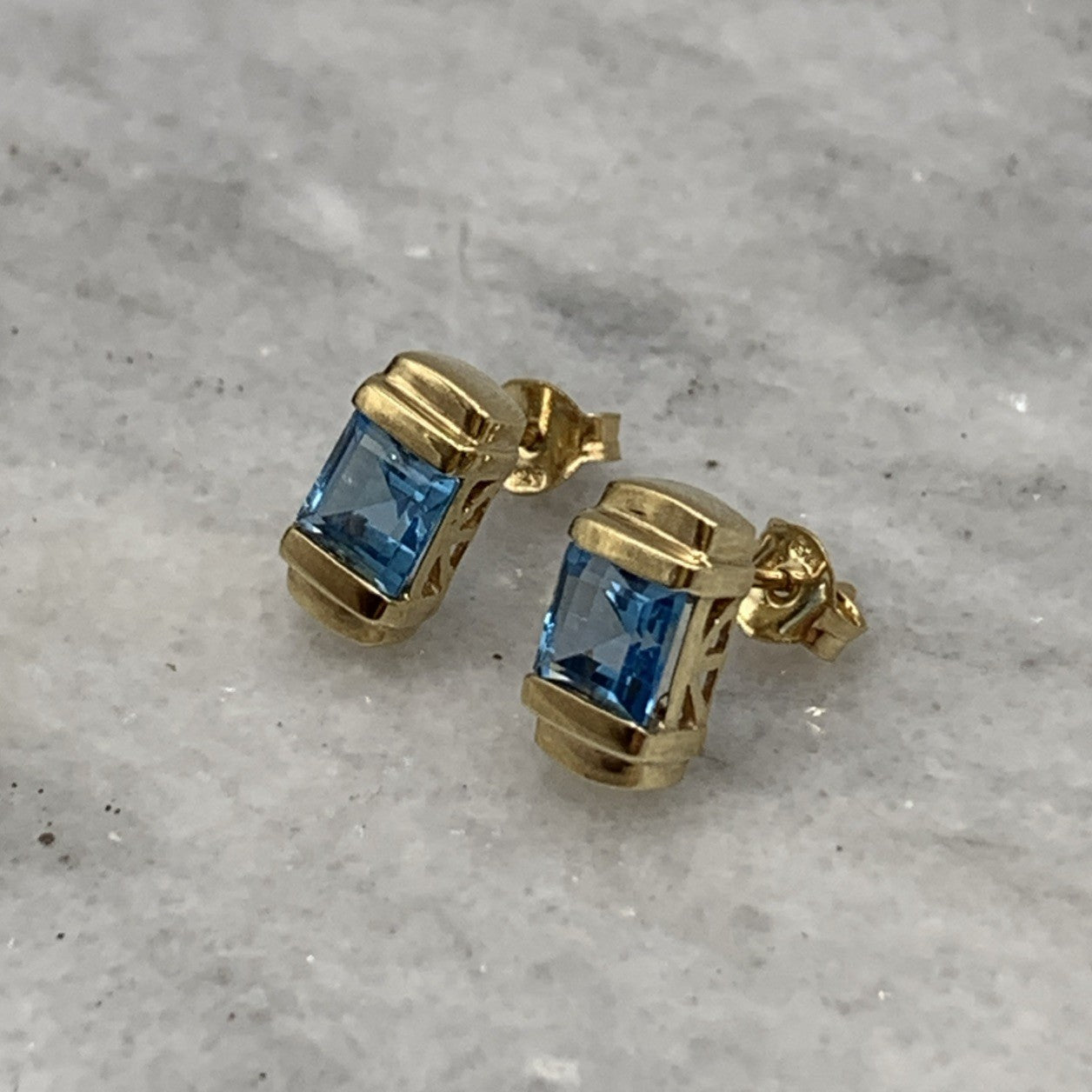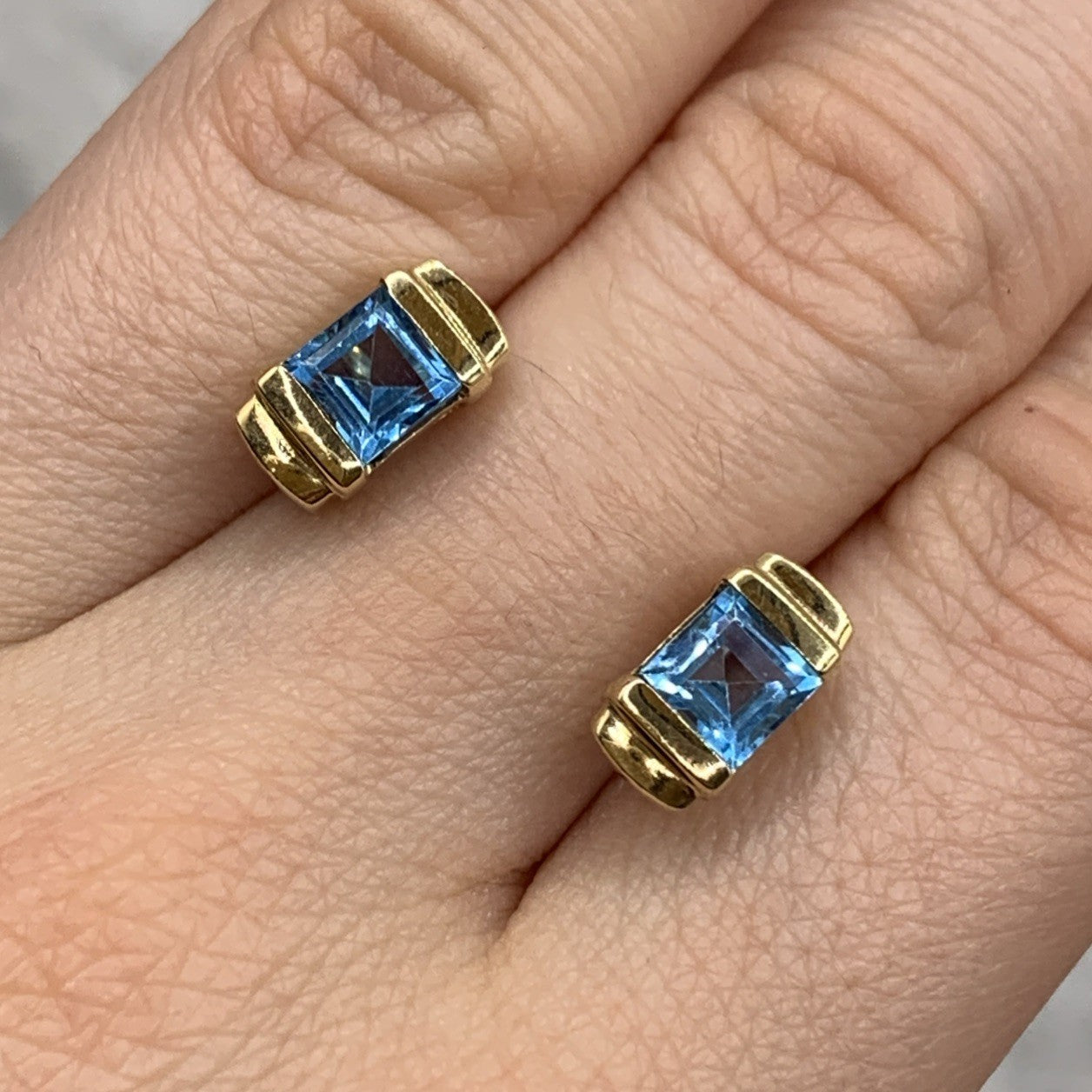 9ct Gold Blue Topaz Princess Cut Stud Earrings 375 Yellow Gold