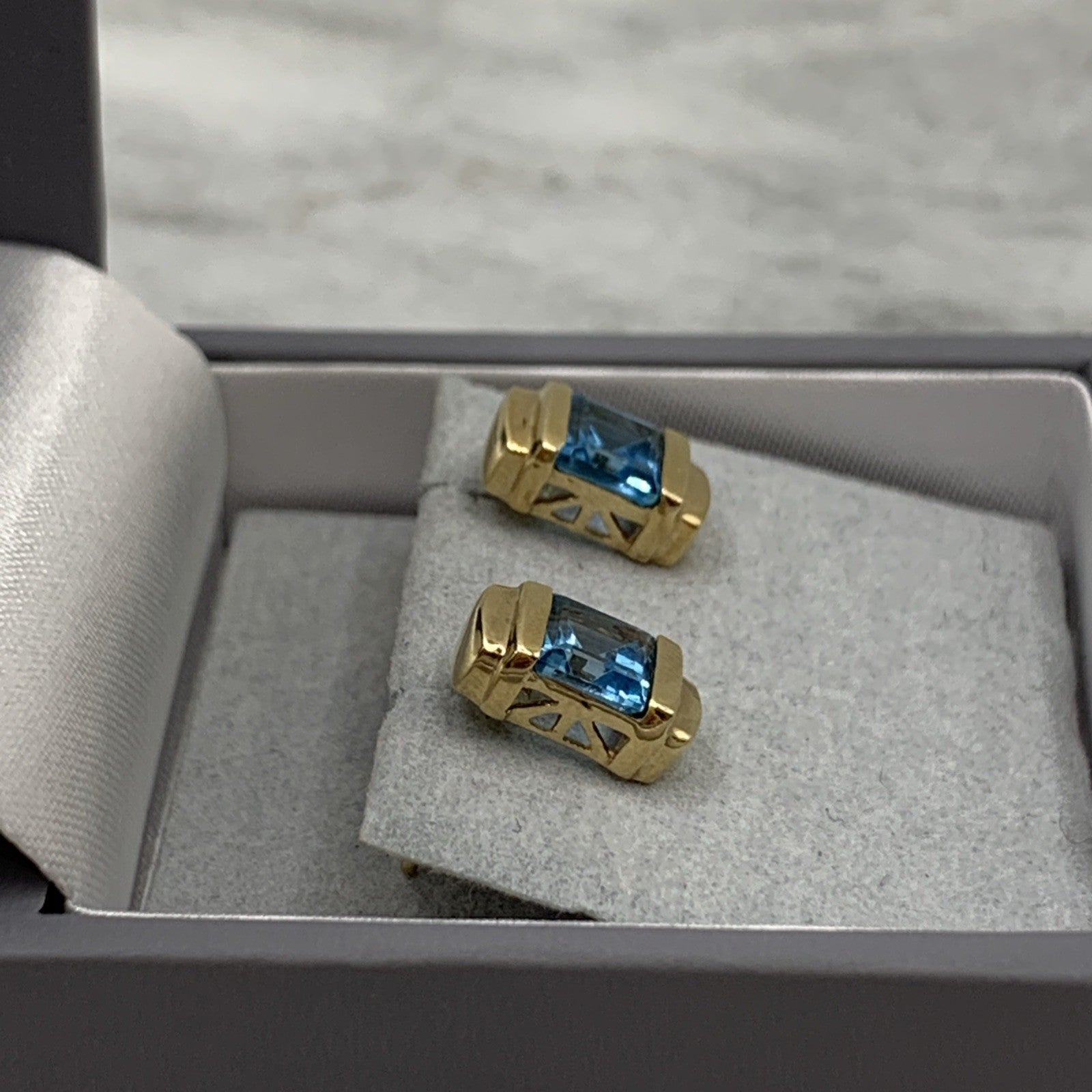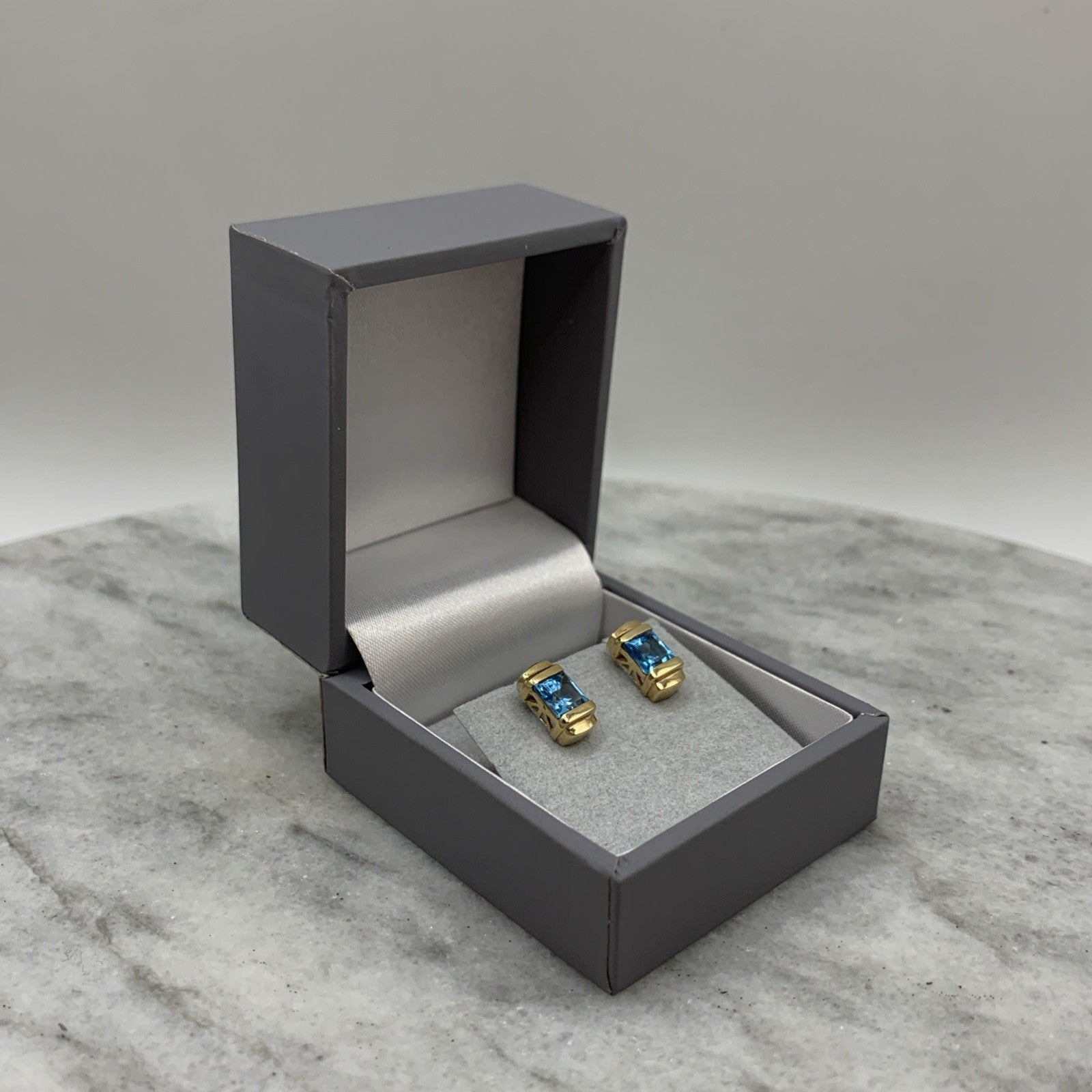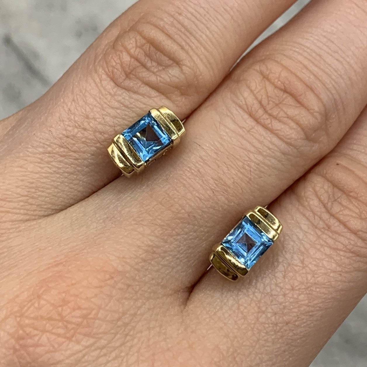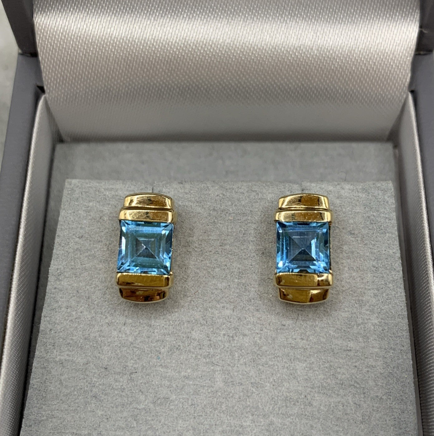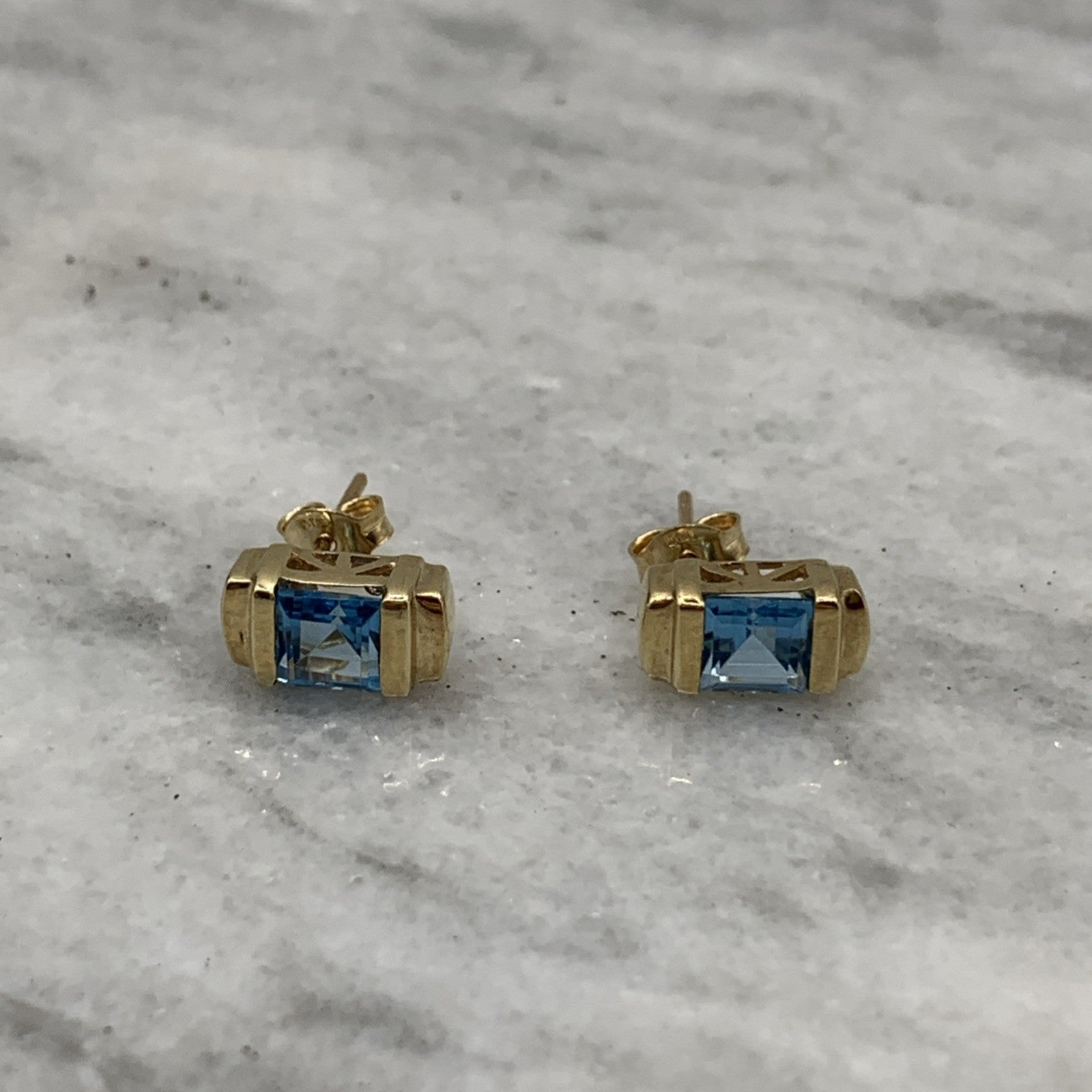9ct Gold Blue Topaz Princess Cut Stud Earrings 375 Yellow Gold