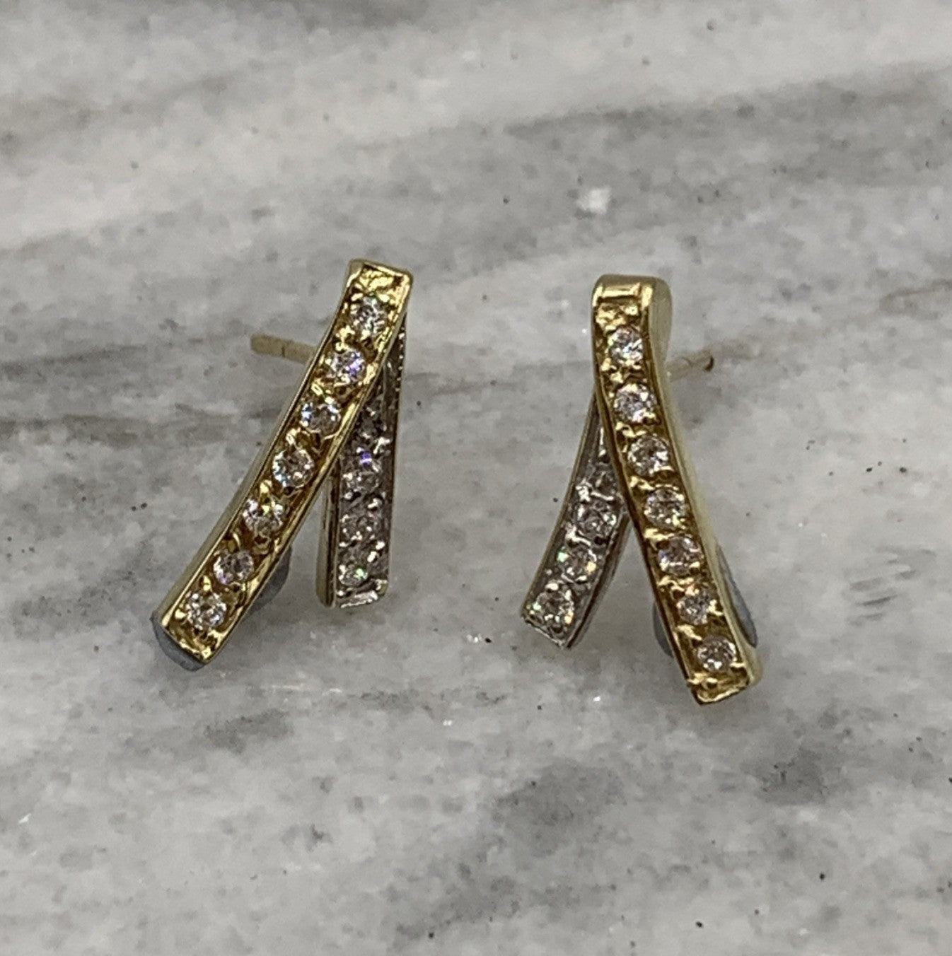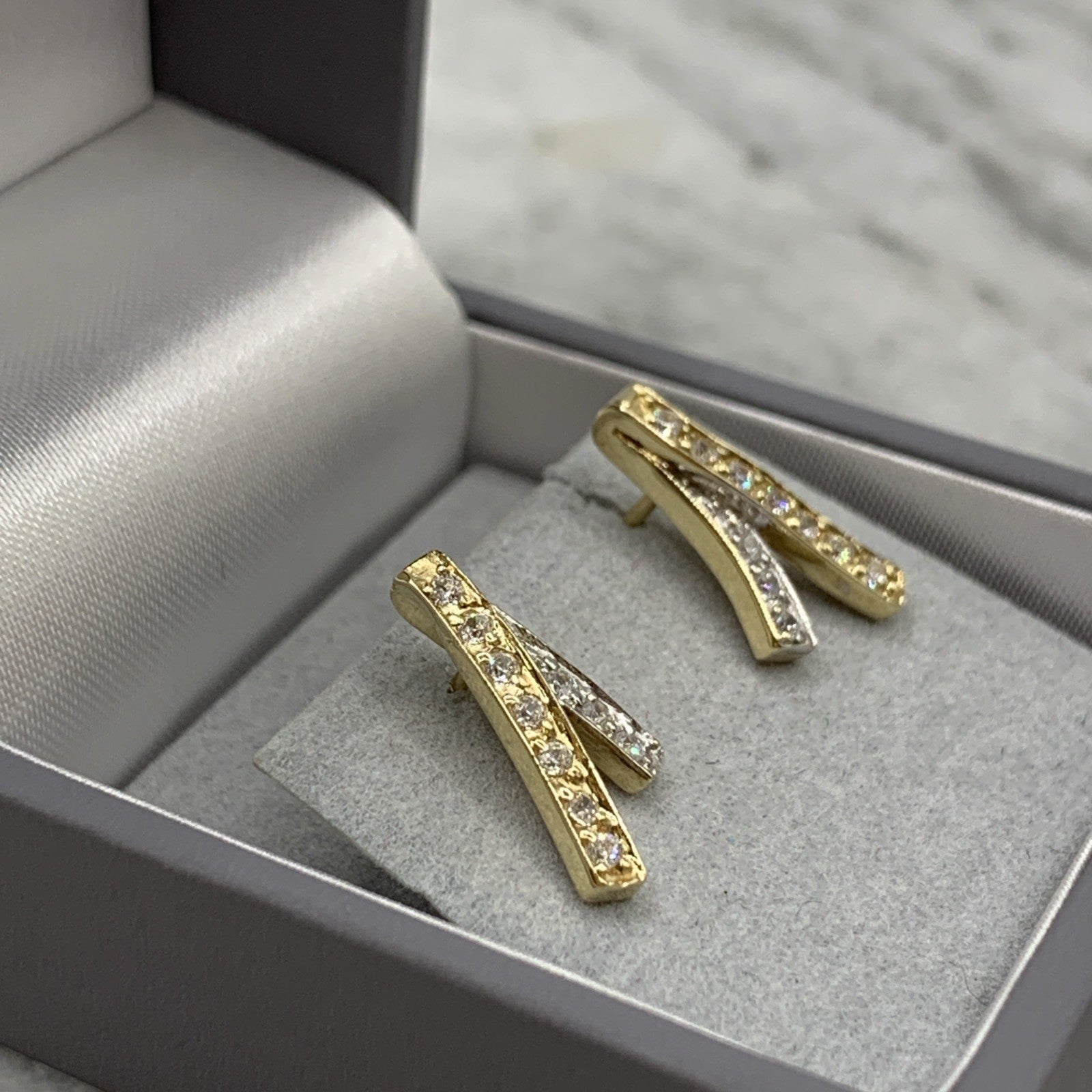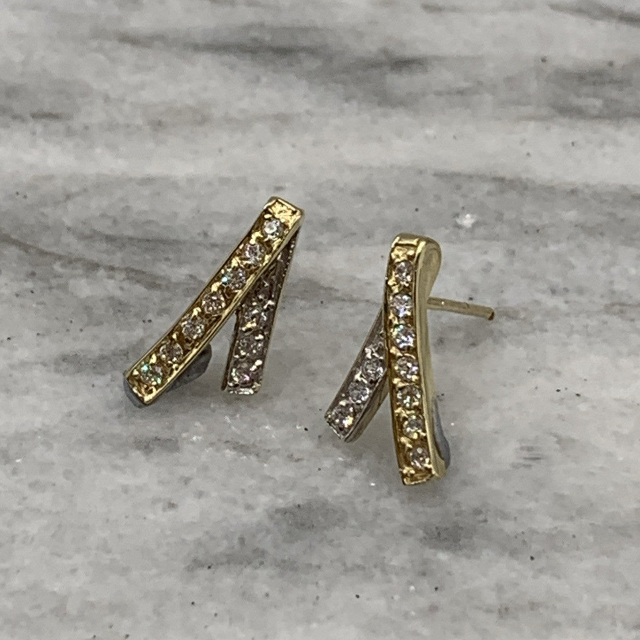 A gorgeous pair of two tone gold stud earrings in a ribbon shape, adorned with cubic zirconia gemstones.