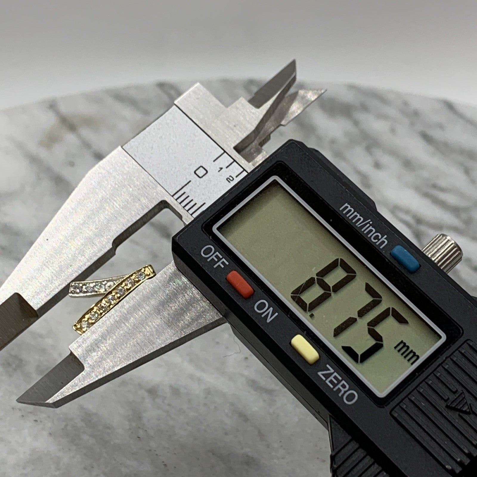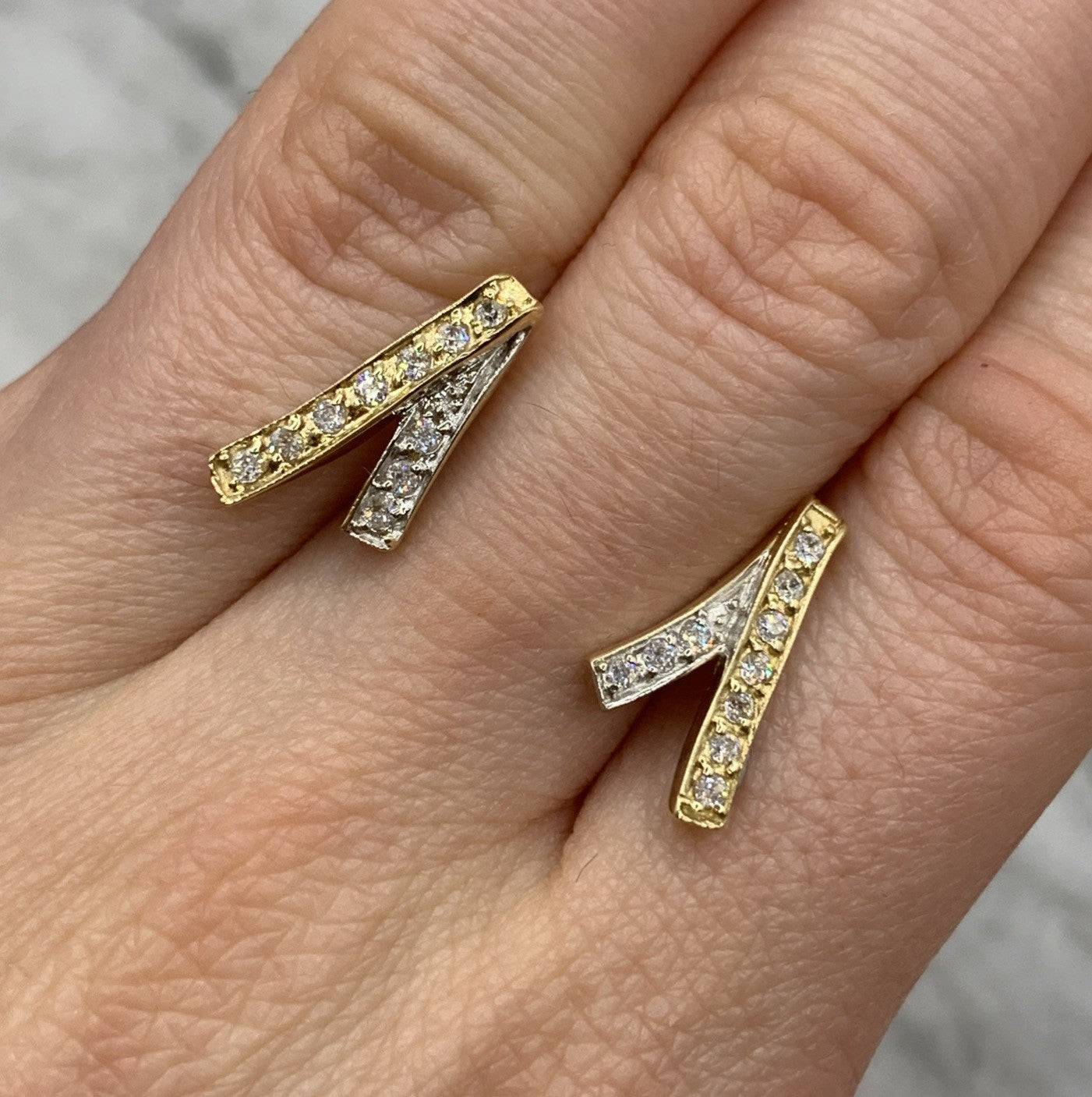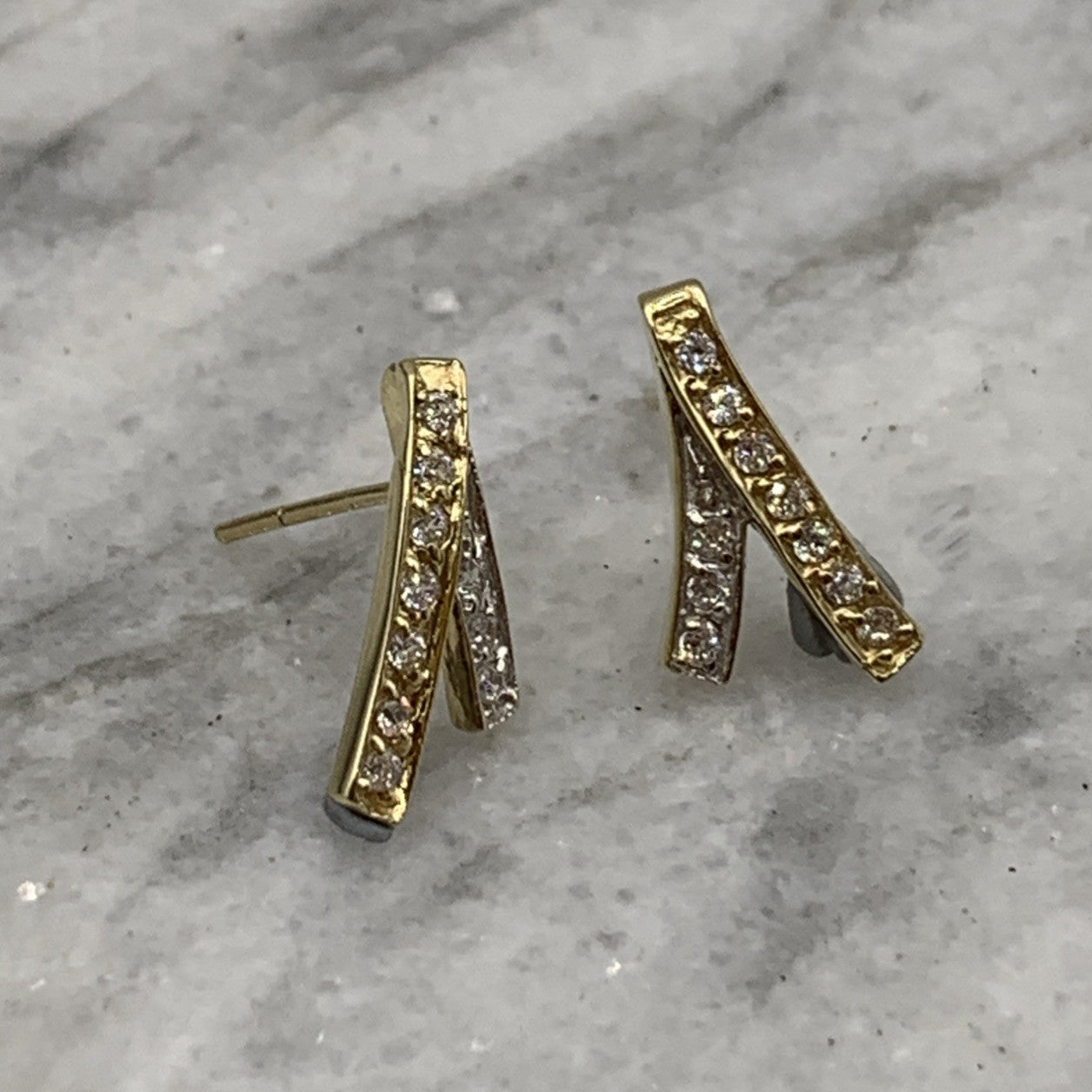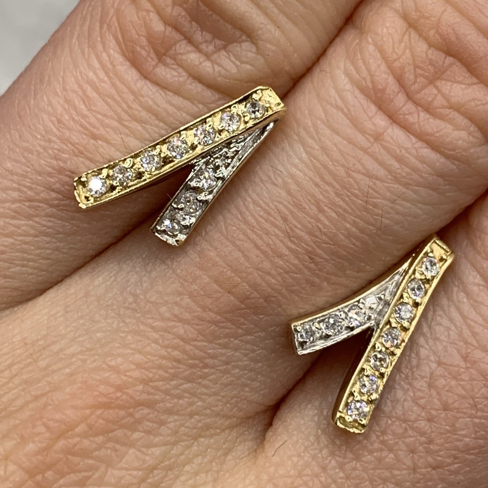A gorgeous pair of two tone gold stud earrings in a ribbon shape, adorned with cubic zirconia gemstones.