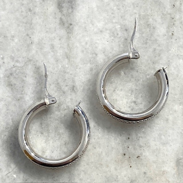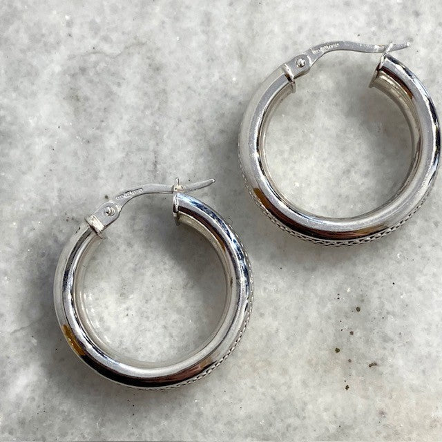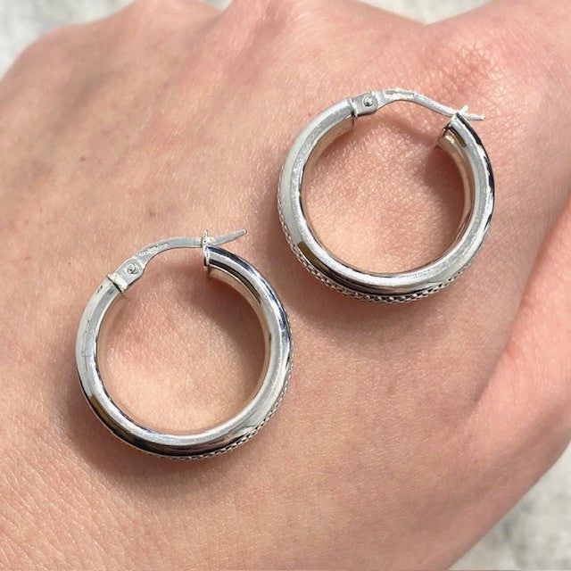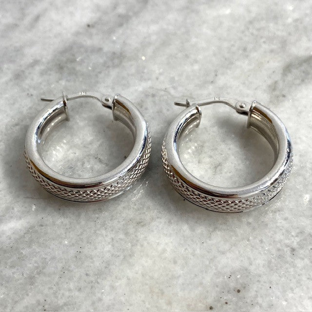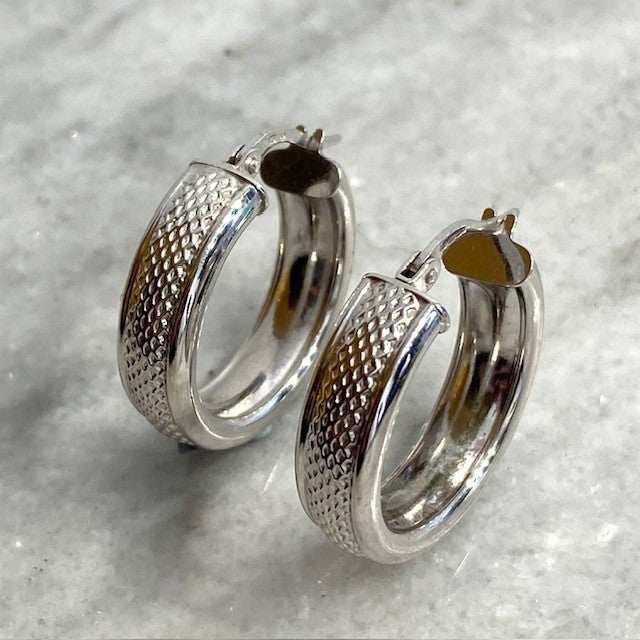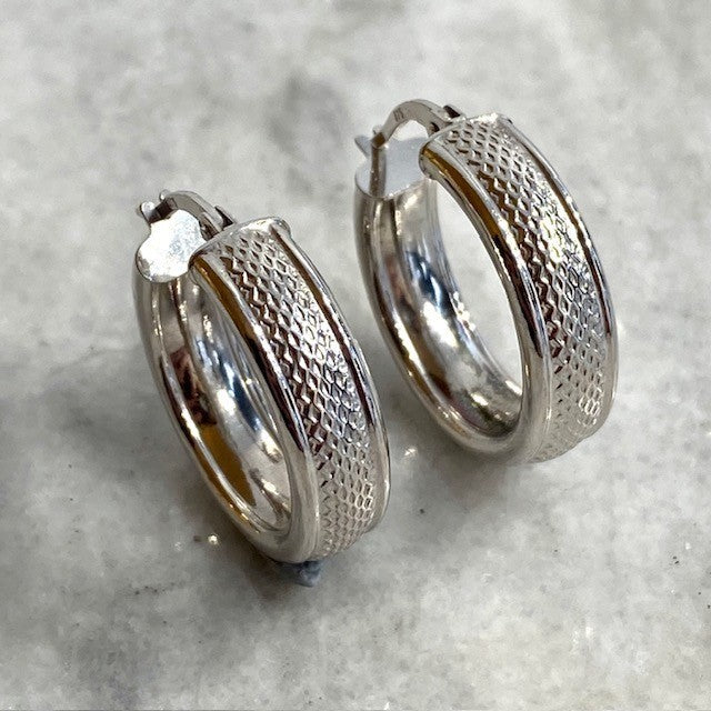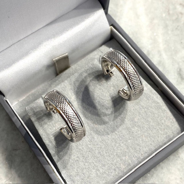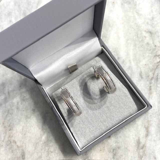 9ct Gold Hoop Earrings Hatch Textured Chunky Design 375 White Gold