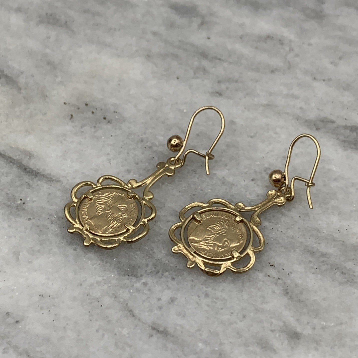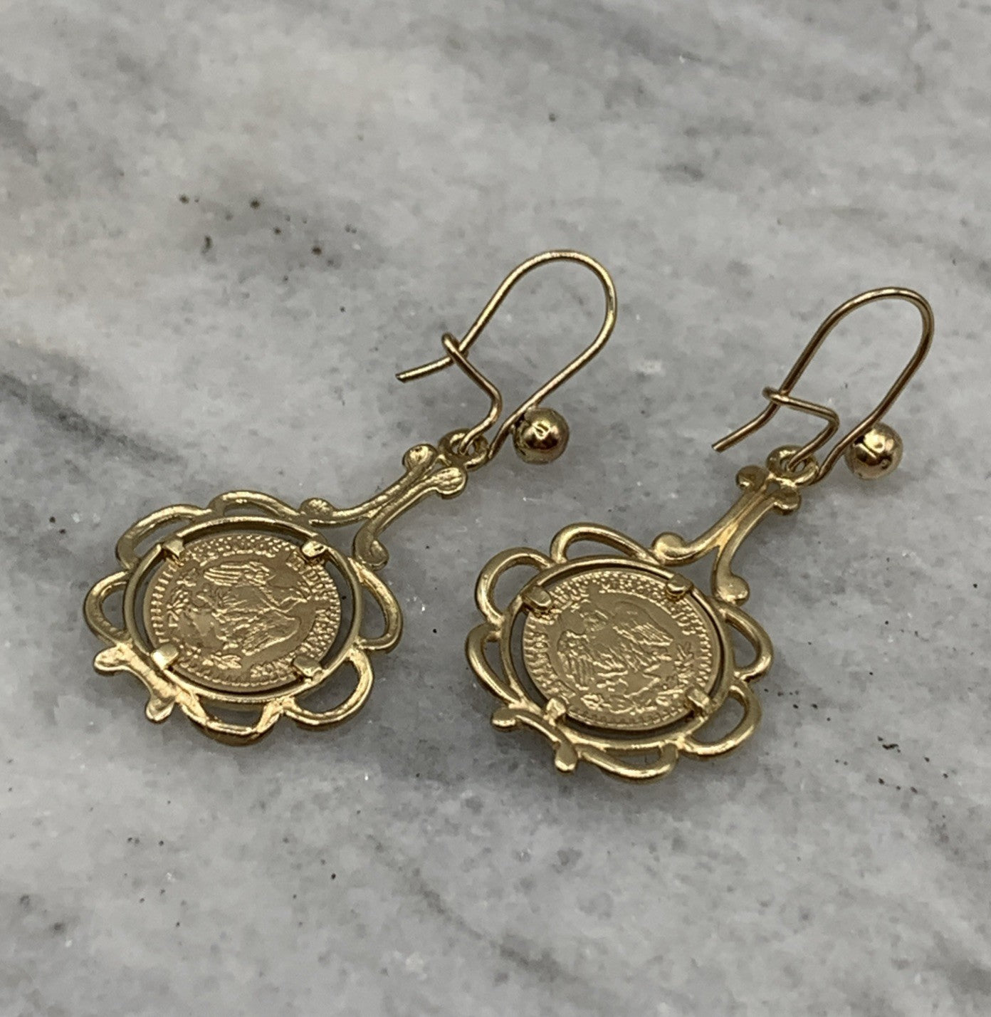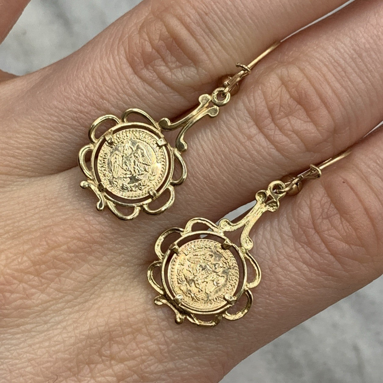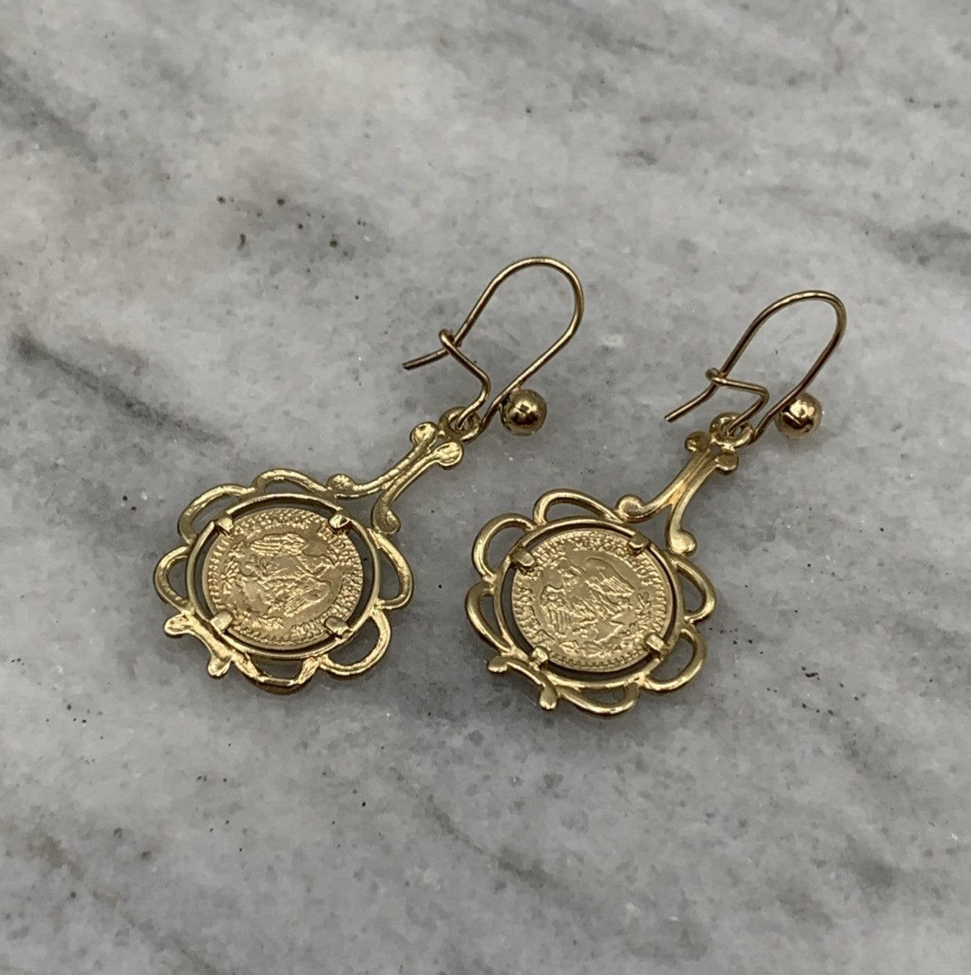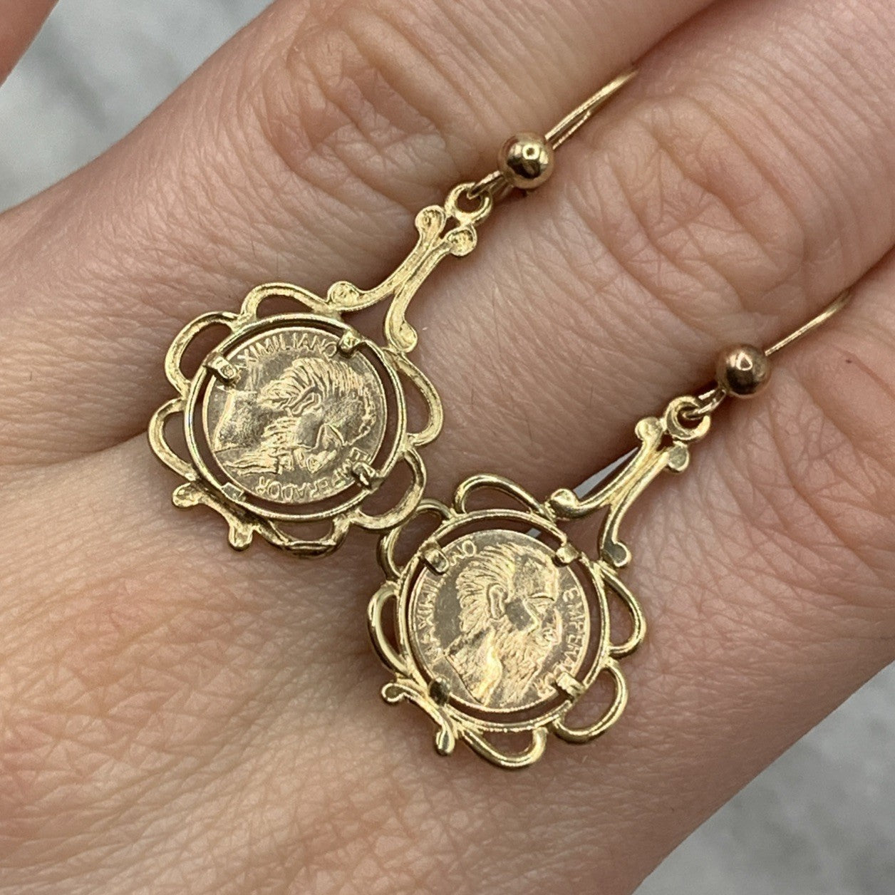 A lovely pair of gold kidney wire style earrings featuring Maximiliano Emperador coins within a decorative frame.