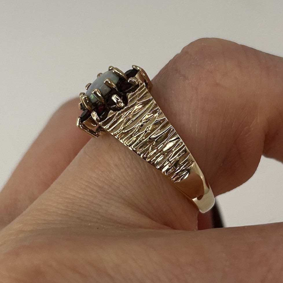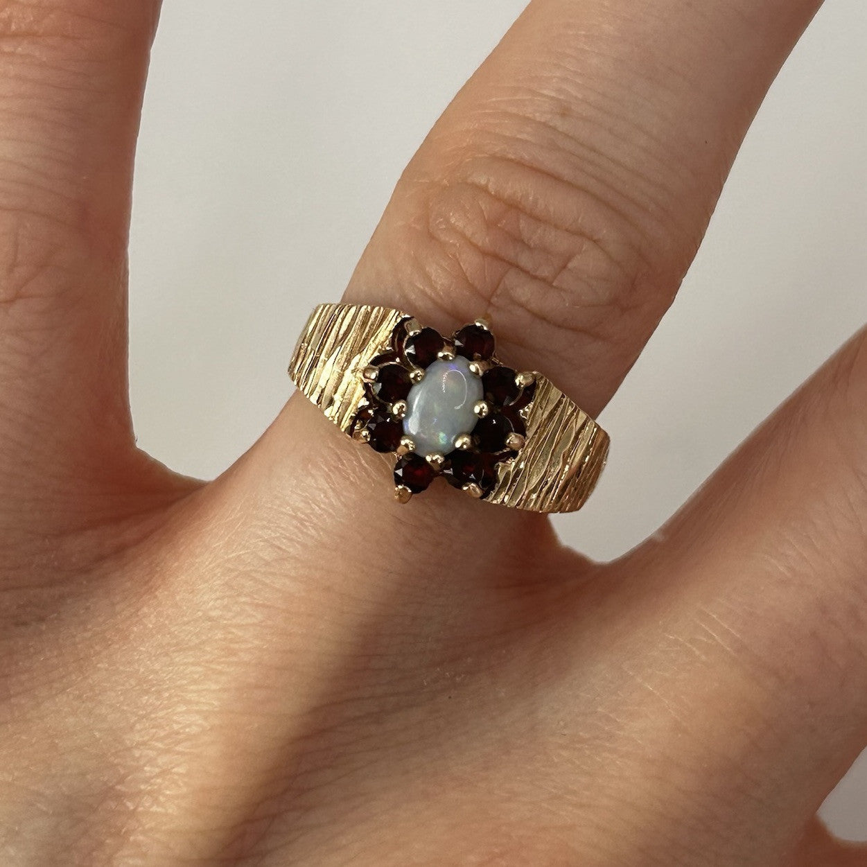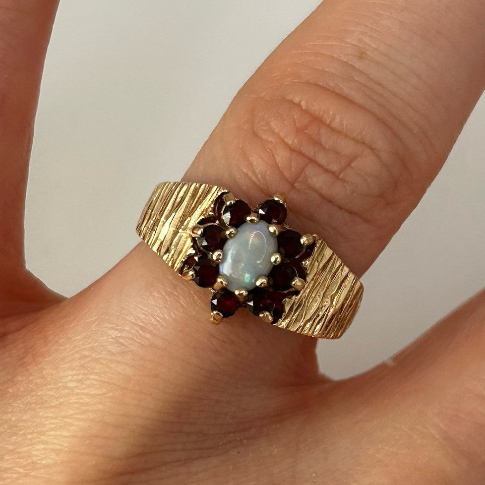 A stunning gold ring showcasing an opal, clustered with garnets in a floral formation, further accented by bark finishing on the shoulders.
