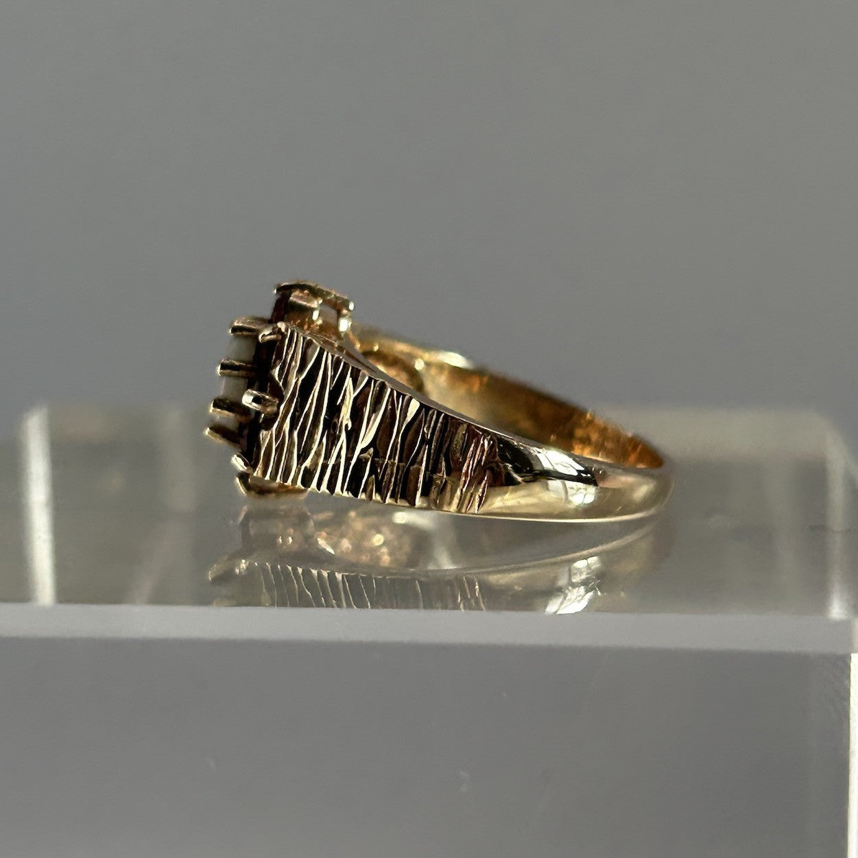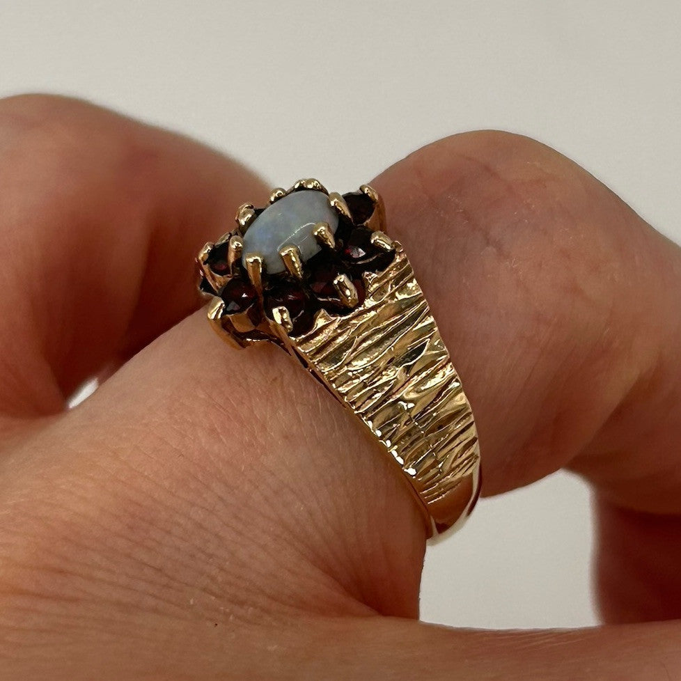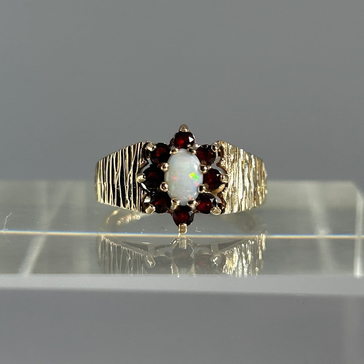 A stunning gold ring showcasing an opal, clustered with garnets in a floral formation, further accented by bark finishing on the shoulders.