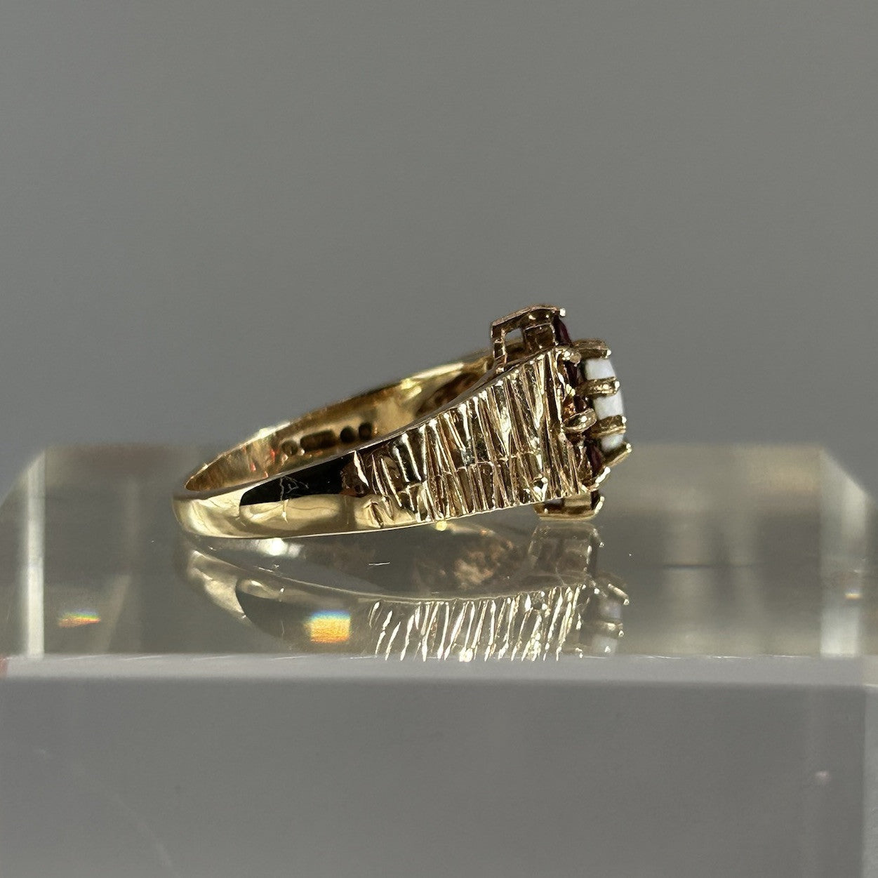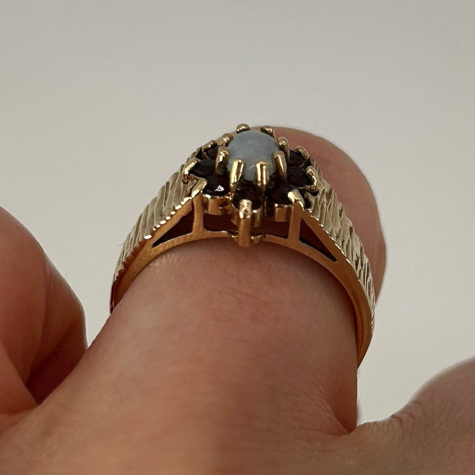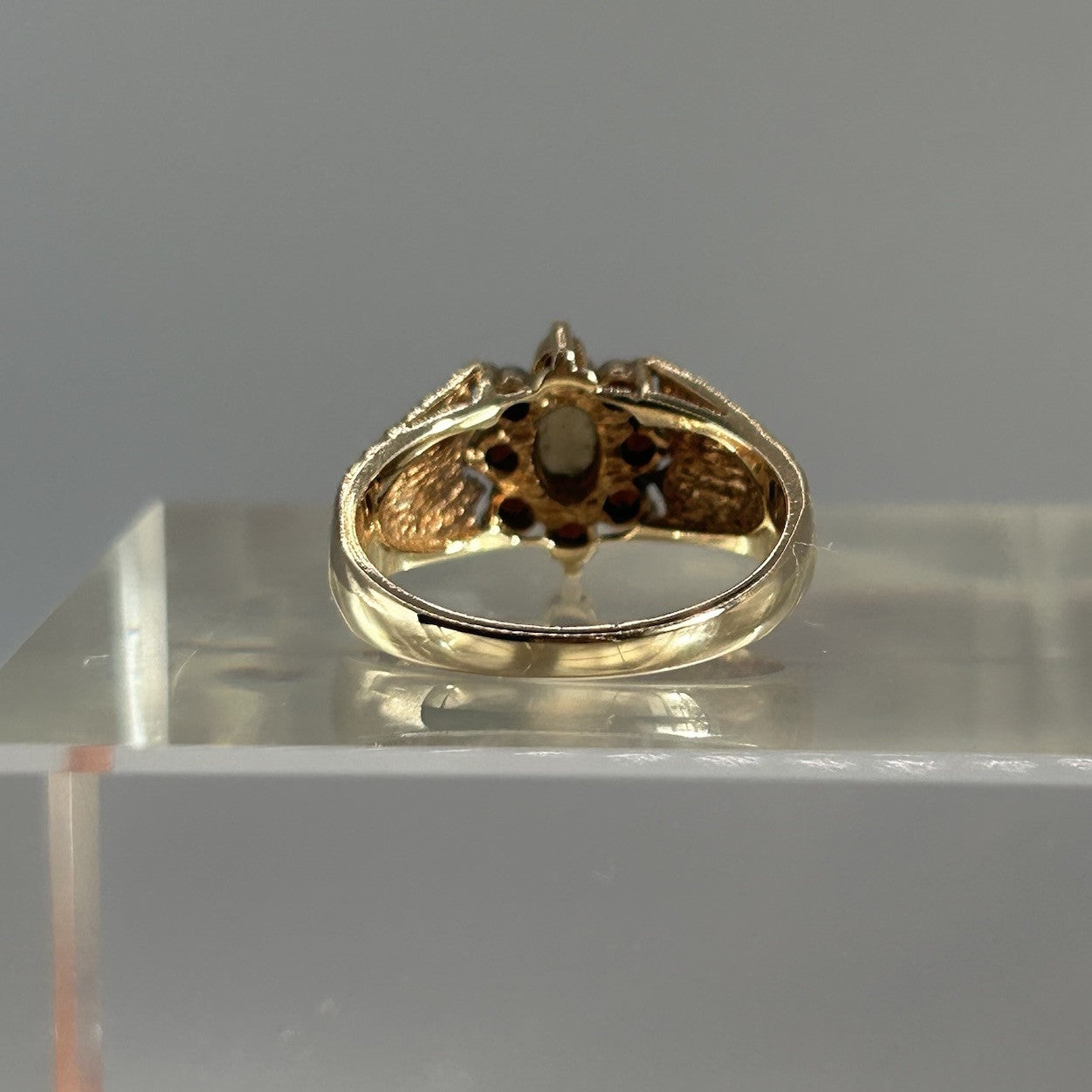 Opal & Garnet Halo Cluster Textured Ring 9ct 9k Yellow Gold - Size M