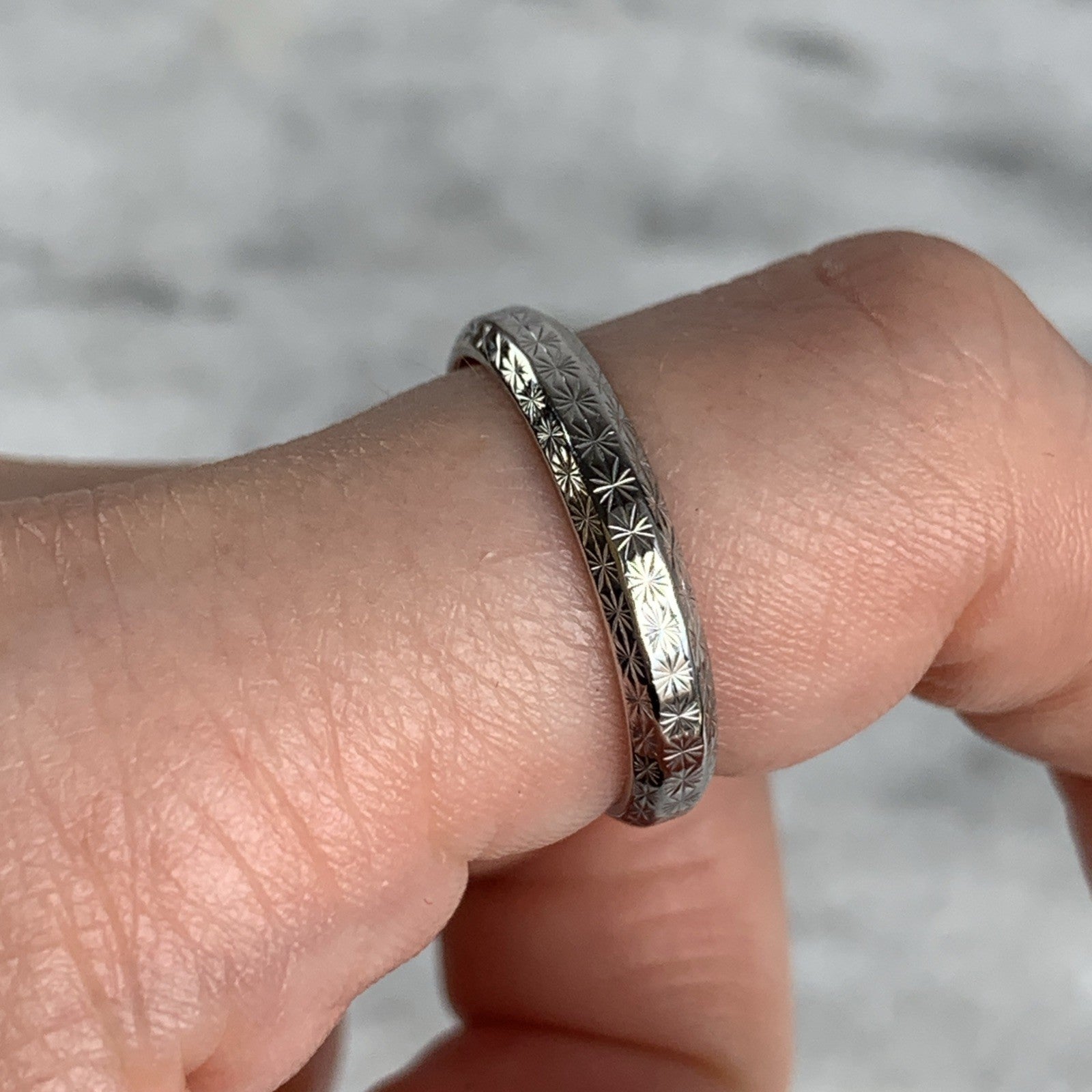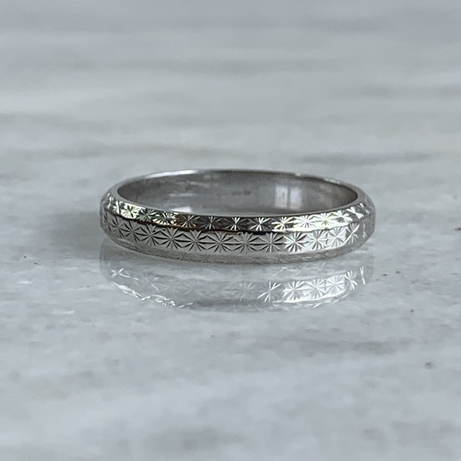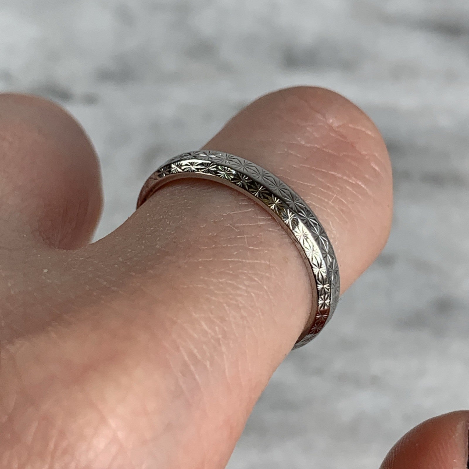 A timeless white gold patterned wedding band ring.