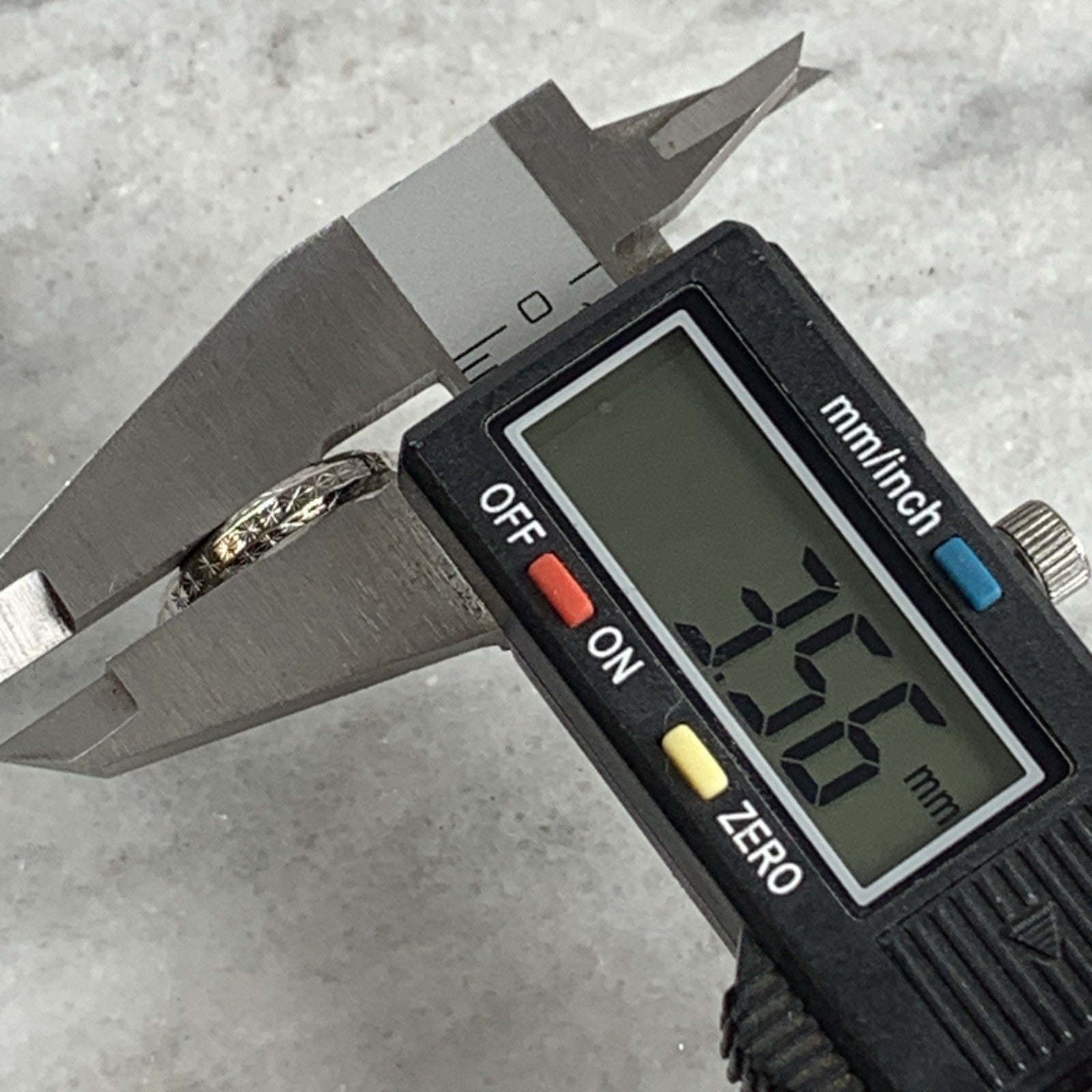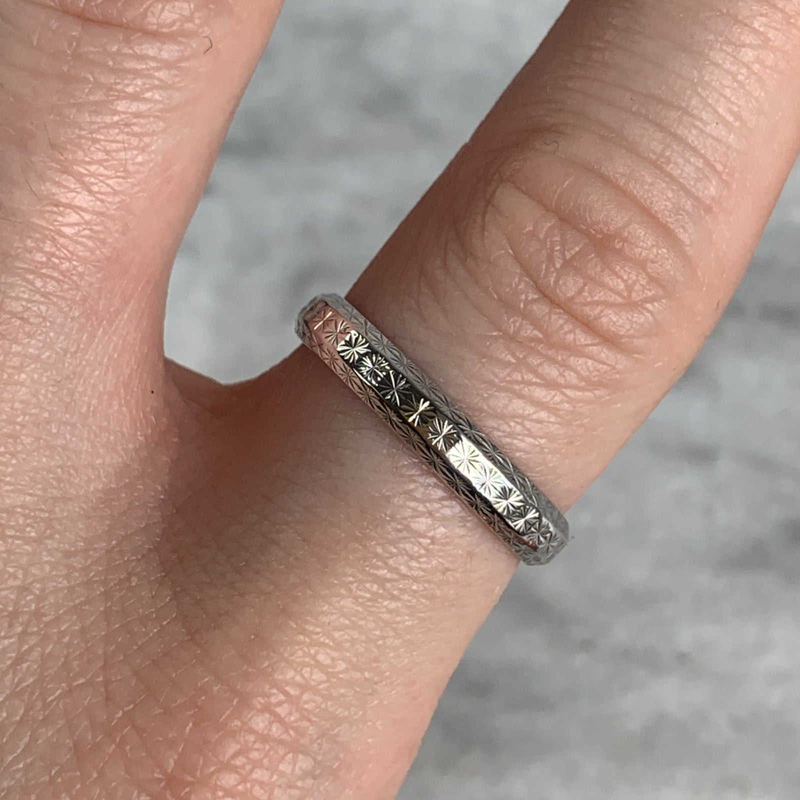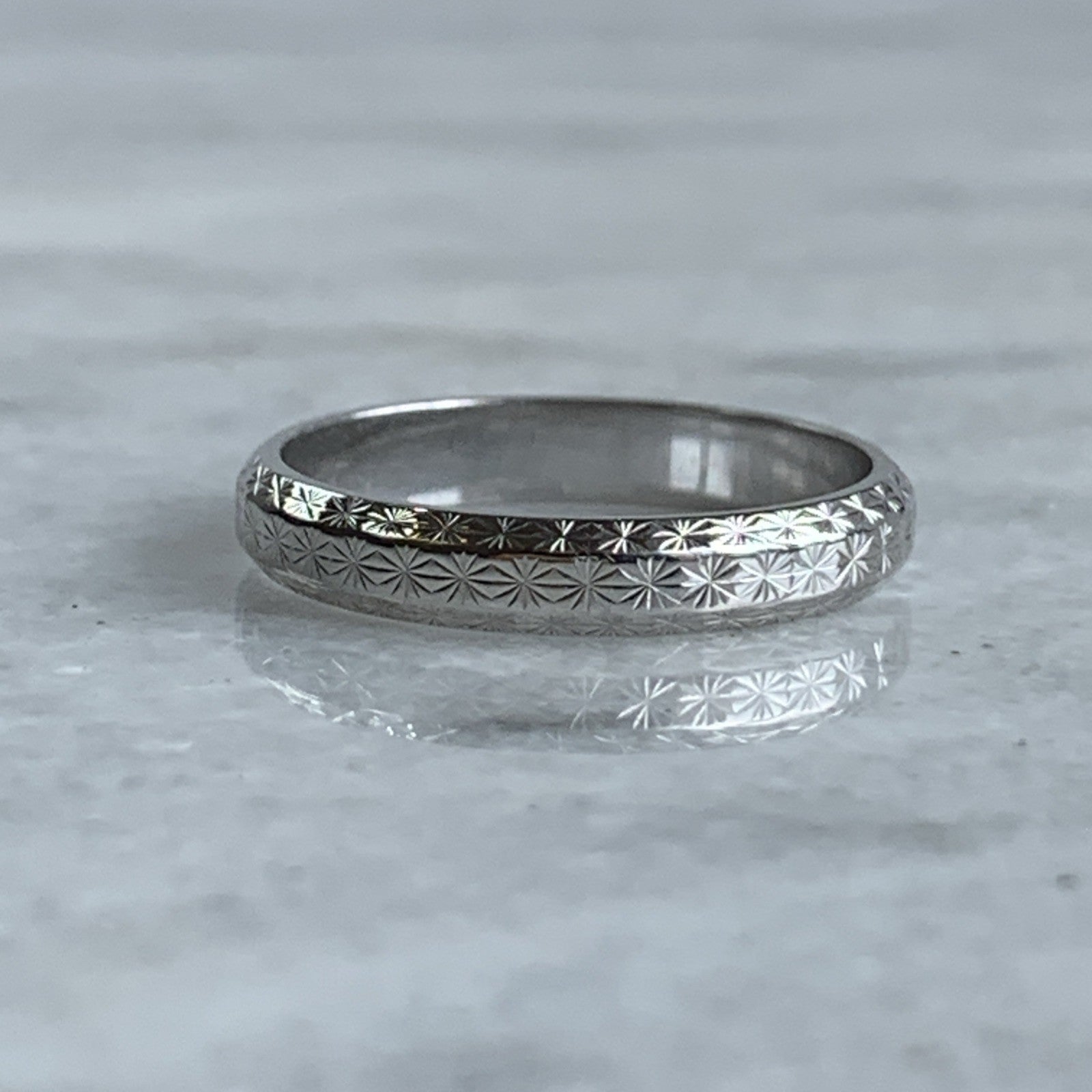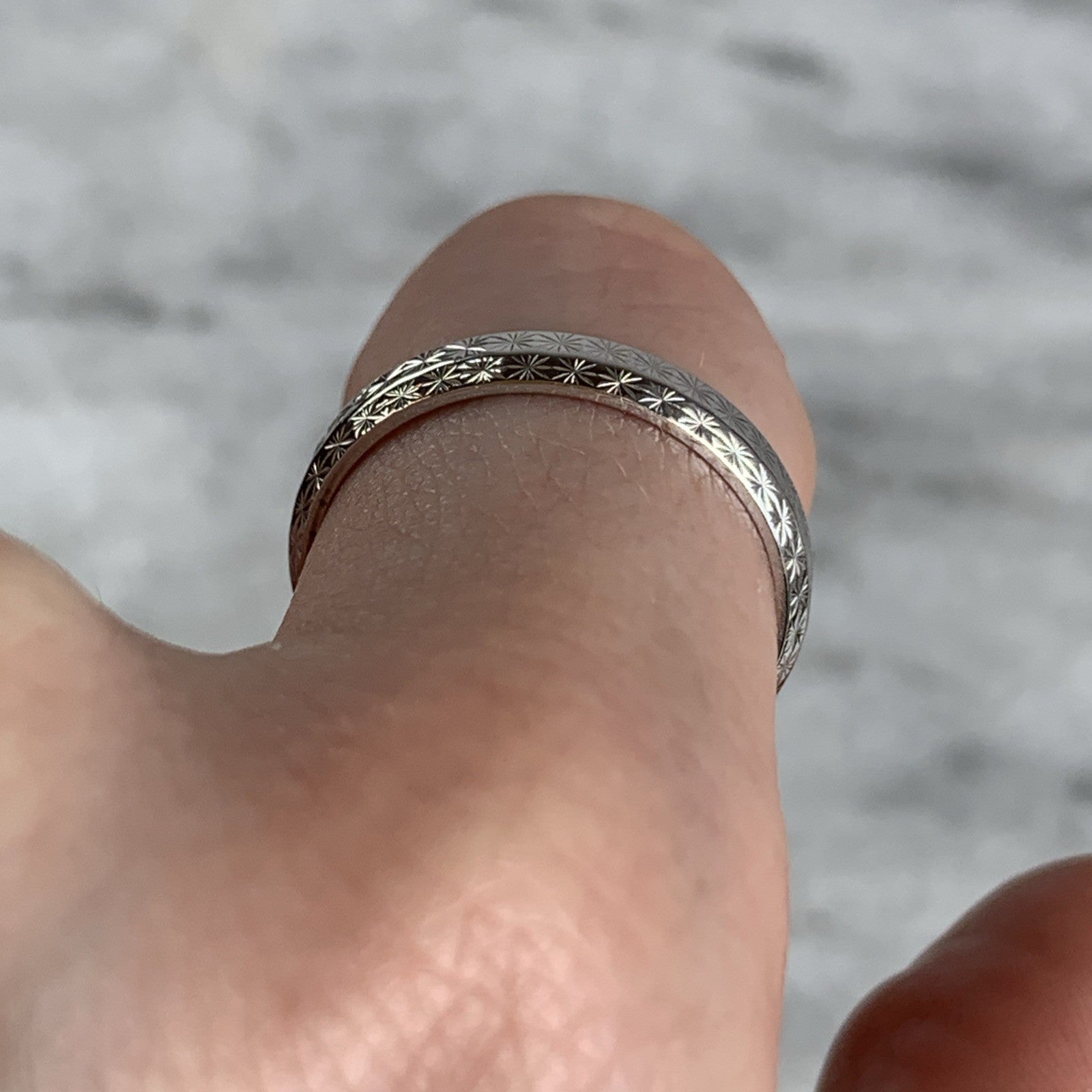 A timeless white gold patterned wedding band ring.
