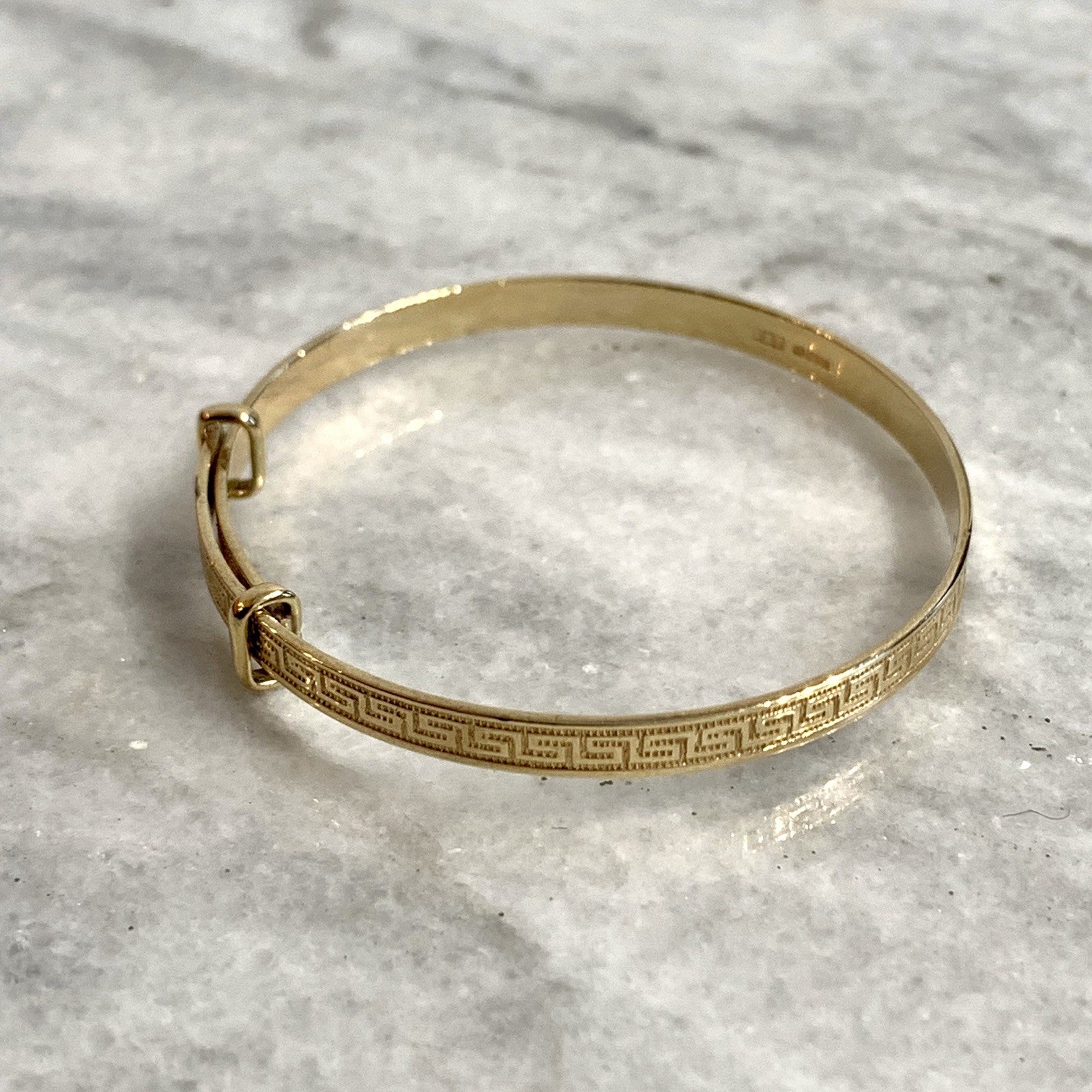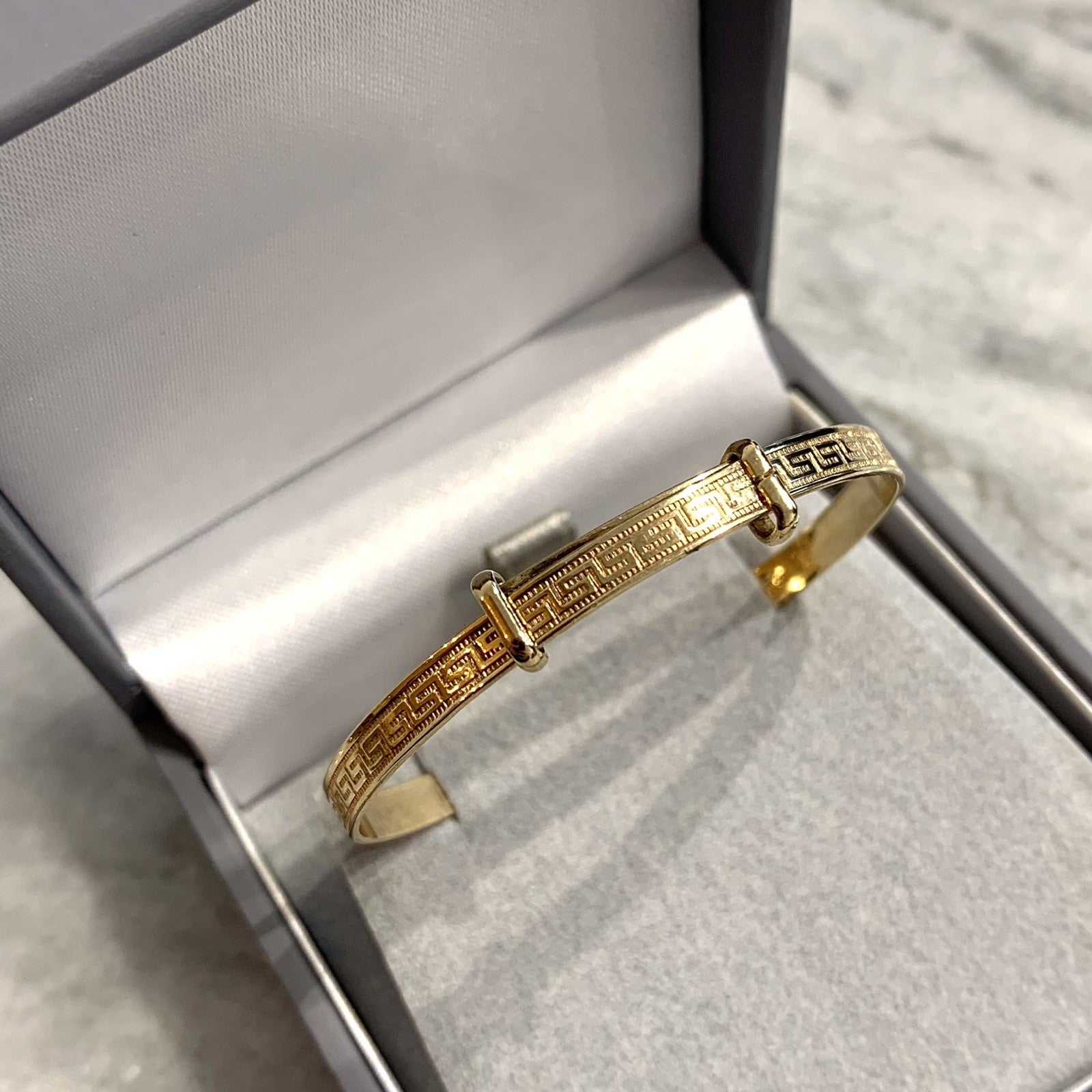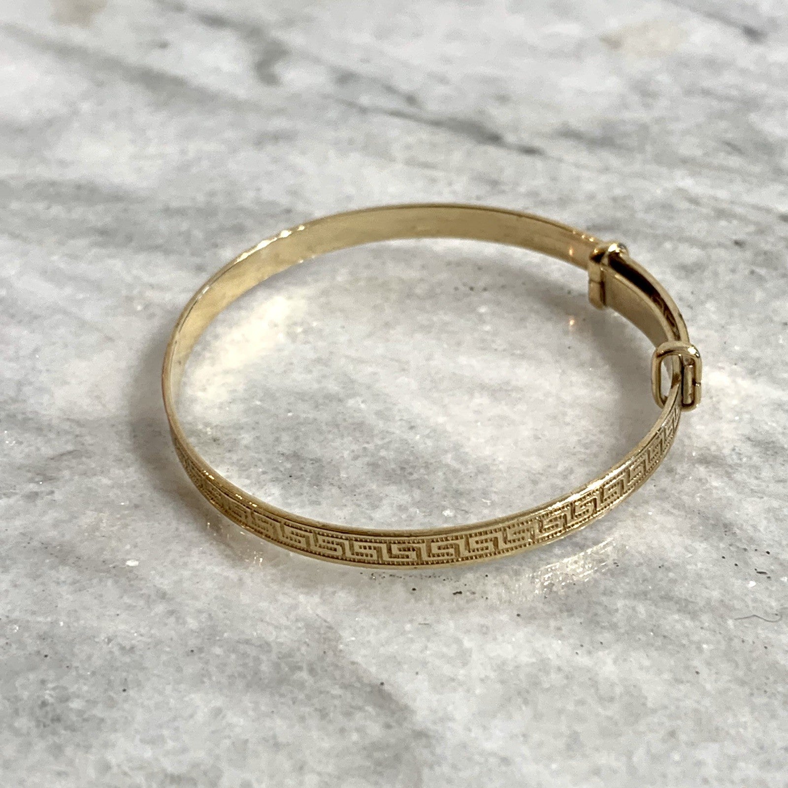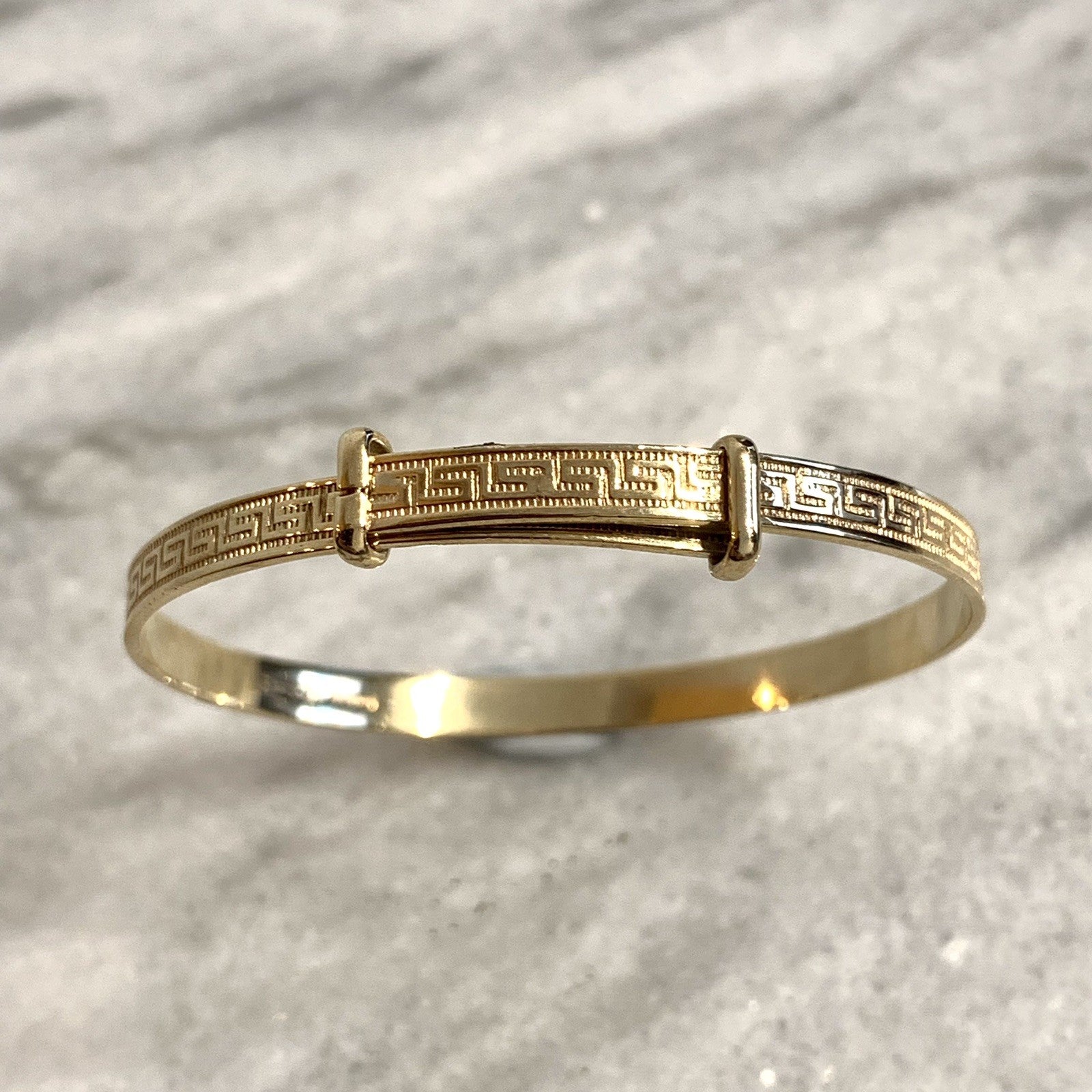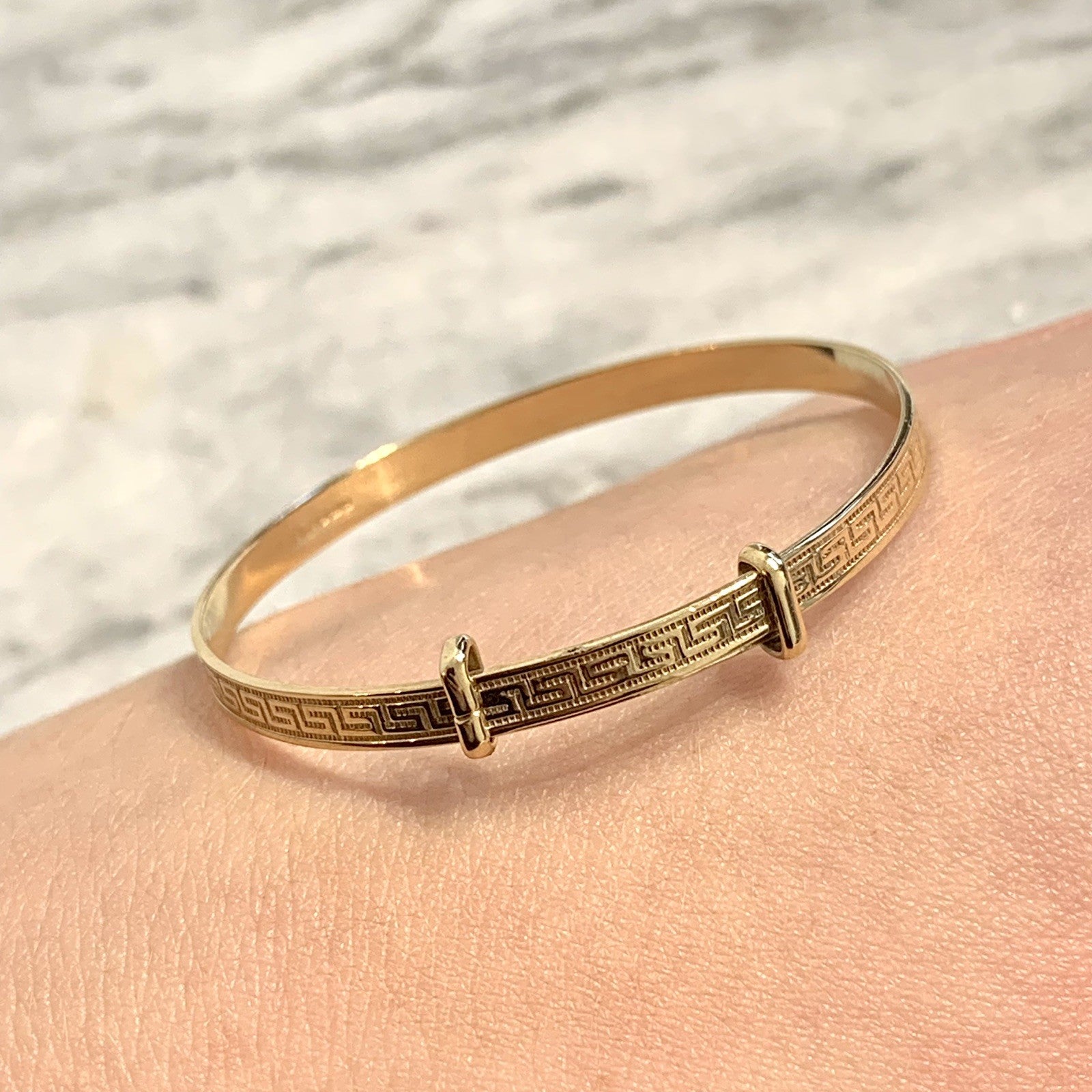 - A classic baby bangle bracelet with a Greek key style patterned embossed throughout. Adjustable.