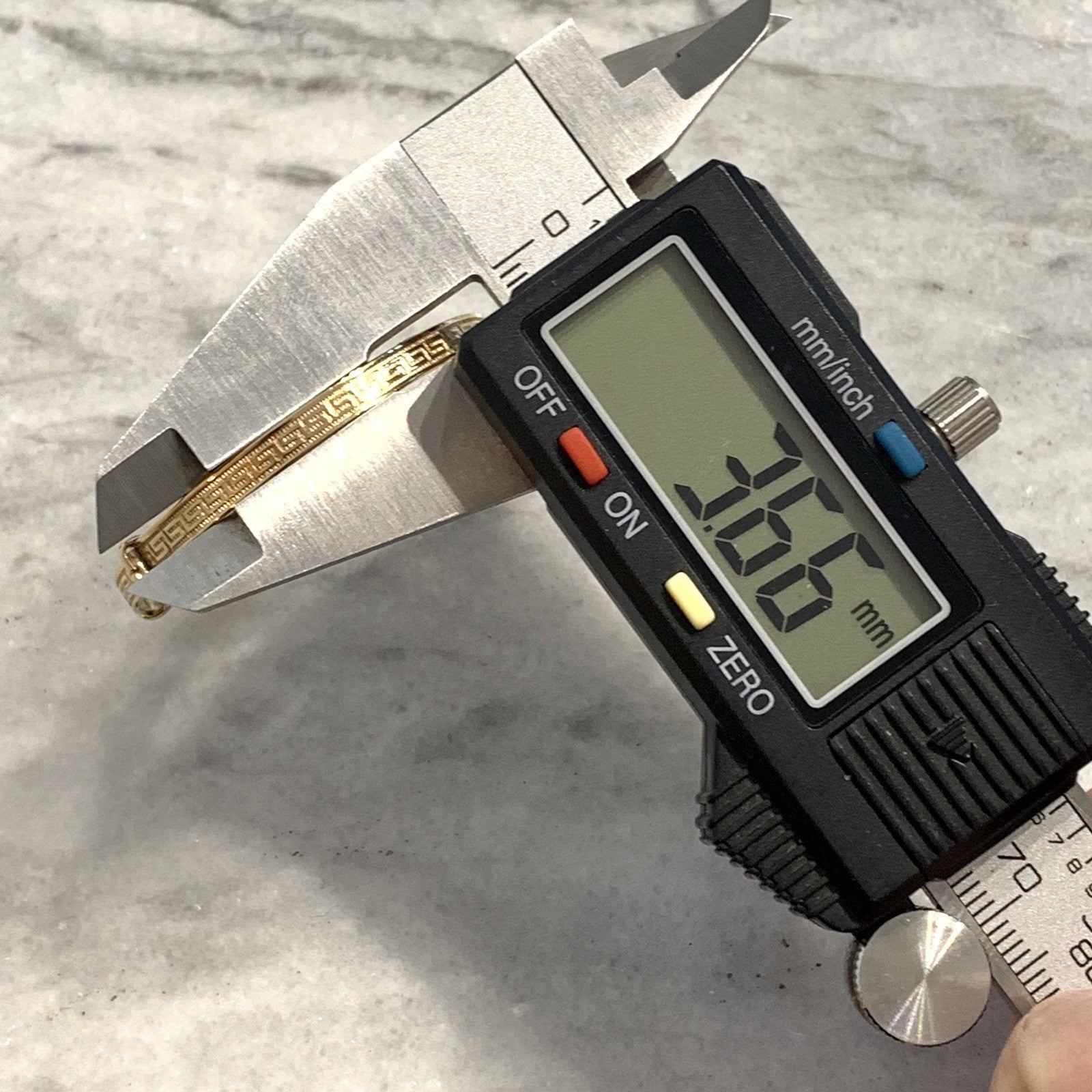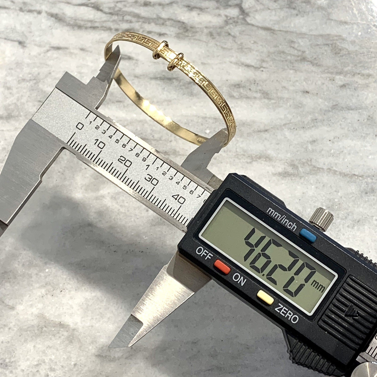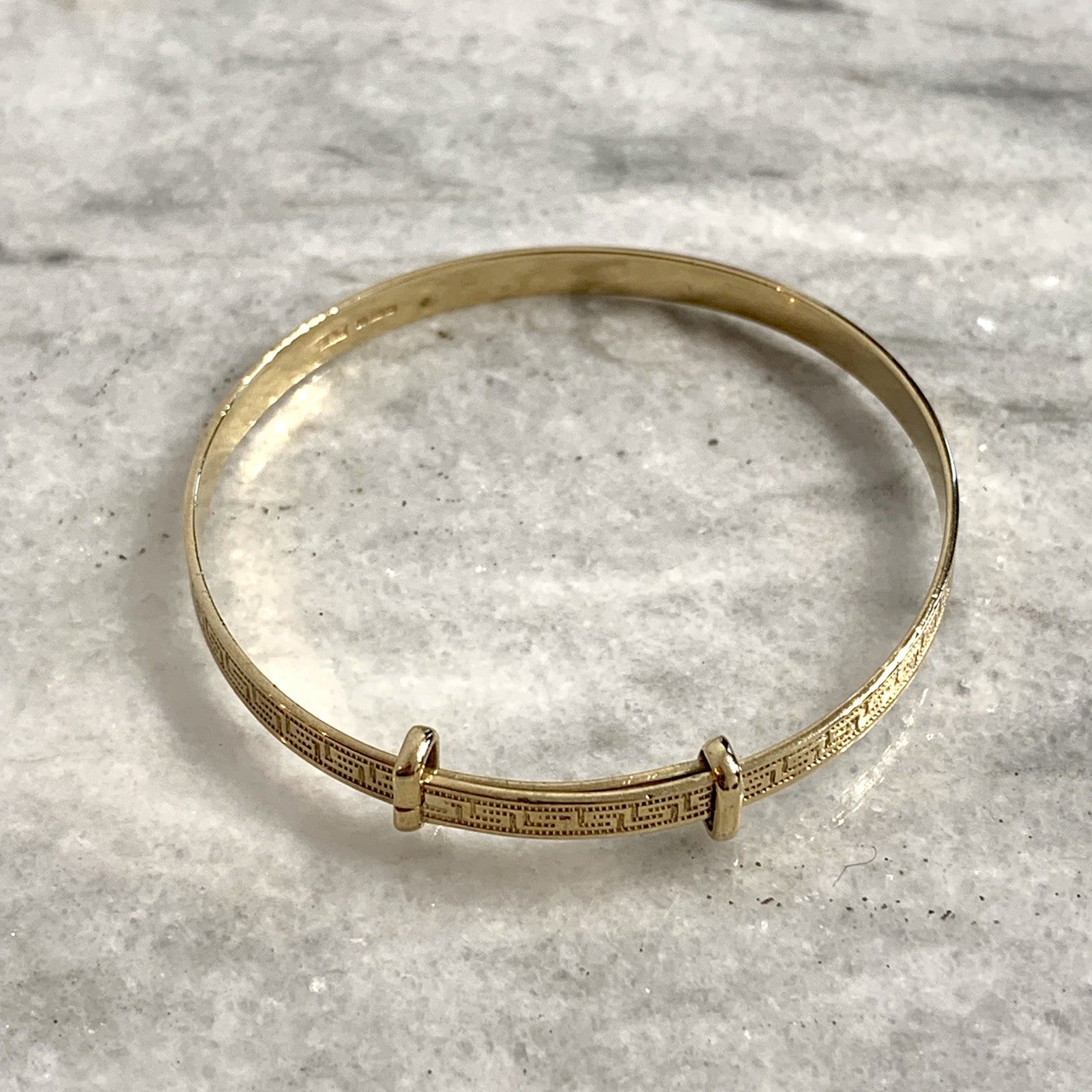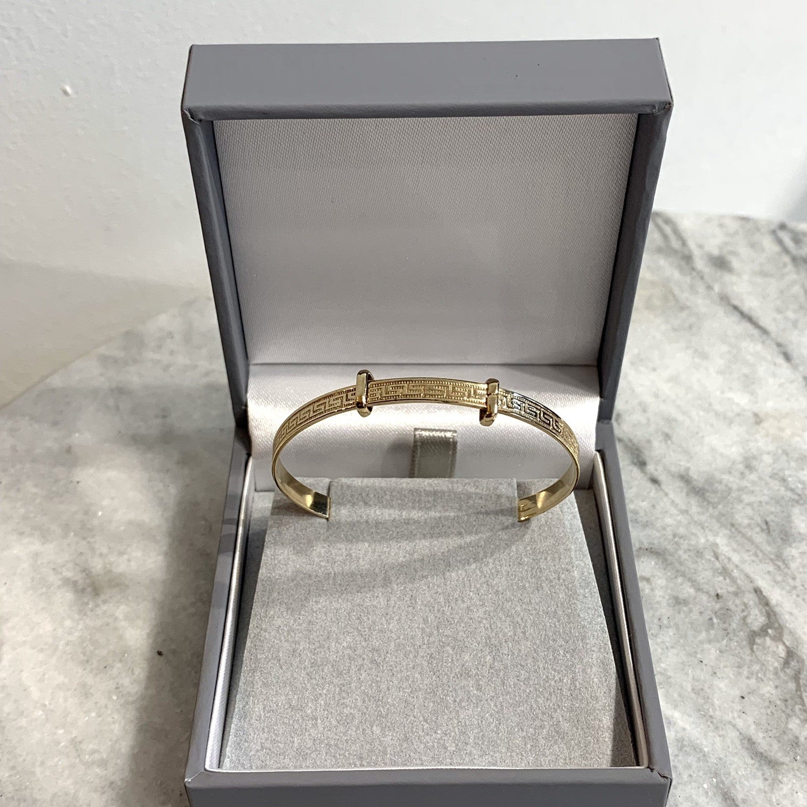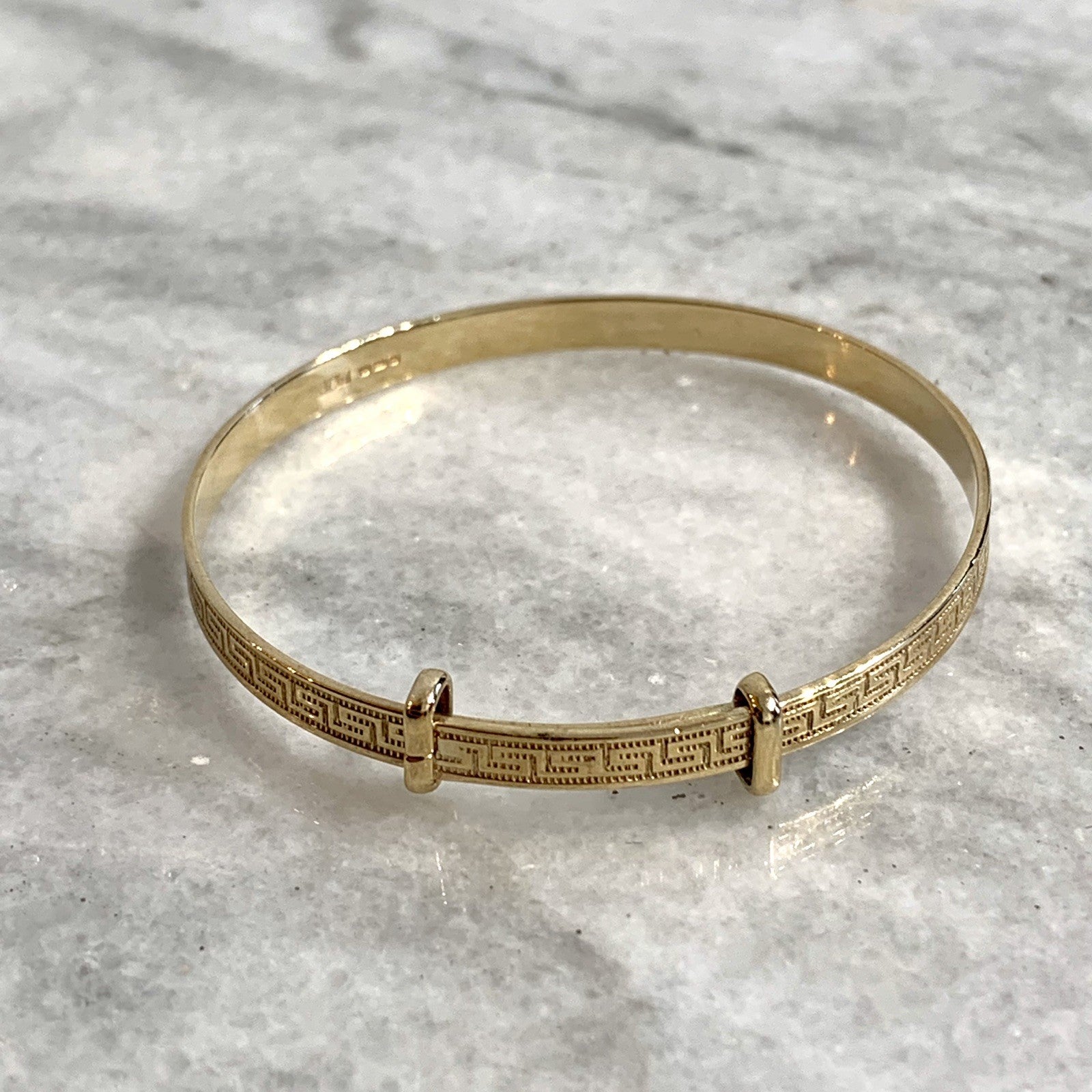 - A classic baby bangle bracelet with a Greek key style patterned embossed throughout. Adjustable.
