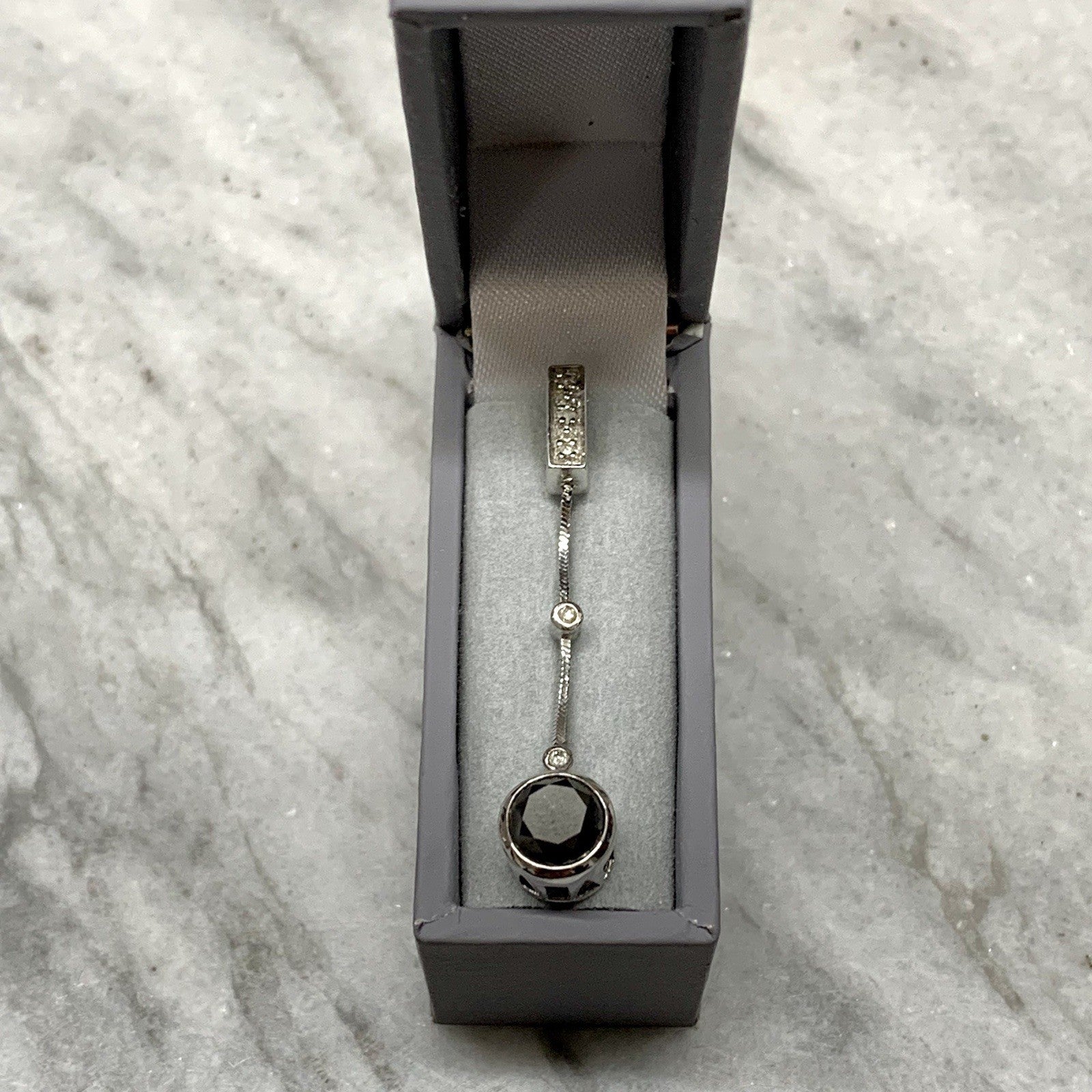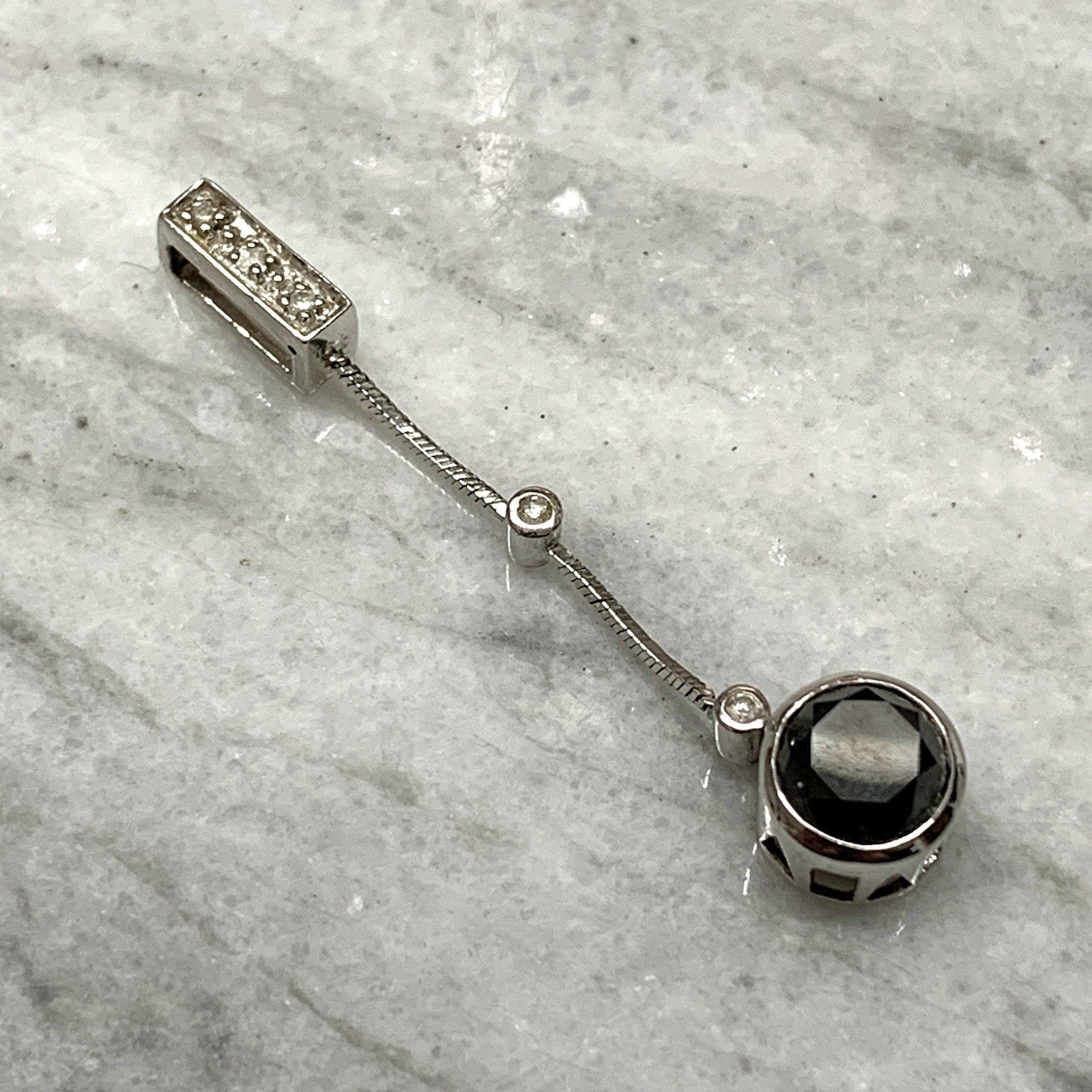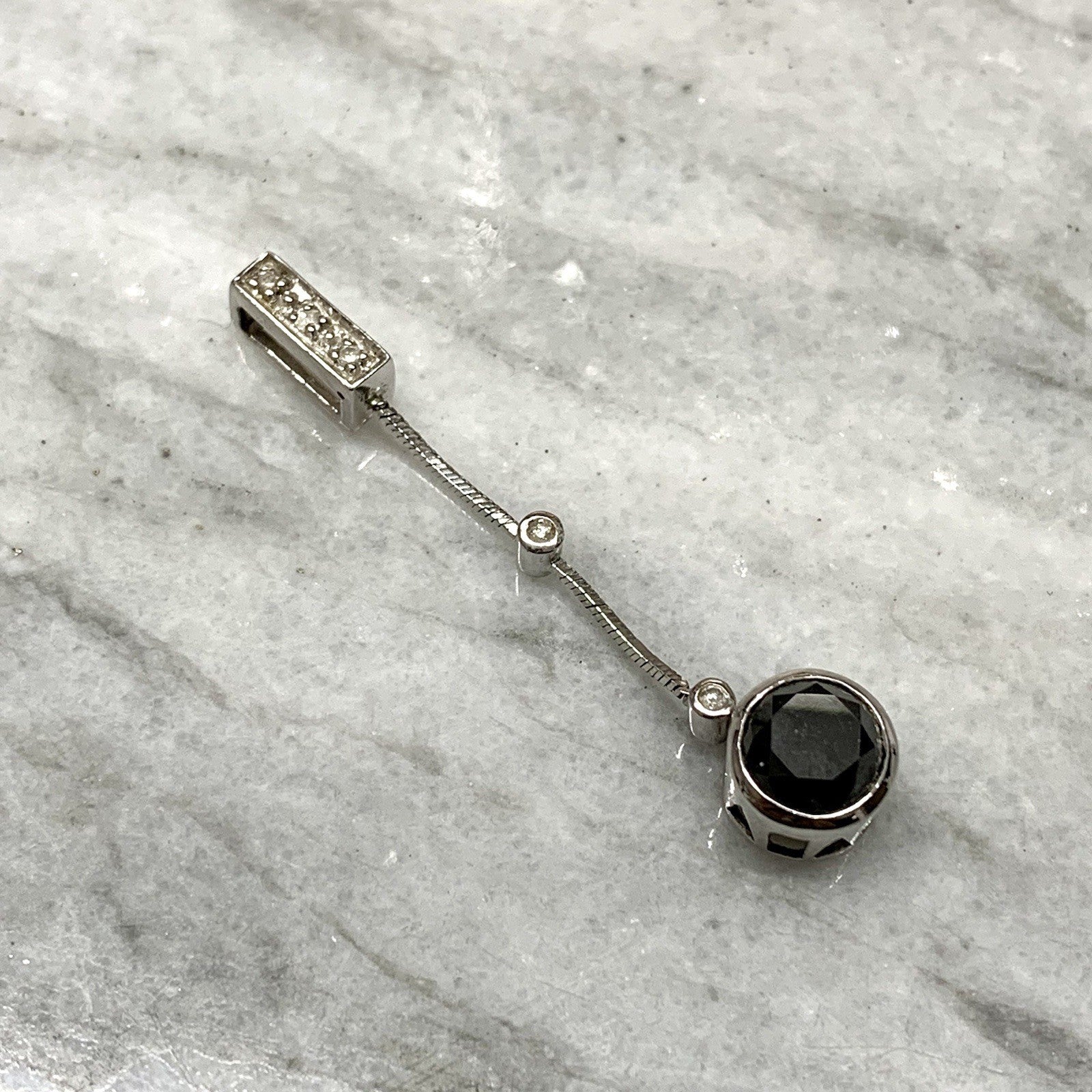 A stunning white gold drop pendant featuring a black diamond accented by a fine snake chain complete with petite round cut white diamonds.