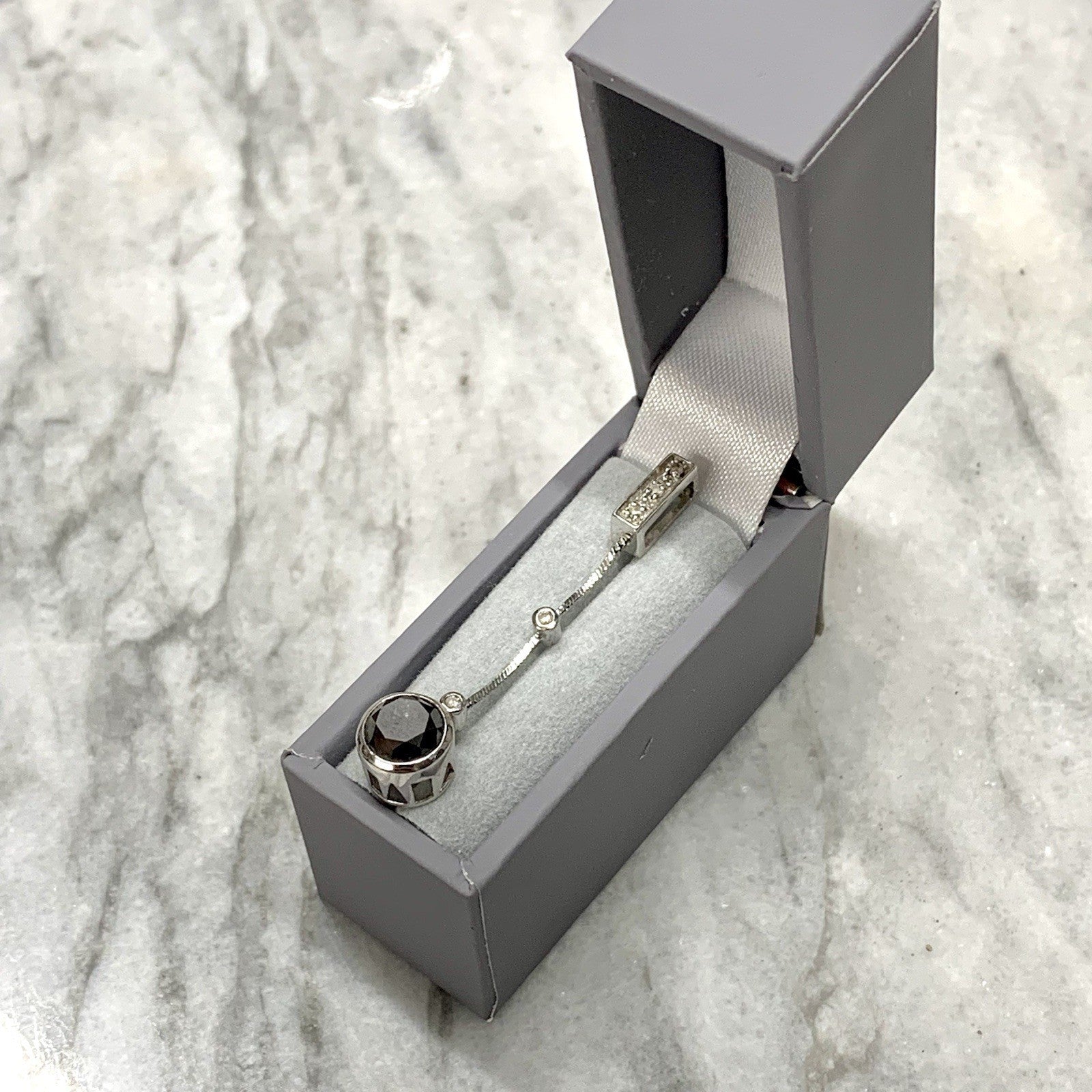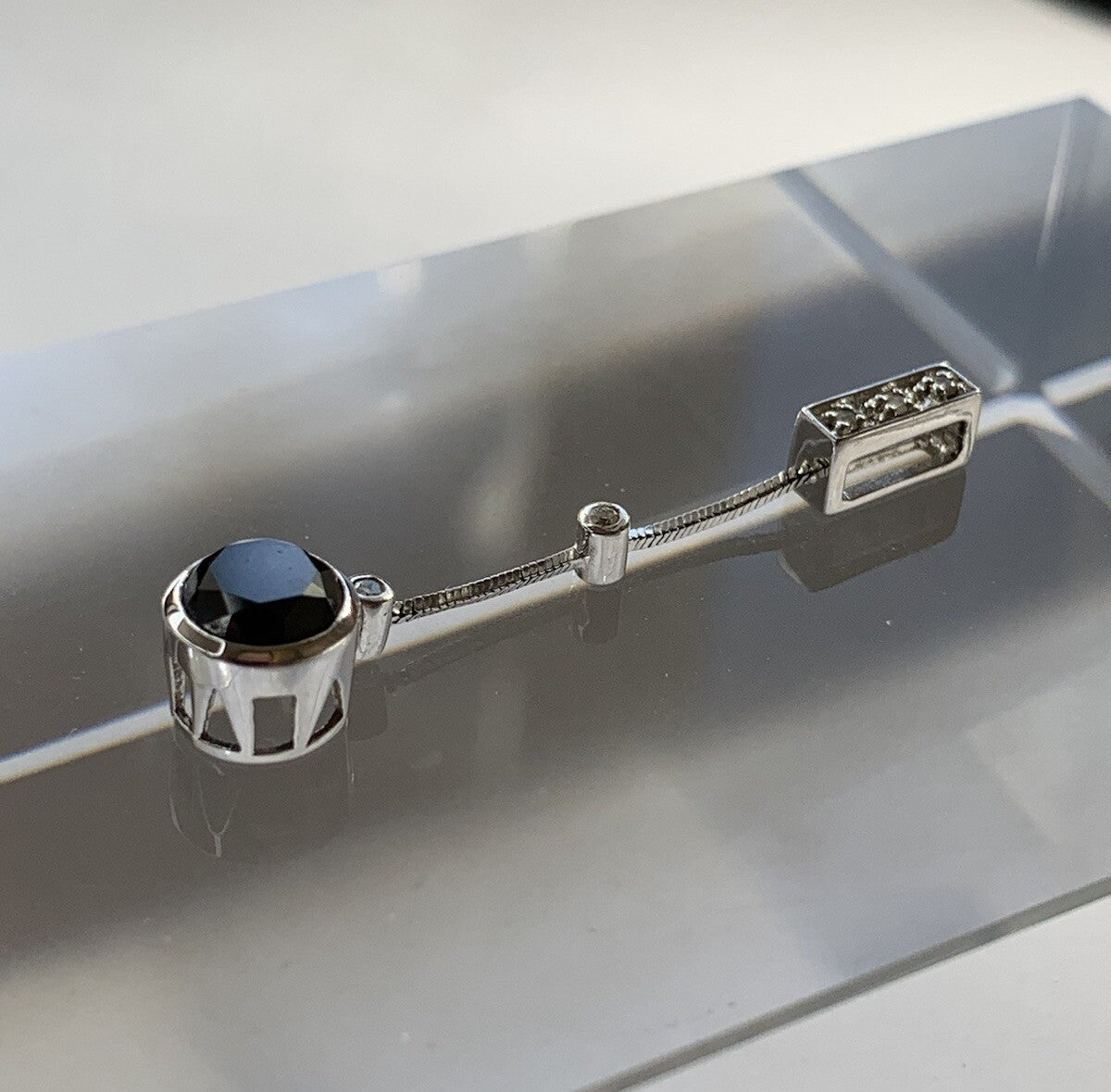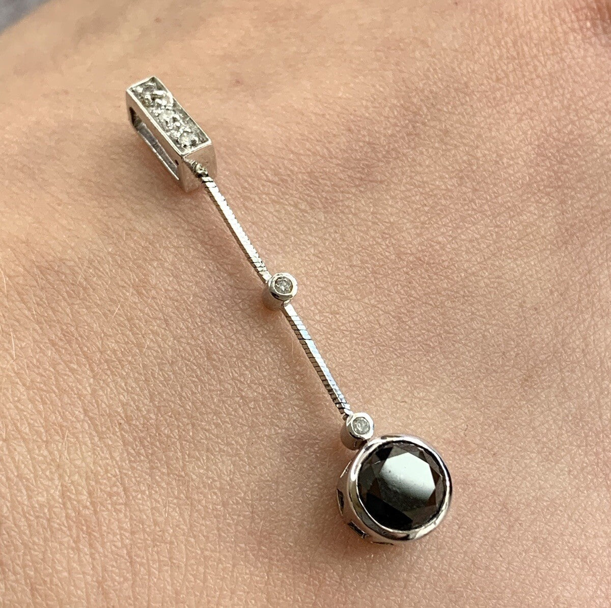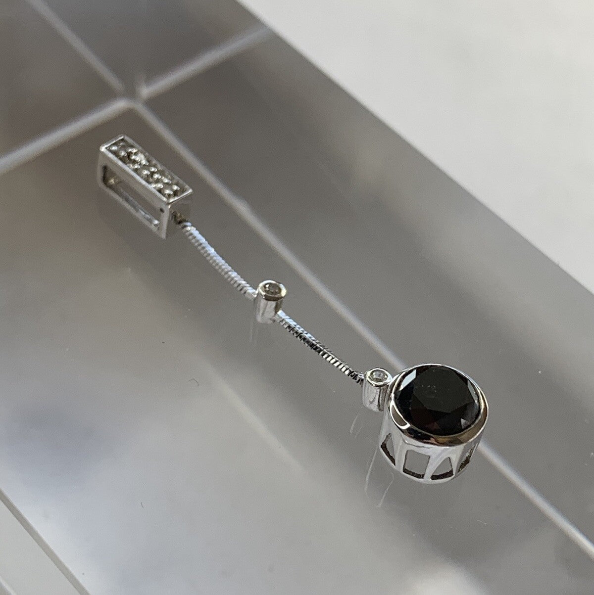 A stunning white gold drop pendant featuring a black diamond accented by a fine snake chain complete with petite round cut white diamonds.