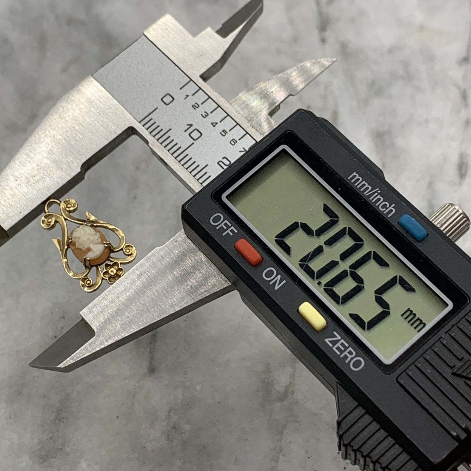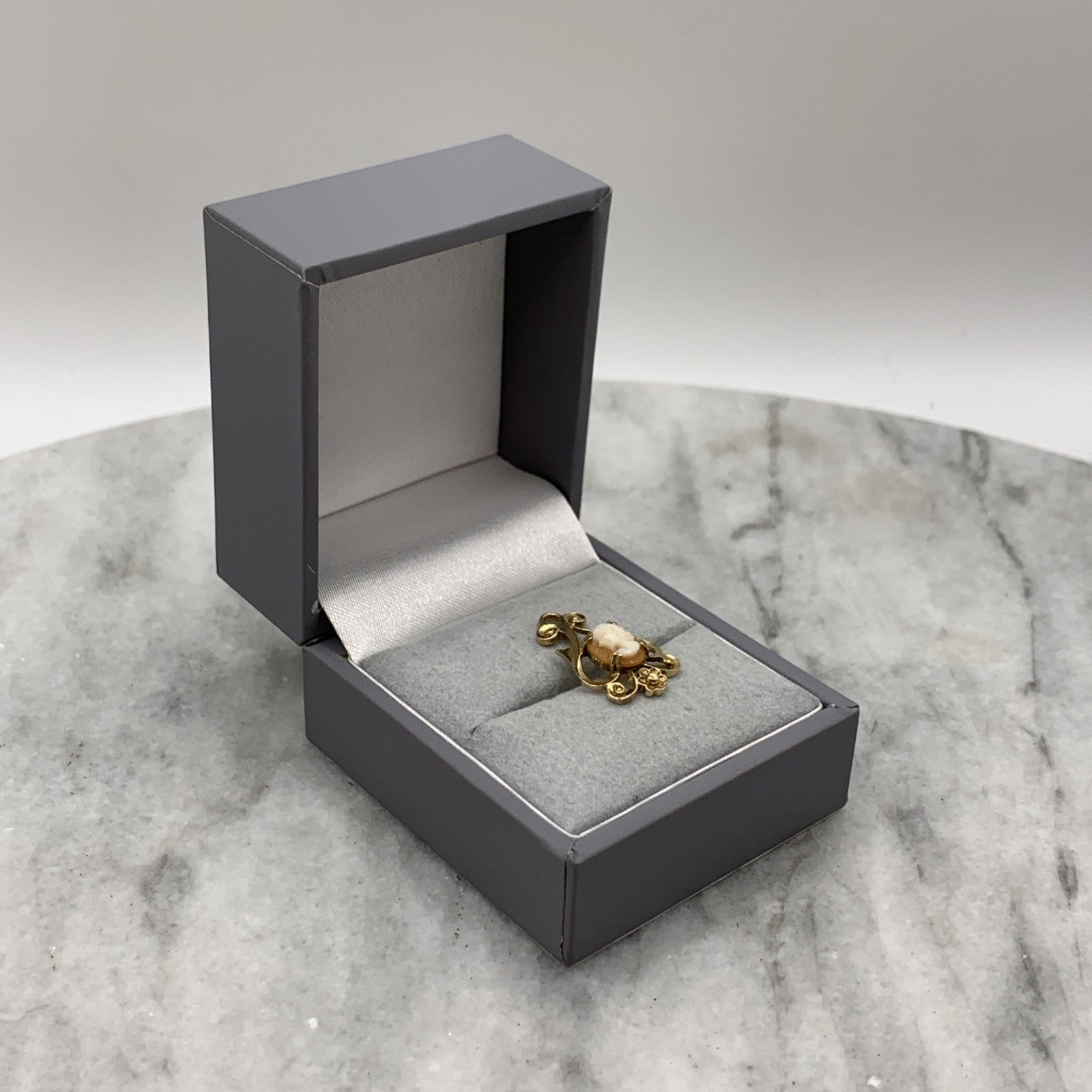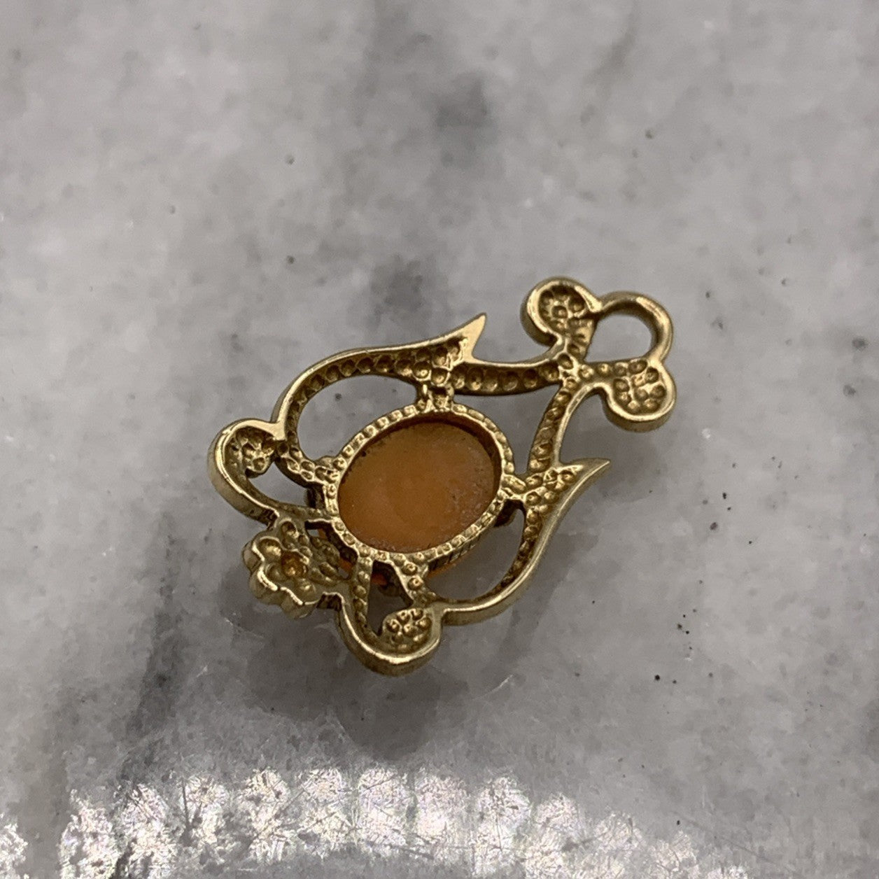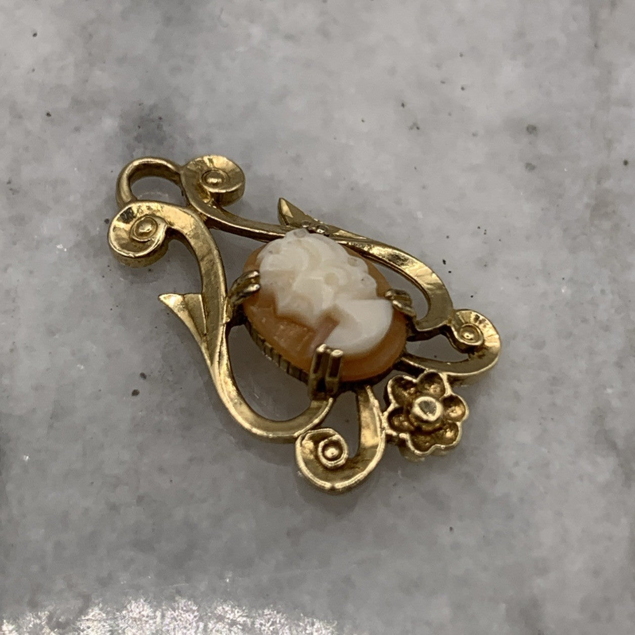 A beautiful gold pendant featuring a small cameo within a baroque style frame with floral motifs.