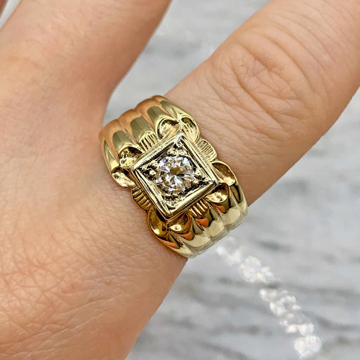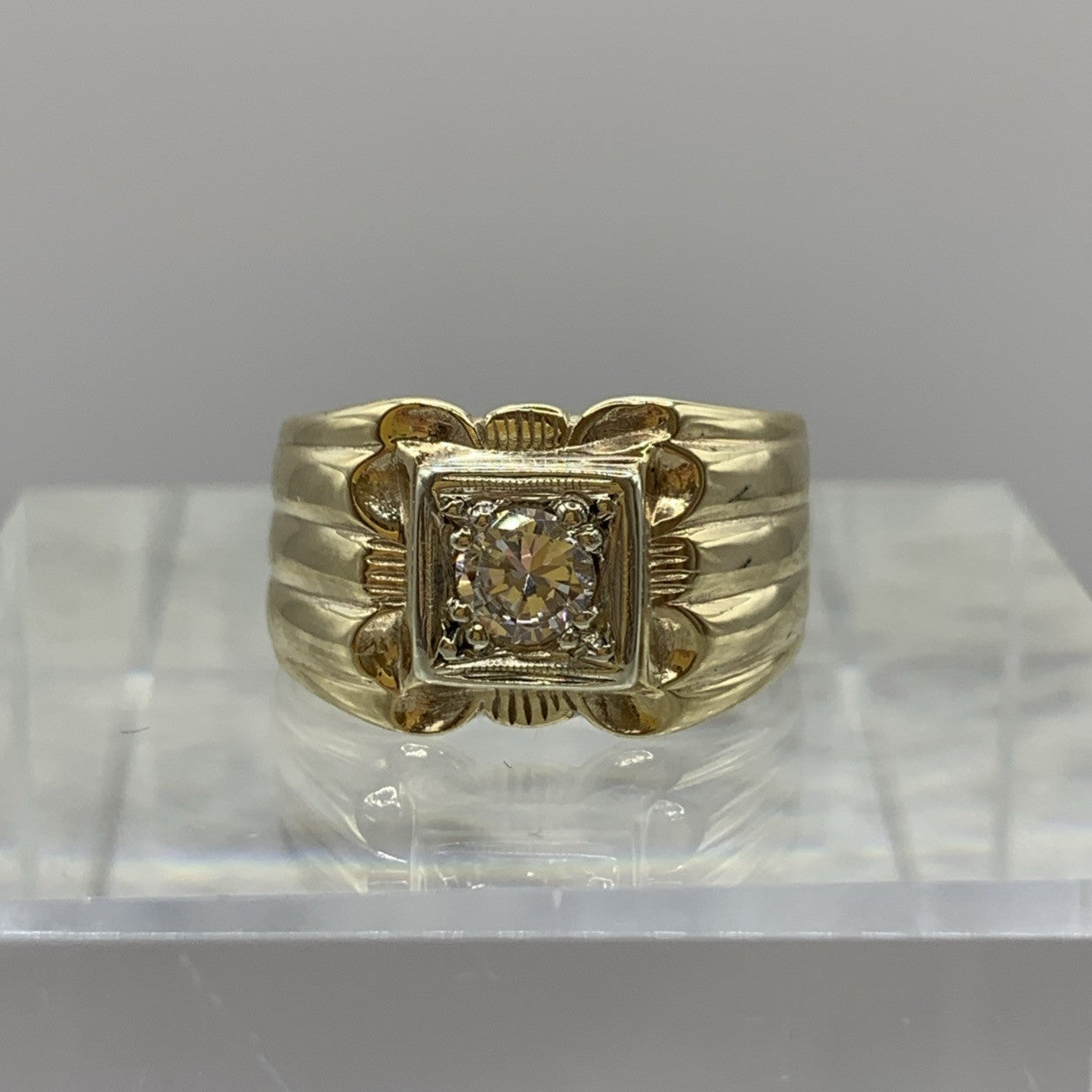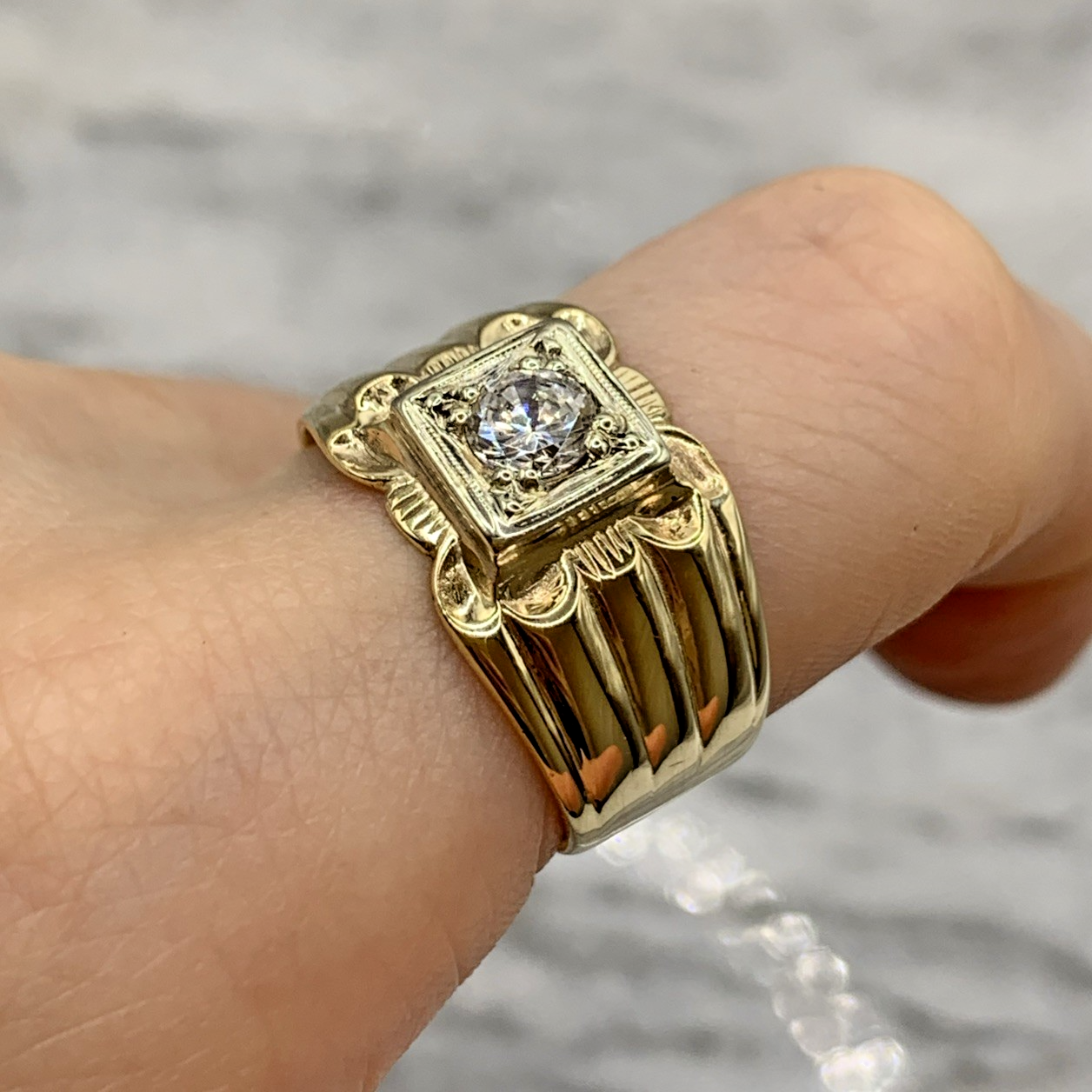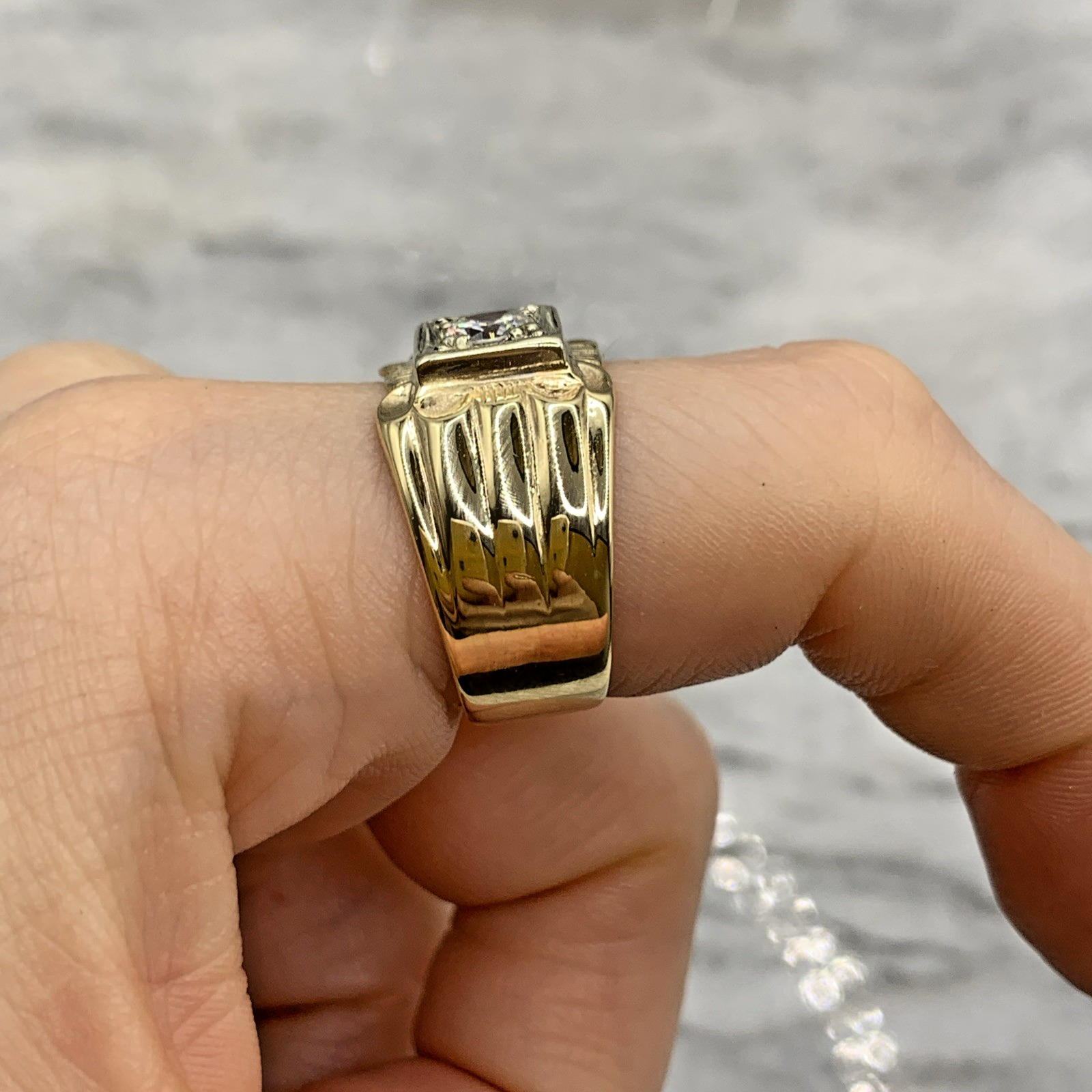 A stunning chunky gold band ring featuring a solitaire cubic zirconia gemstone upon textured shoulders.