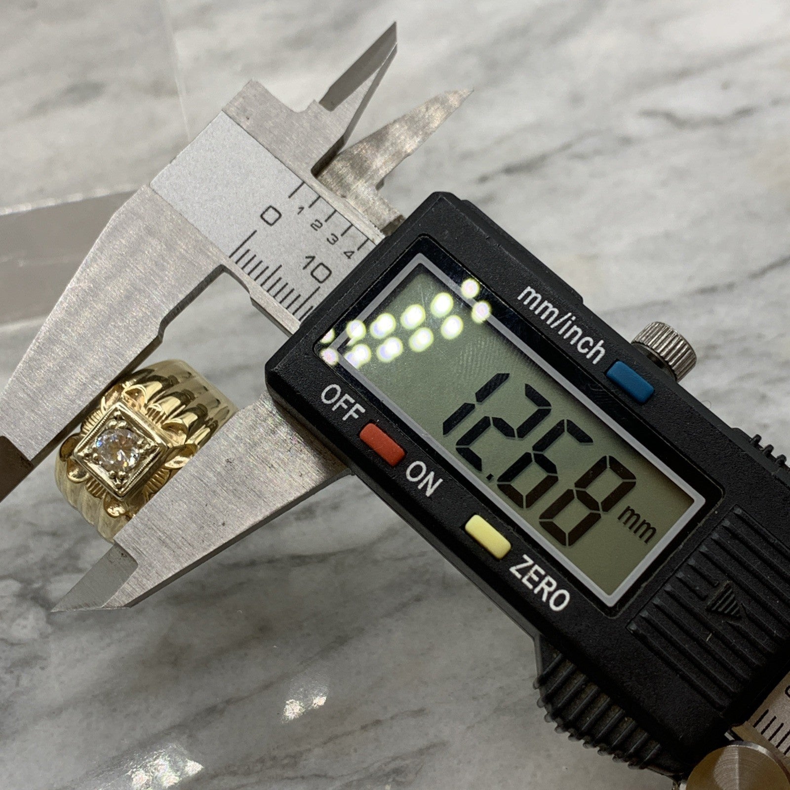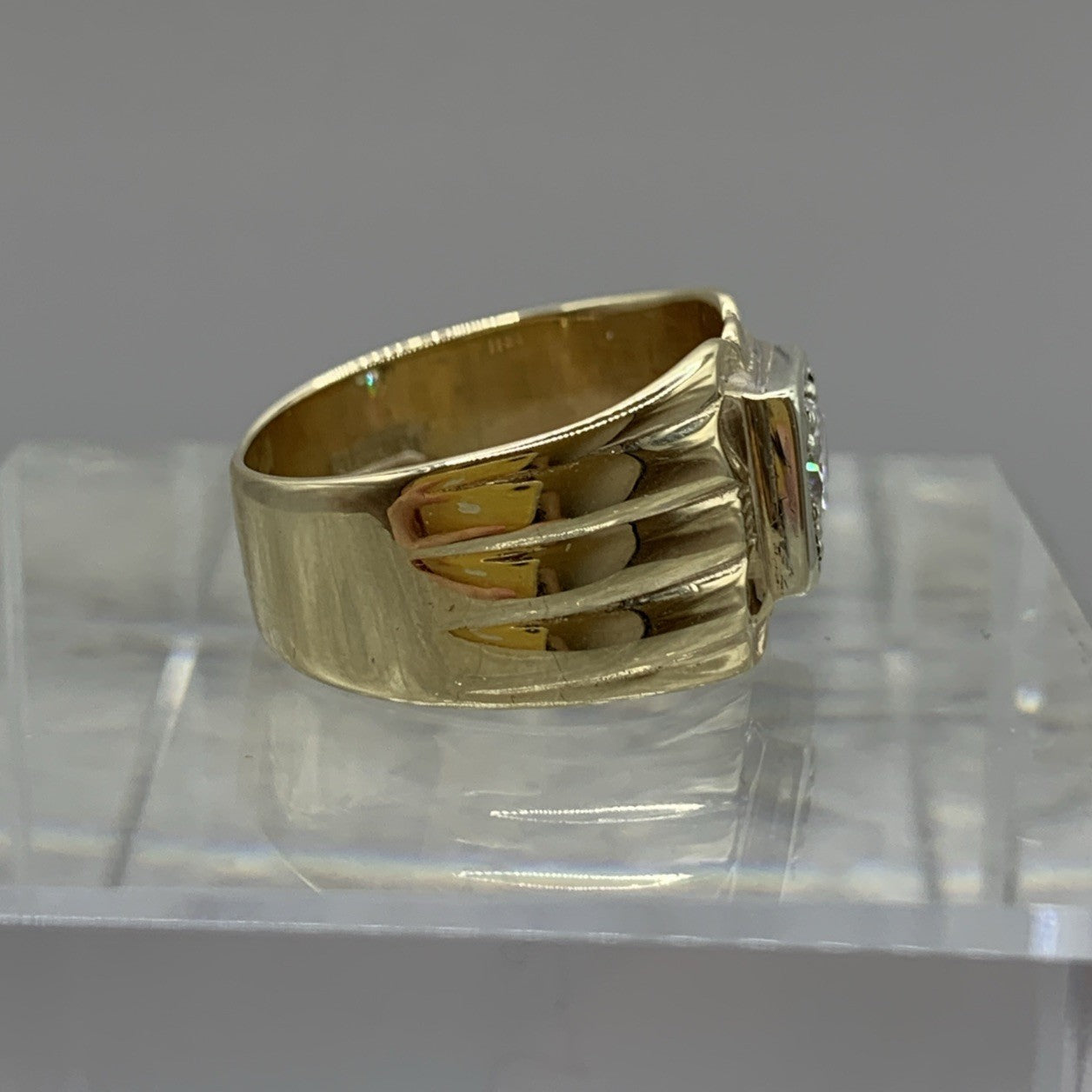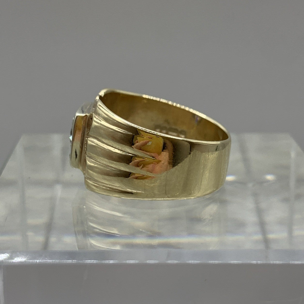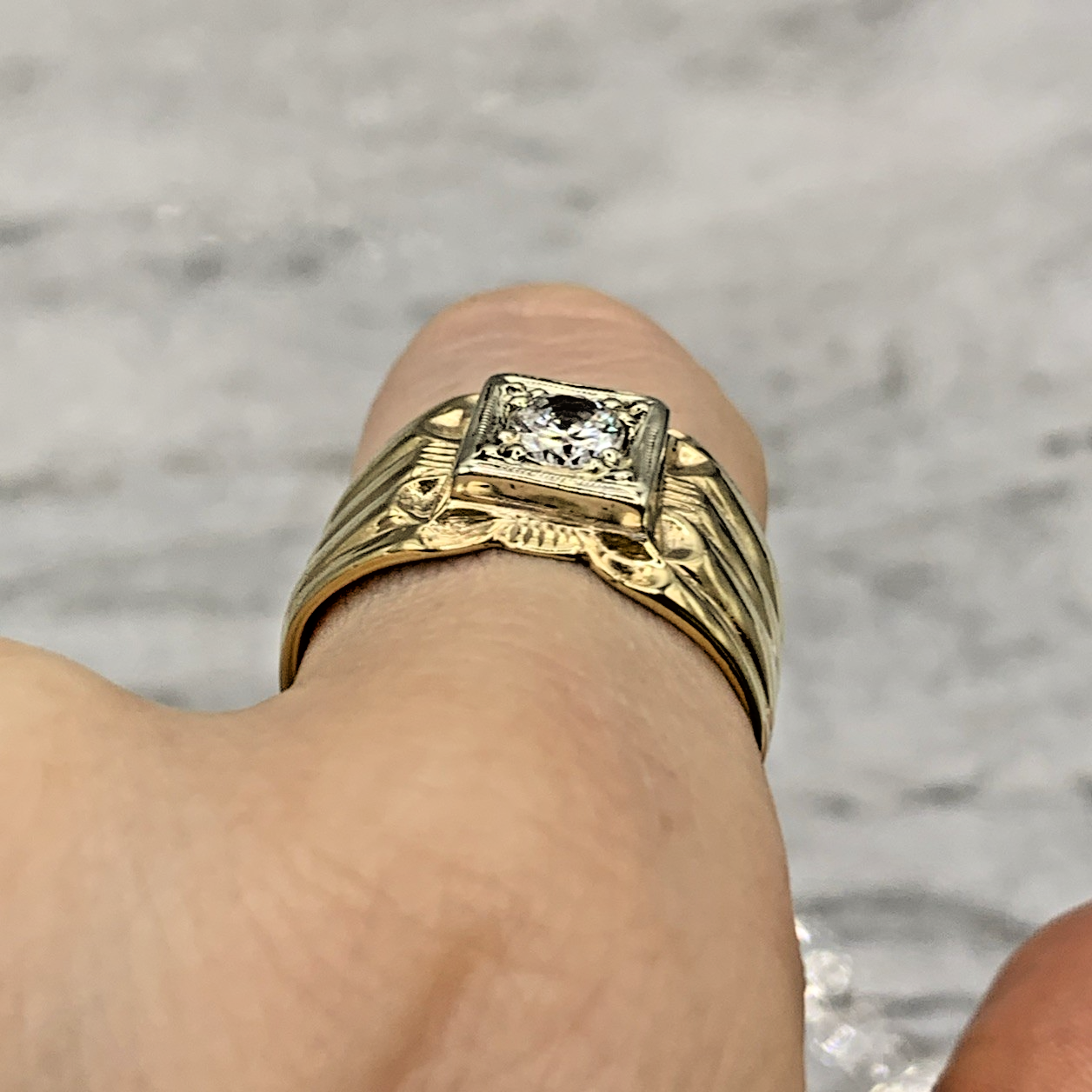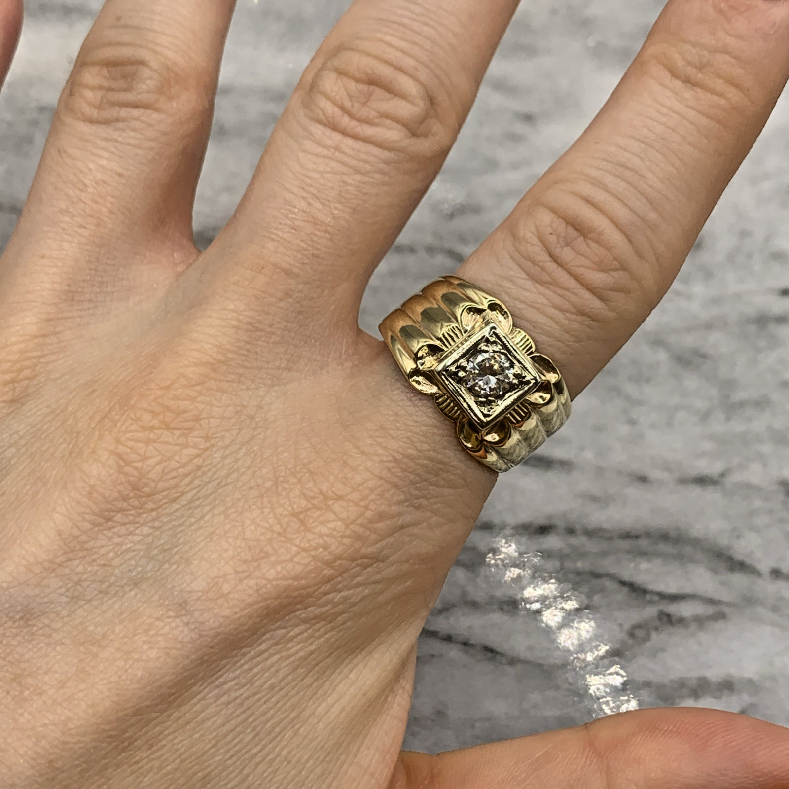 A stunning chunky gold band ring featuring a solitaire cubic zirconia gemstone upon textured shoulders.