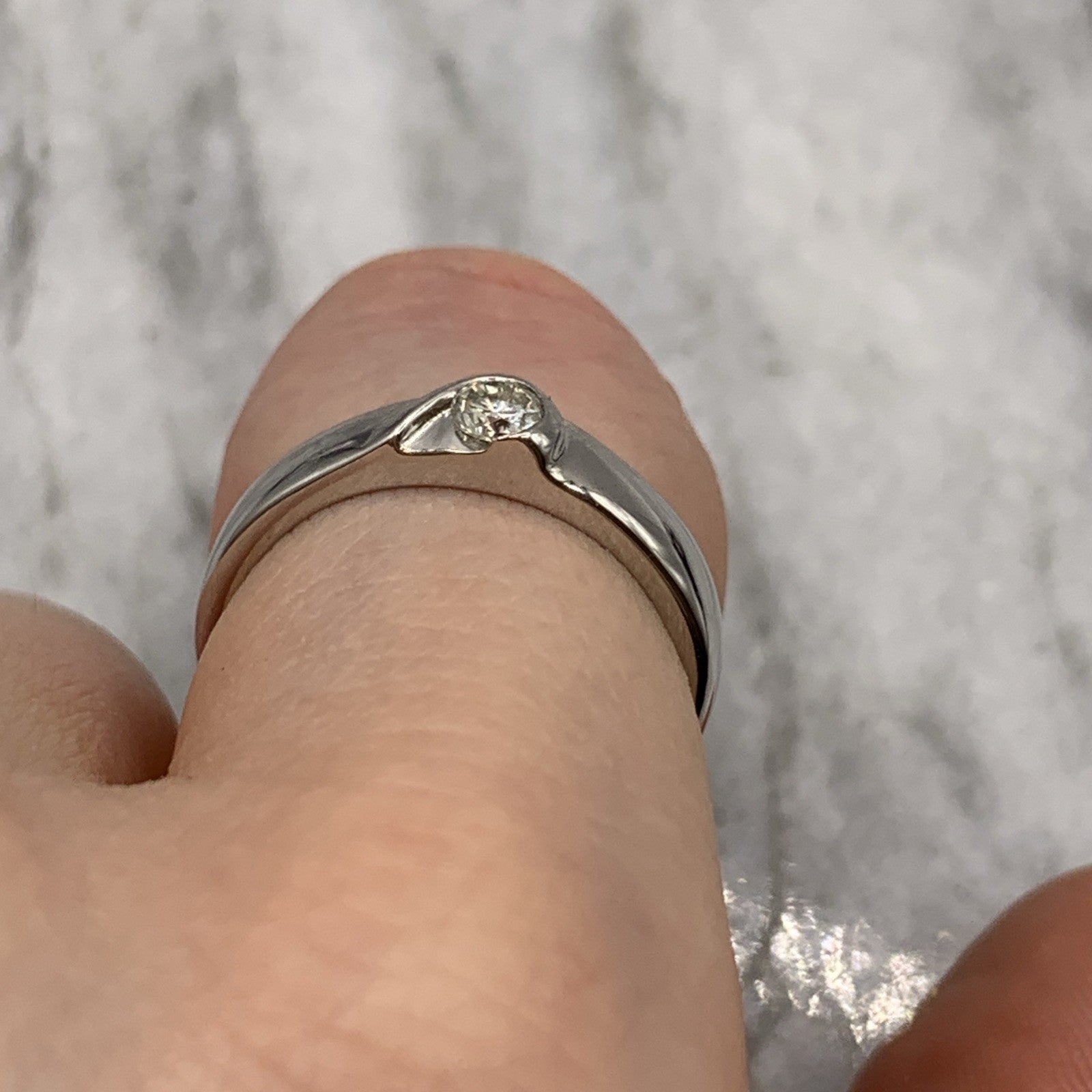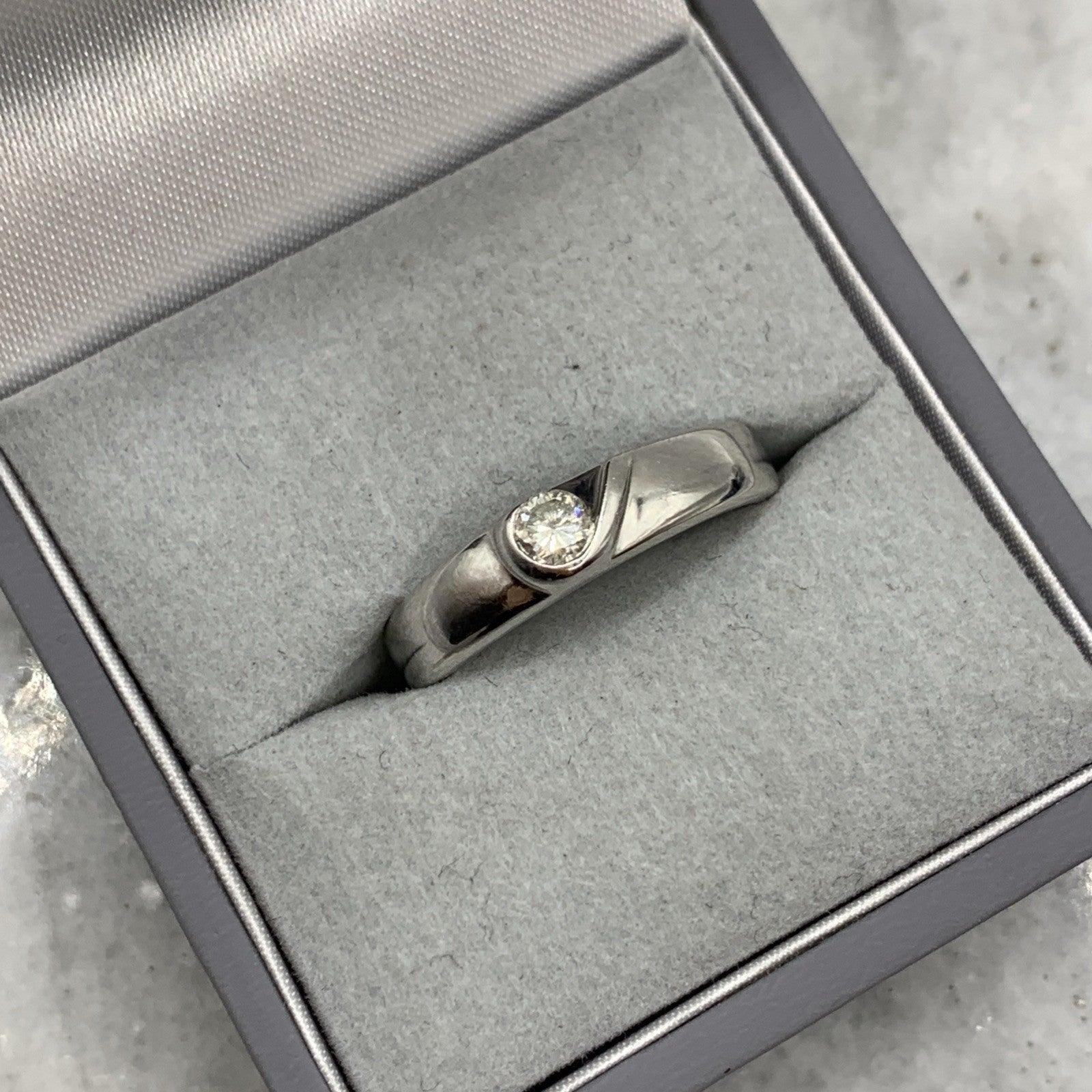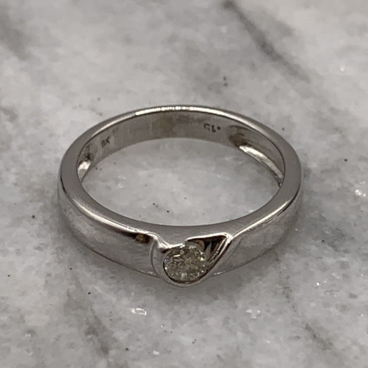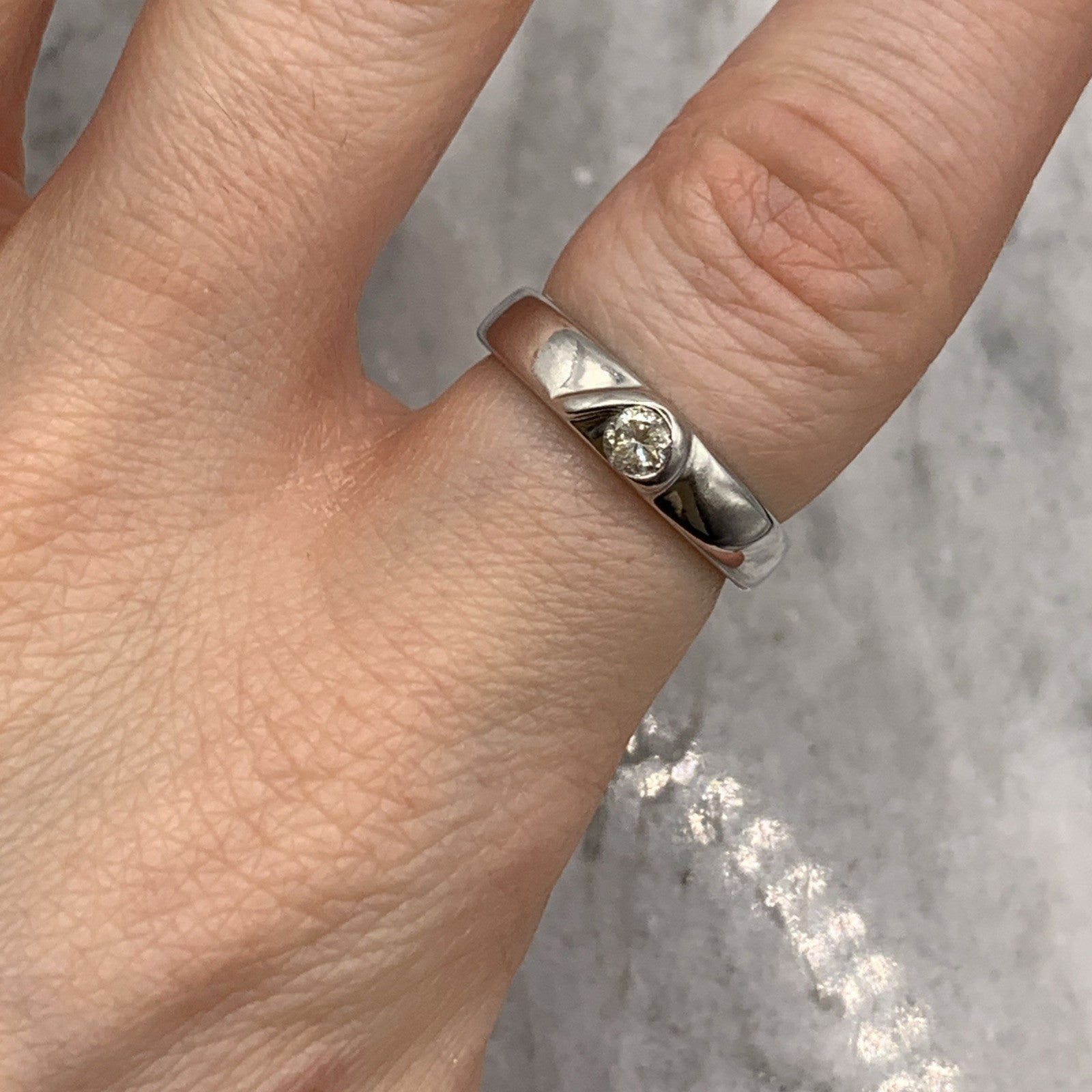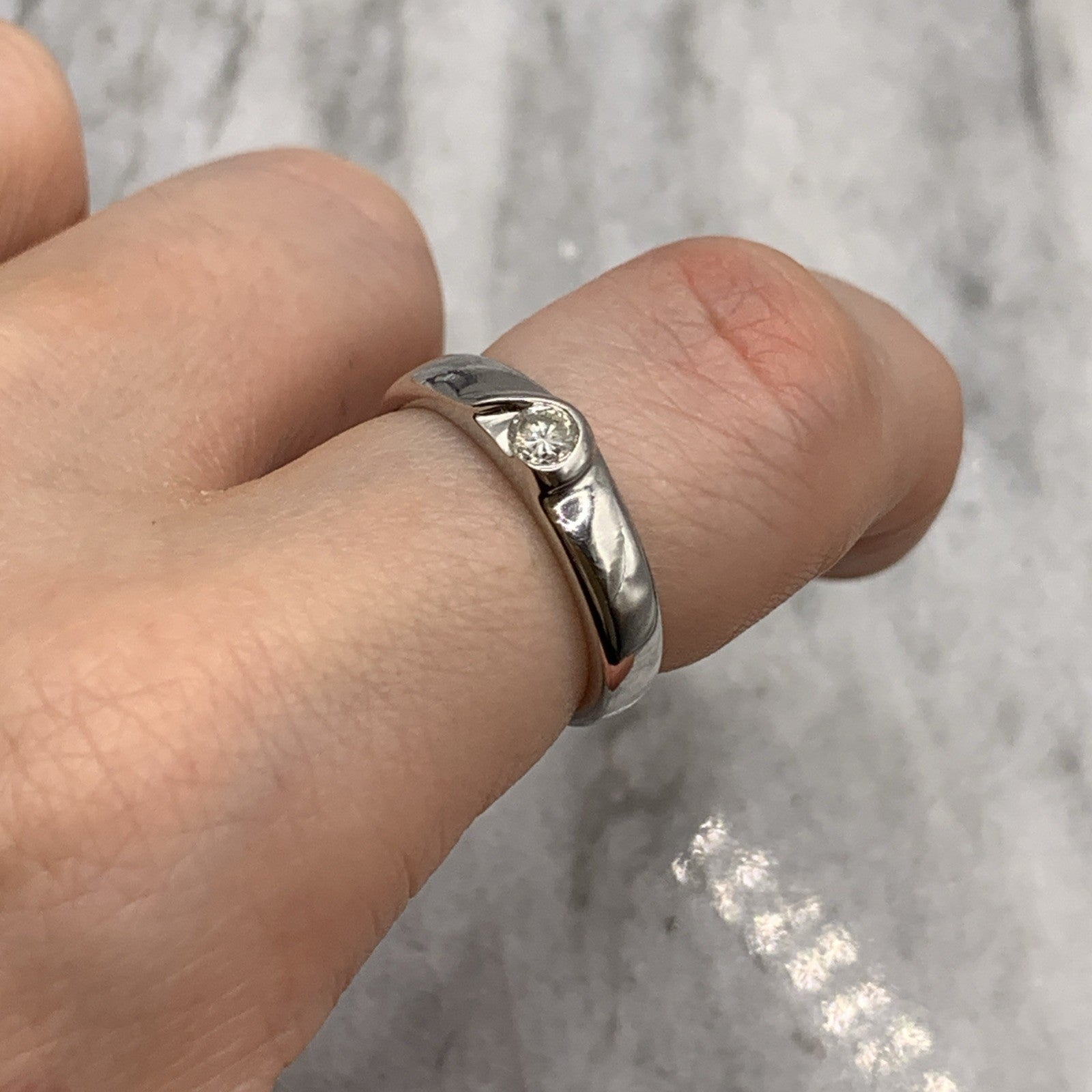 - A lovely white gold band ring featuring a solitaire bezel set diamond at .15ct.