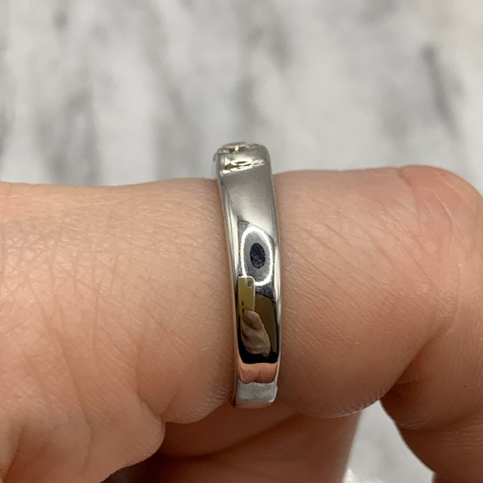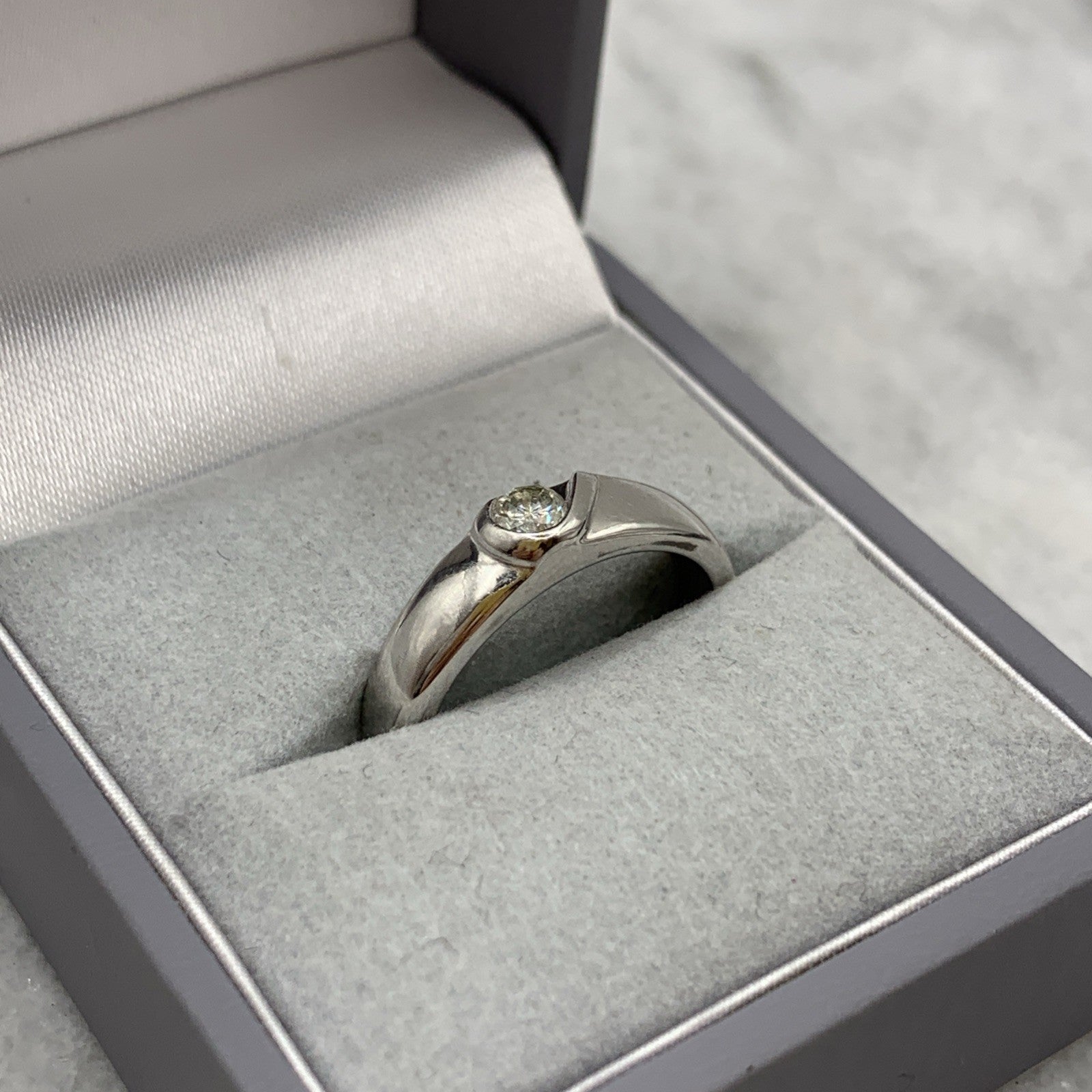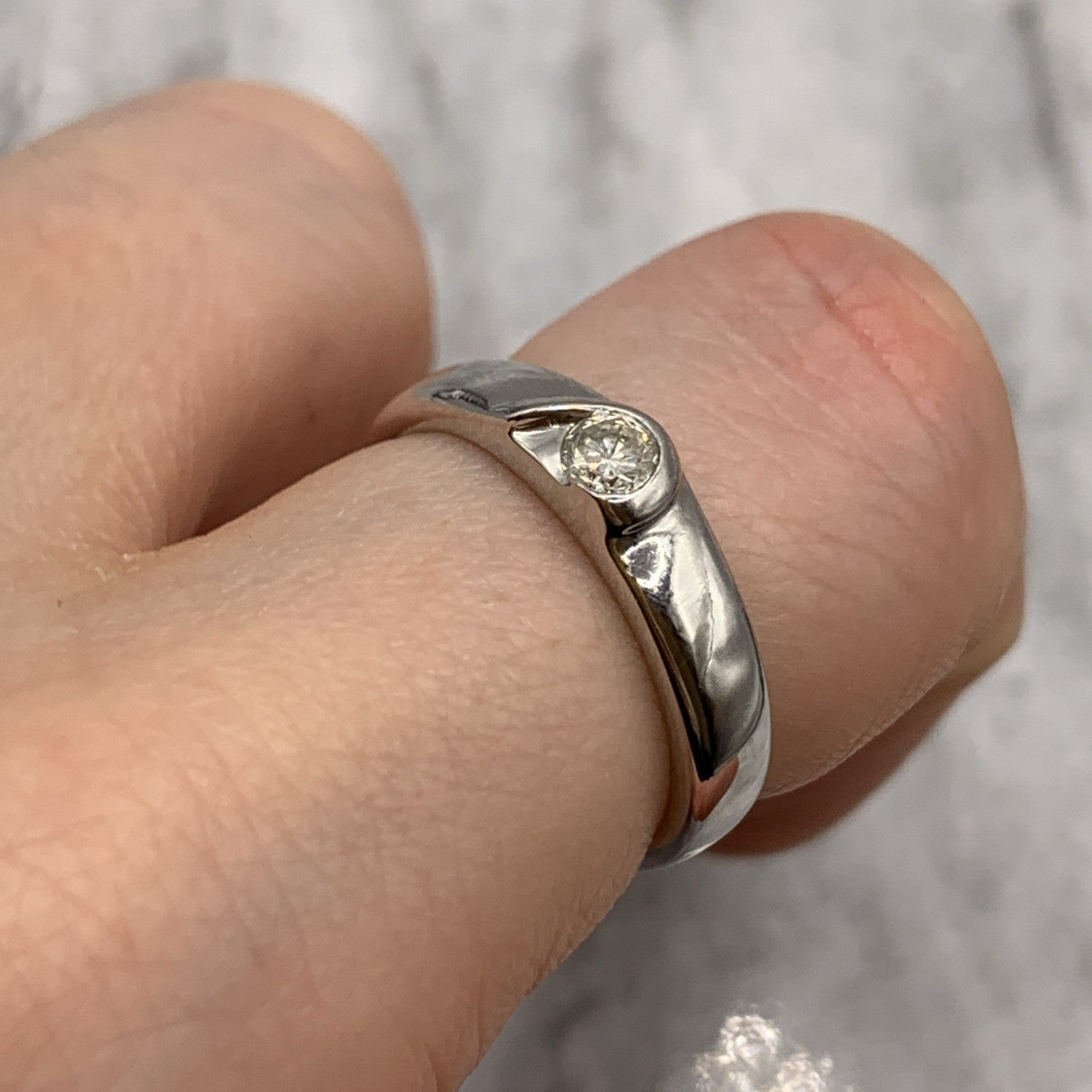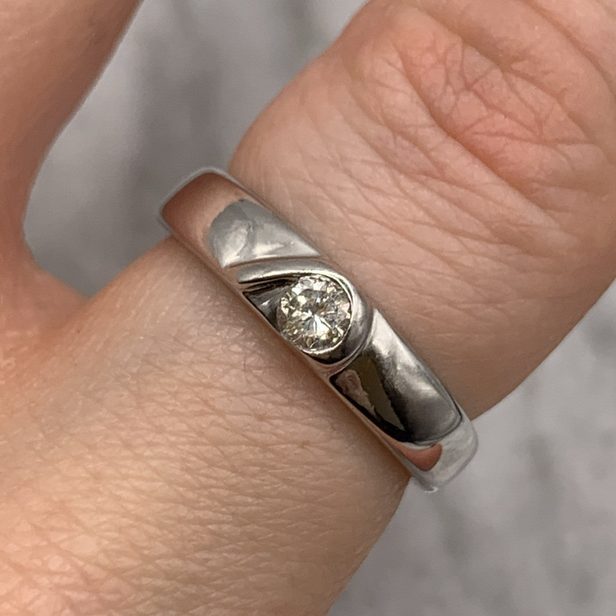 - A lovely white gold band ring featuring a solitaire bezel set diamond at .15ct.