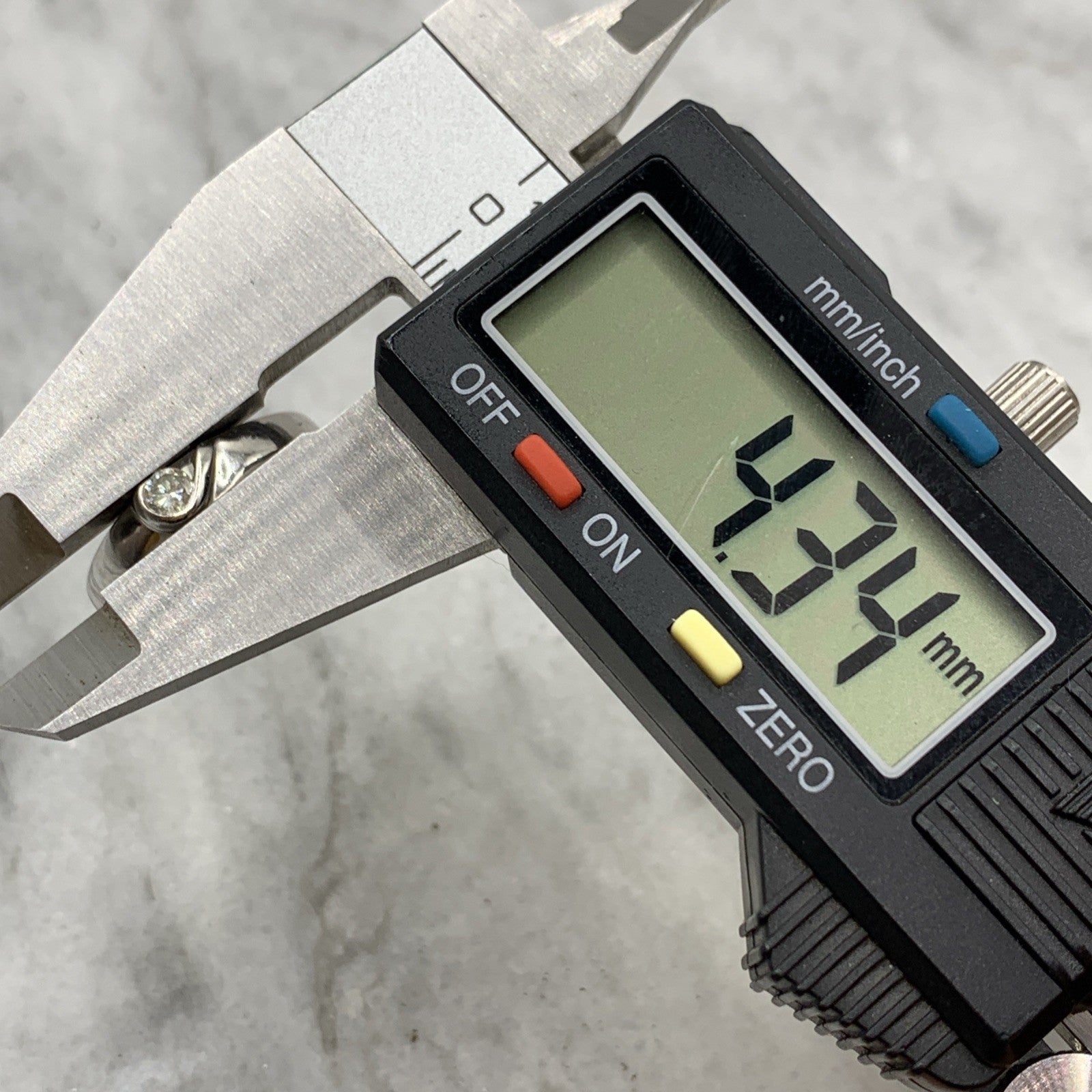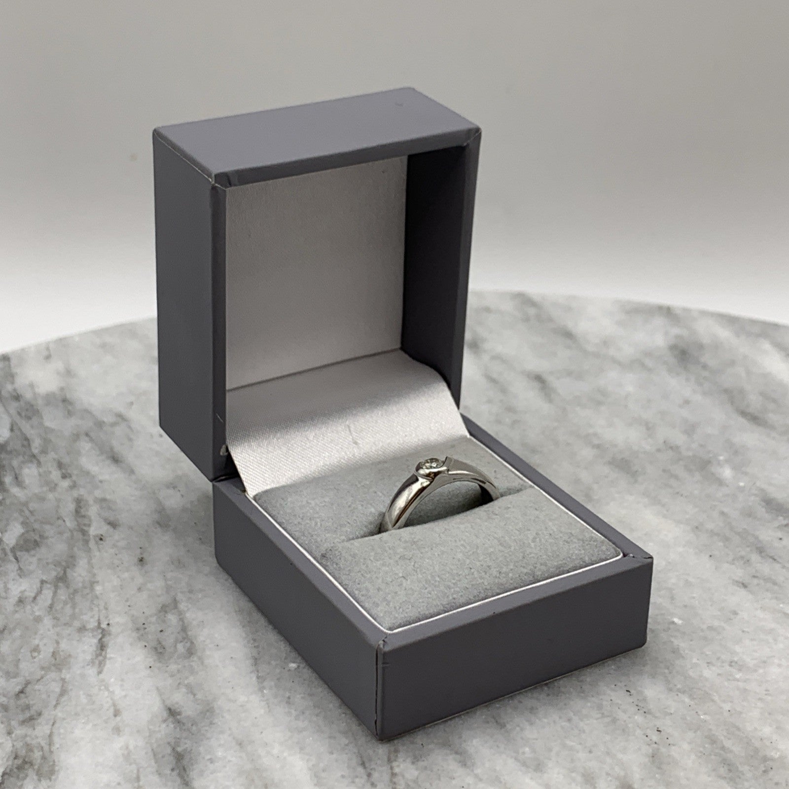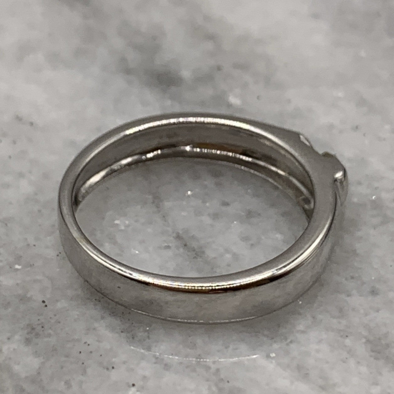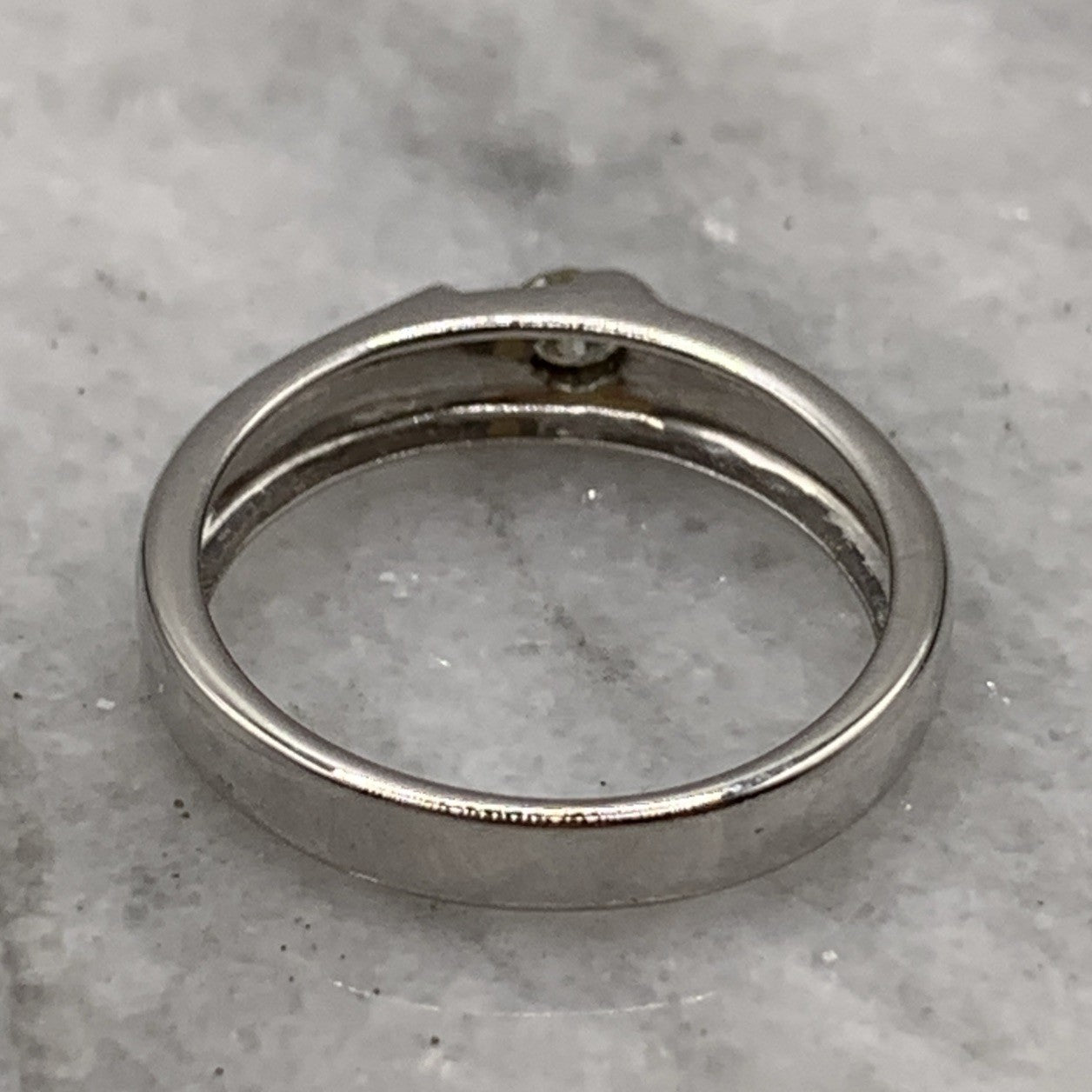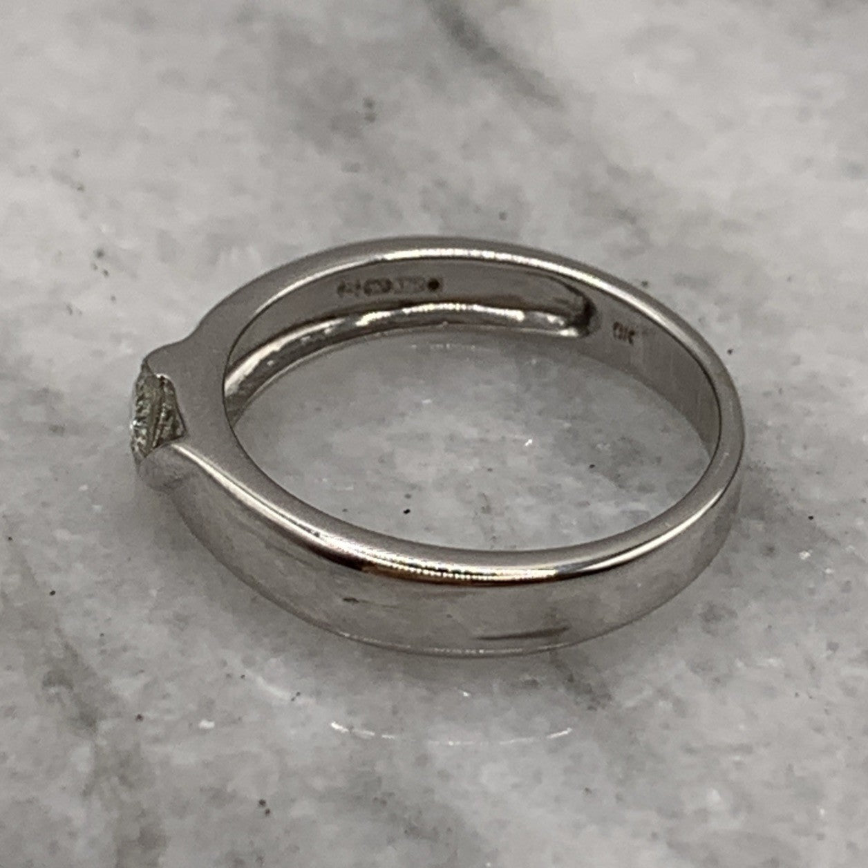 - A lovely white gold band ring featuring a solitaire bezel set diamond at .15ct.