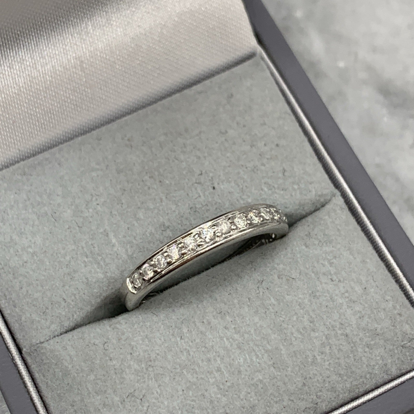 - A timeless white gold band ring showcasing a row of petite pave set diamonds in the half eternity style.
