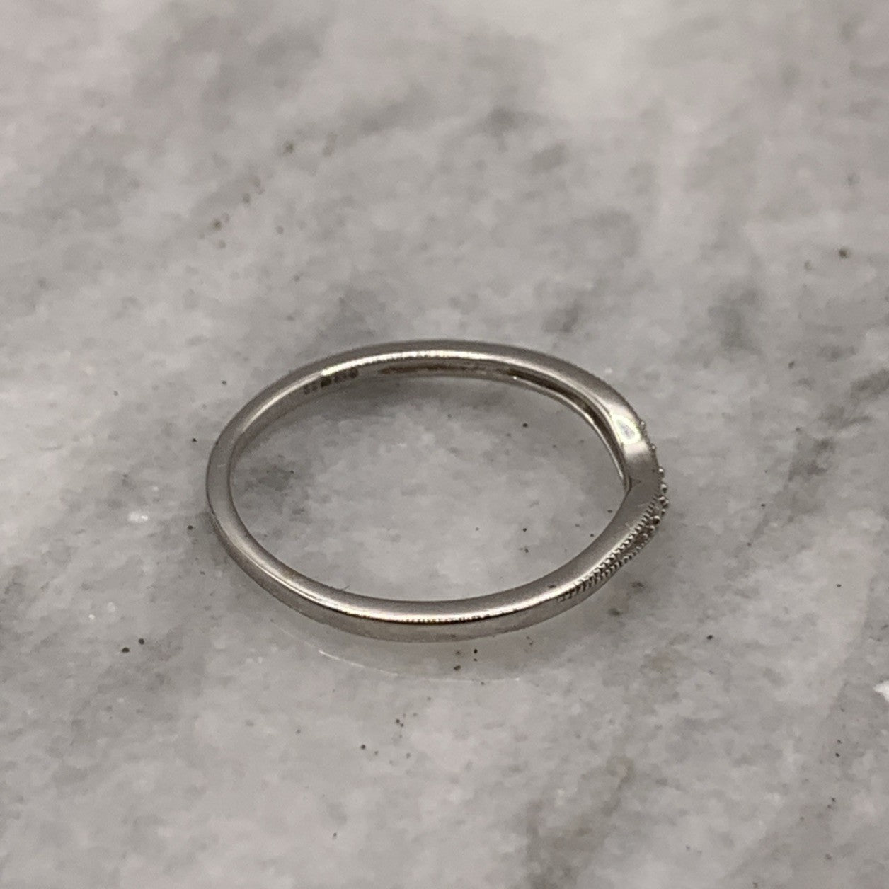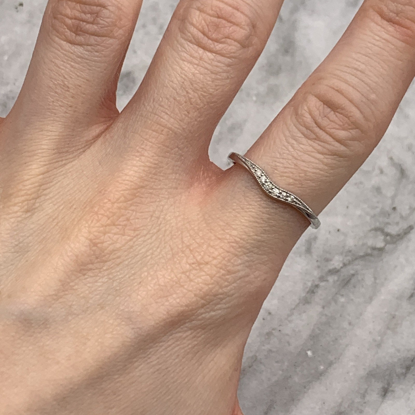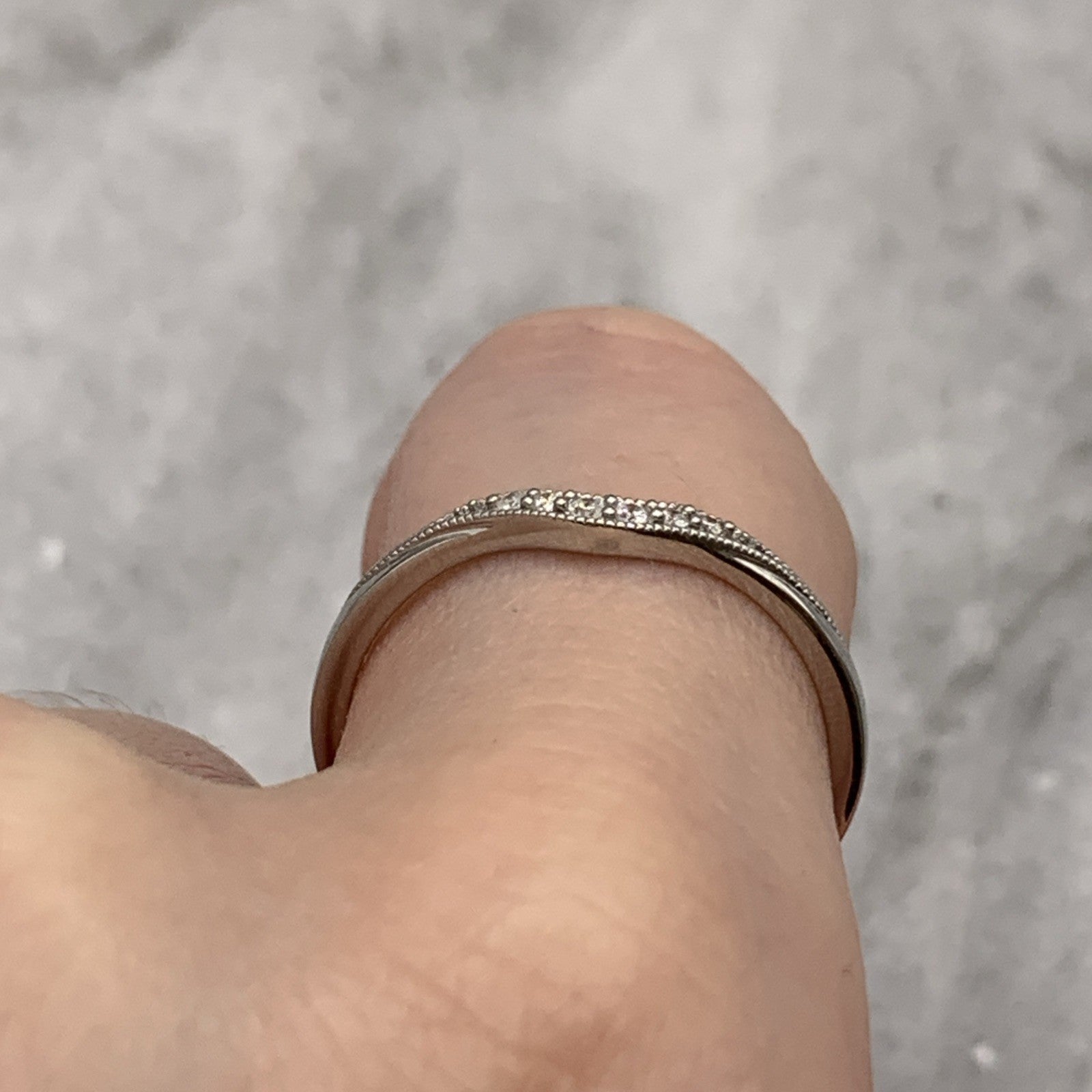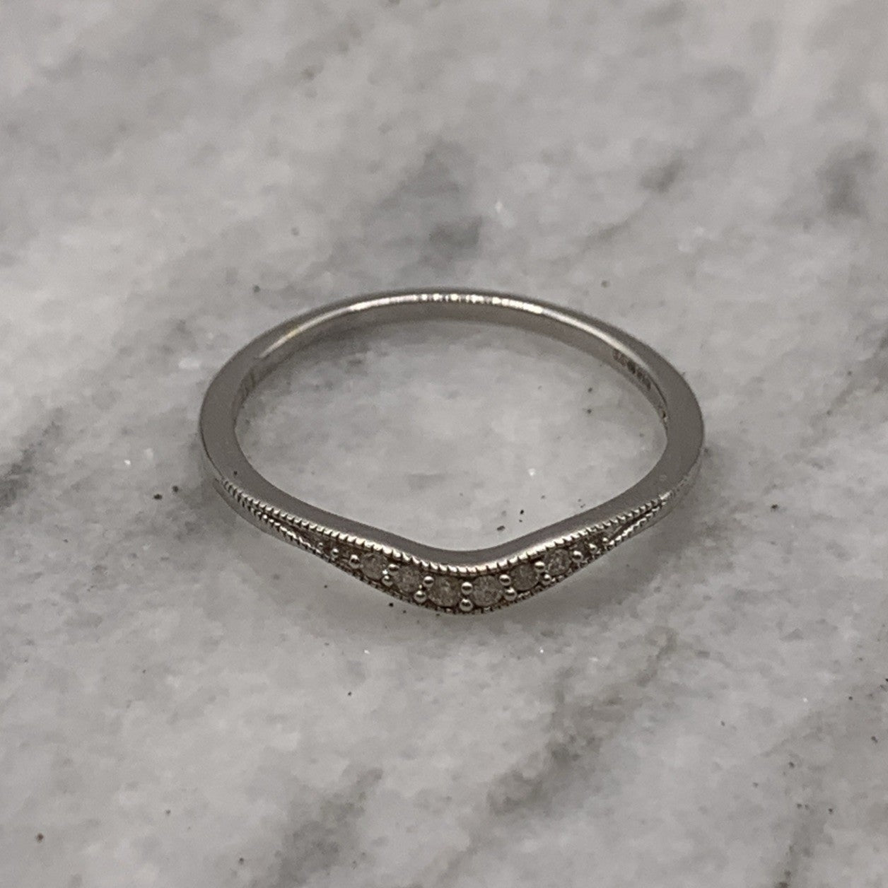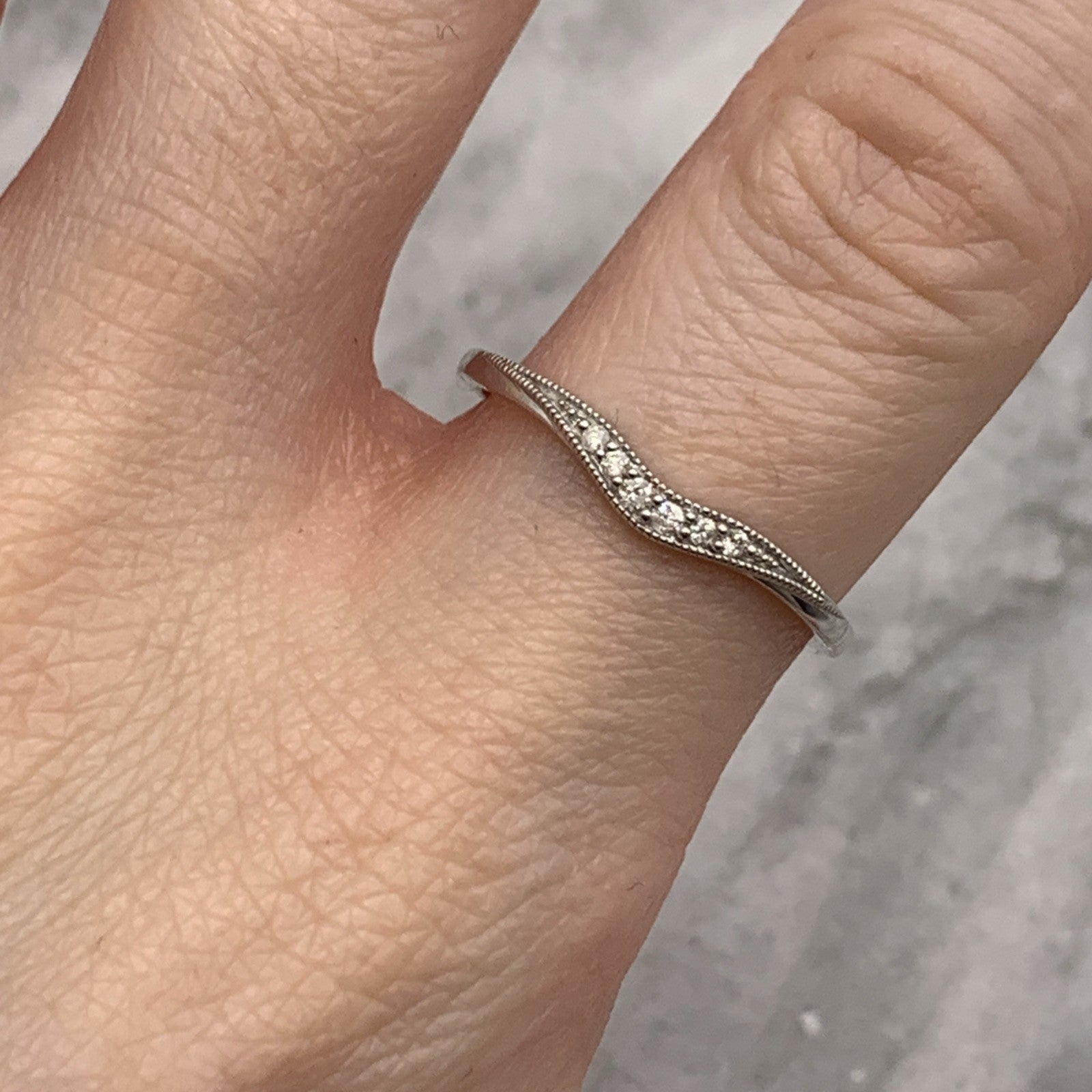 A beautiful white gold wave ring featuring petite pave set diamonds.