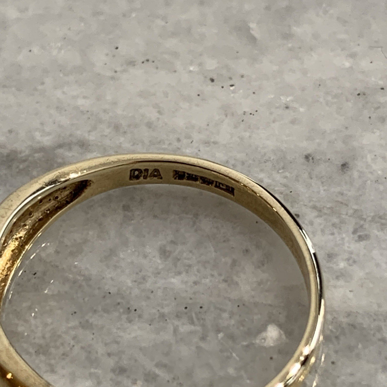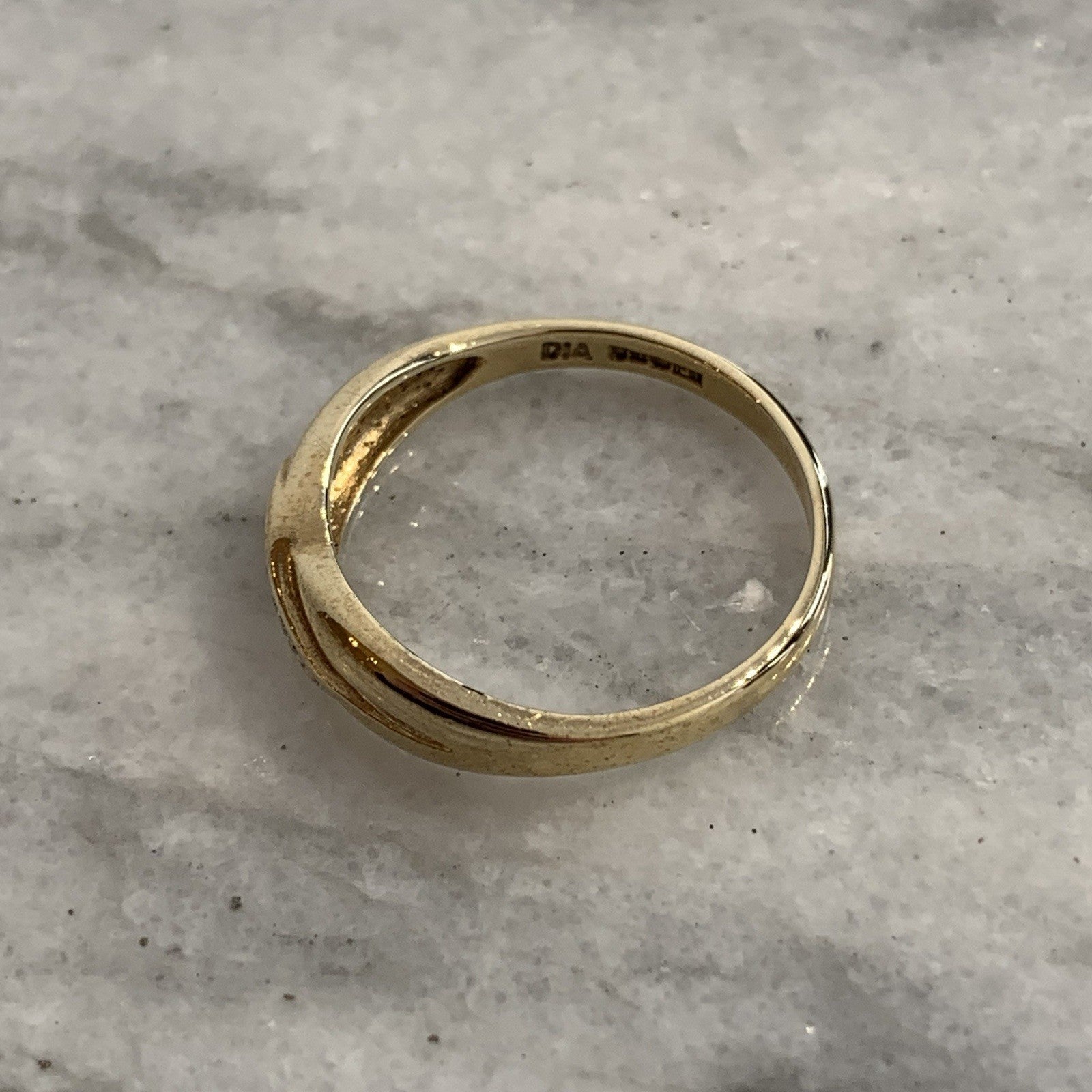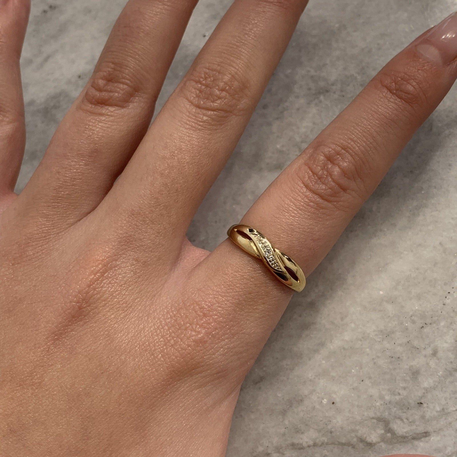 A lovely crossover twisted gold band ring featuring a petite pave set diamond. DIA stamped.