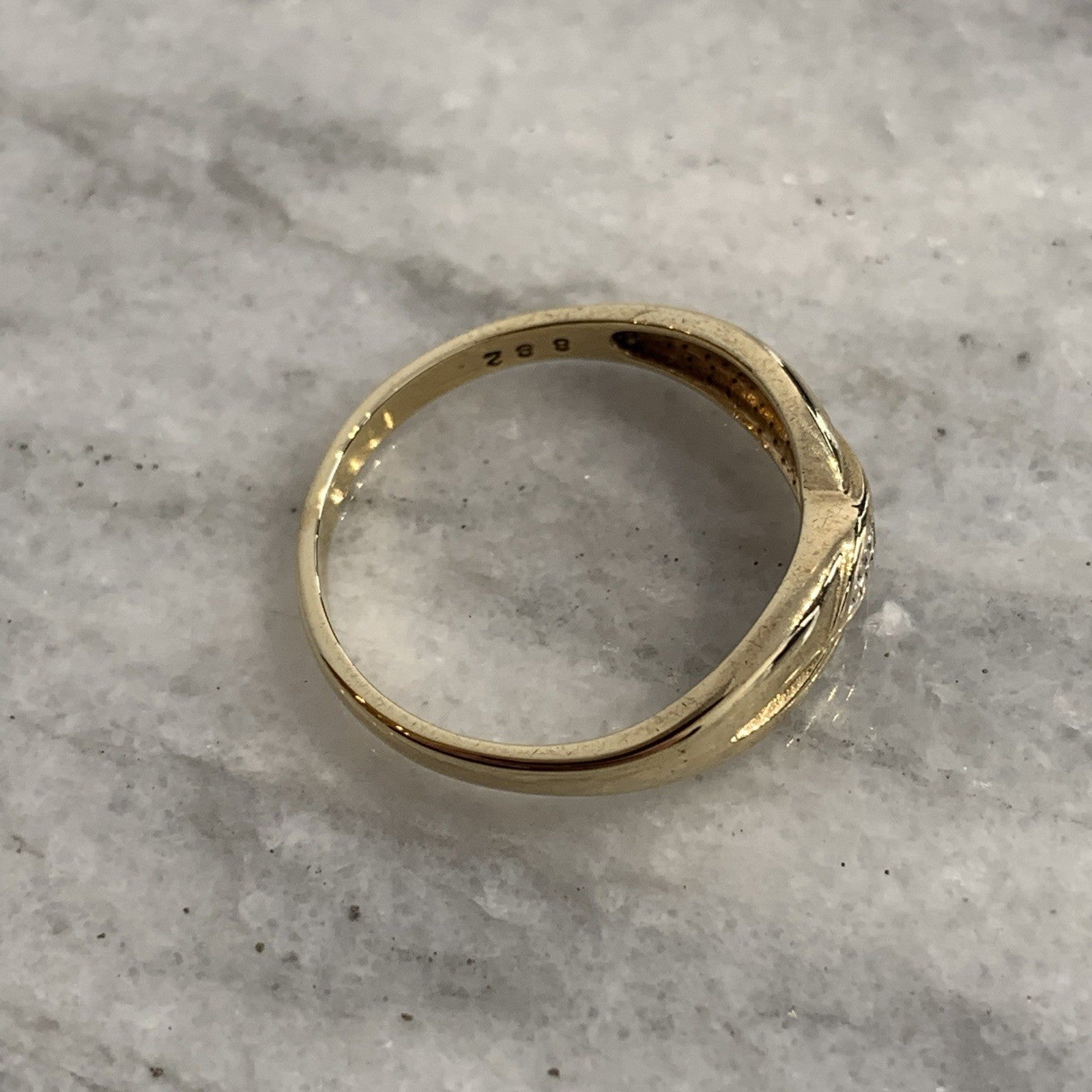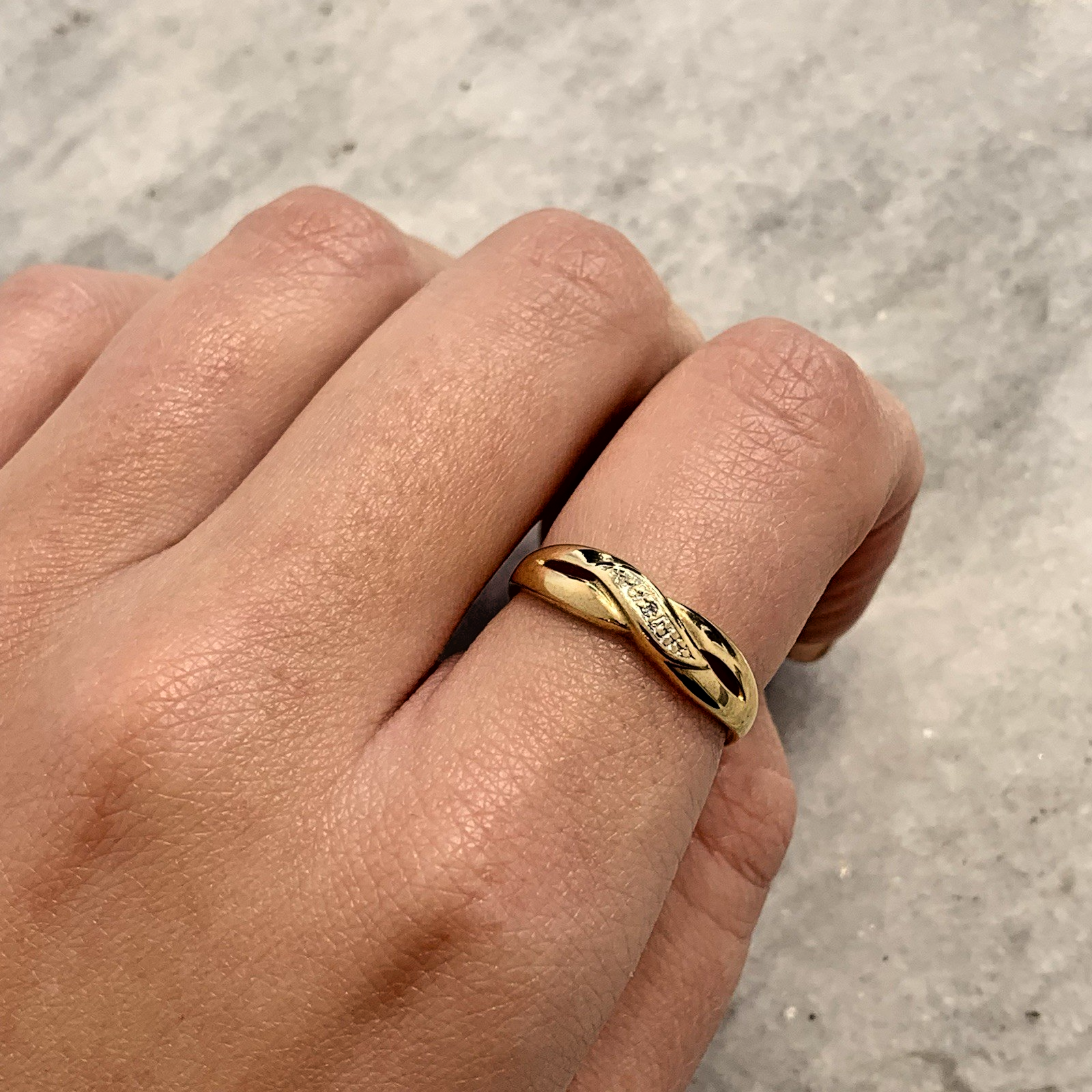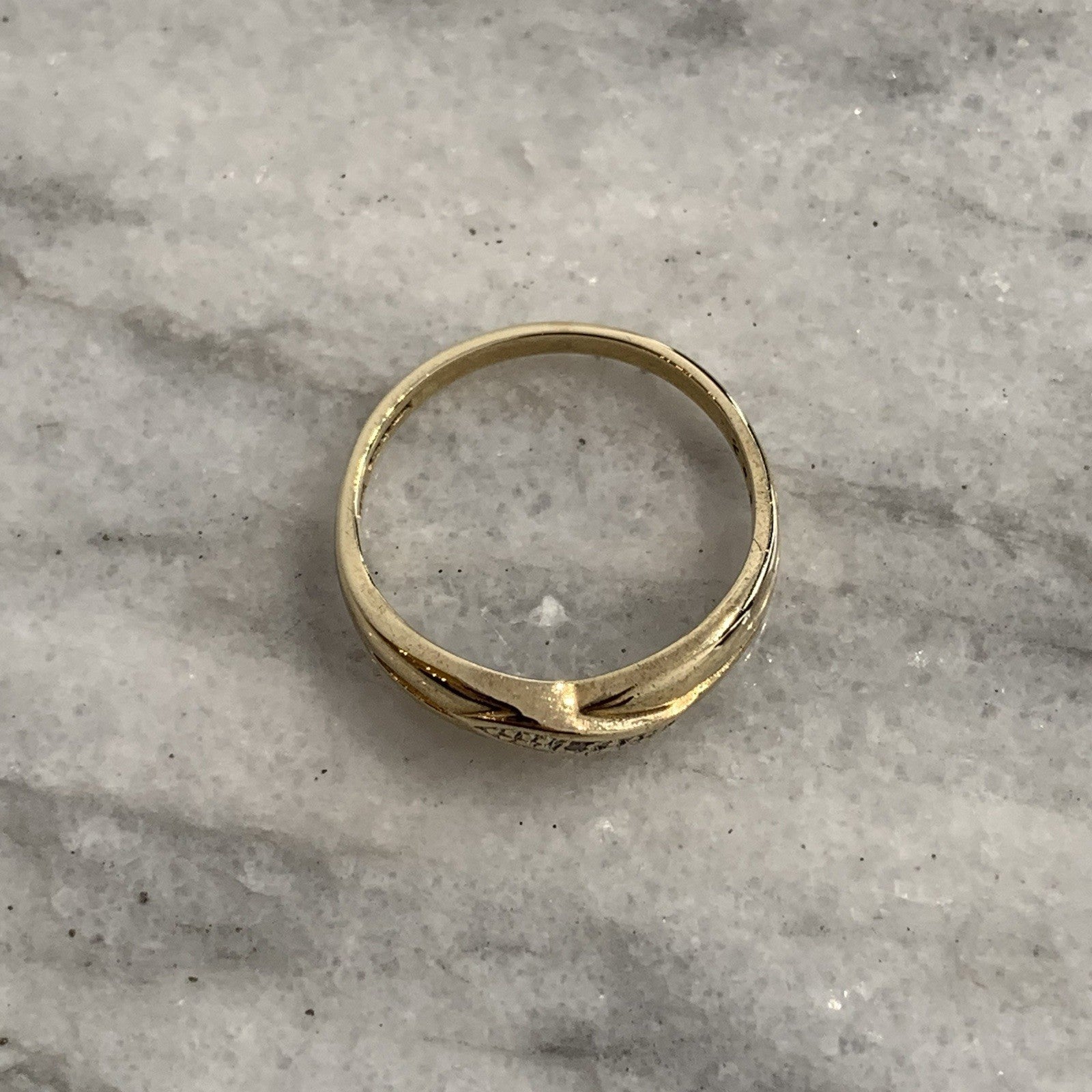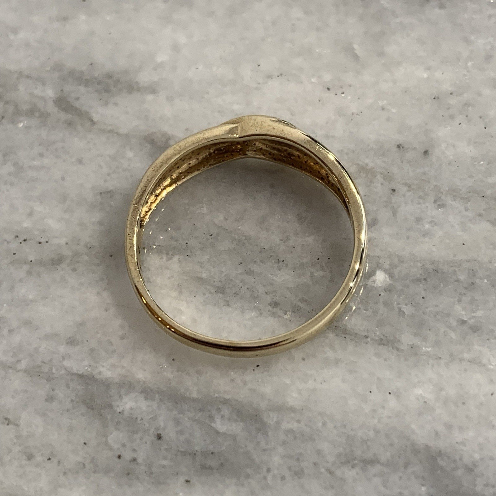 A lovely crossover twisted gold band ring featuring a petite pave set diamond. DIA stamped.