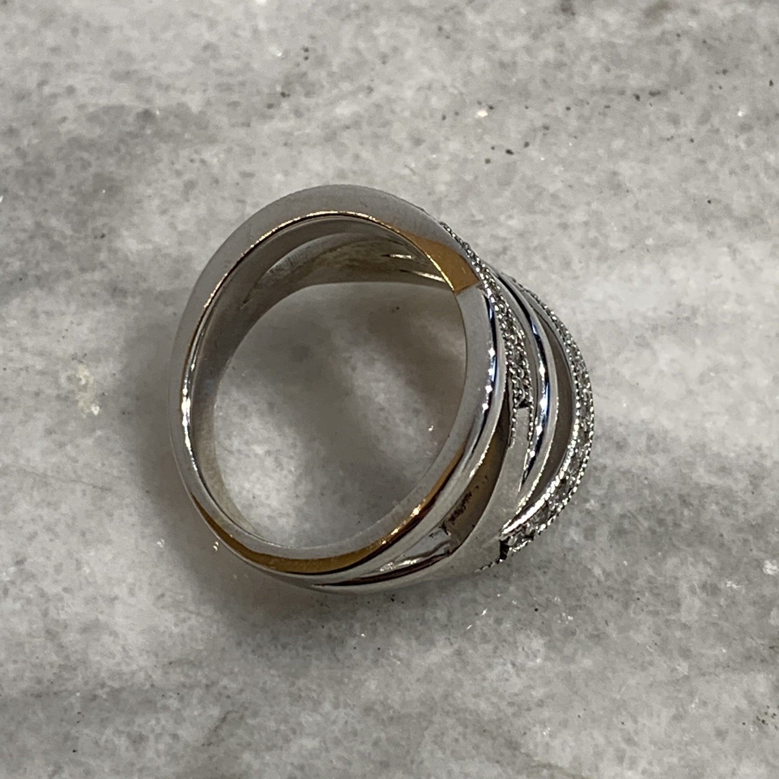 - A weighty, well made white gold ring, beautifully crafted in a multilayer, crossover style, featuring two rows of set diamonds.